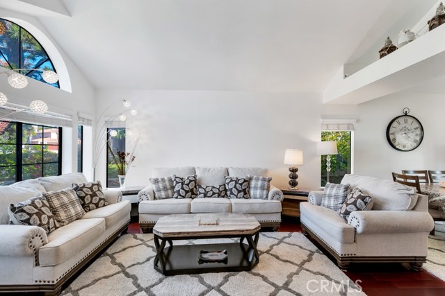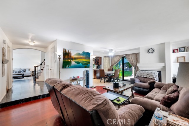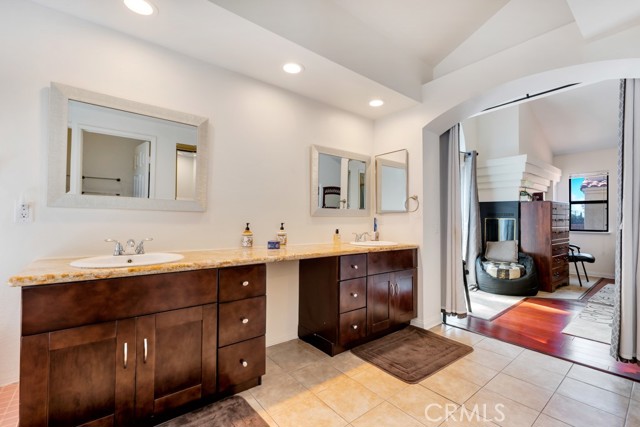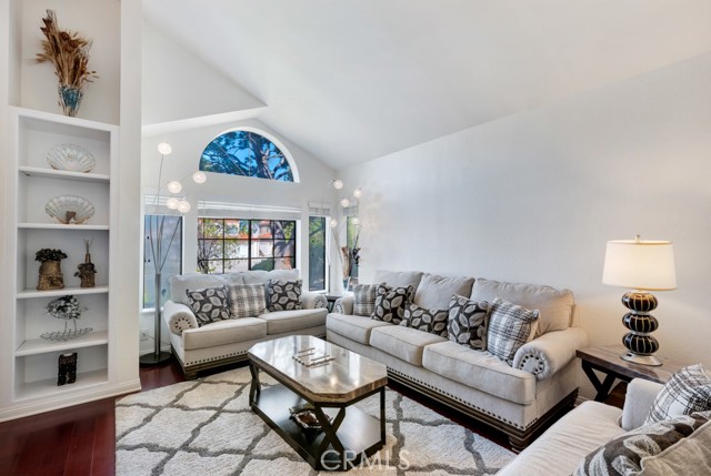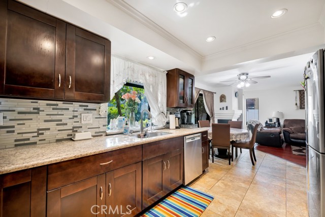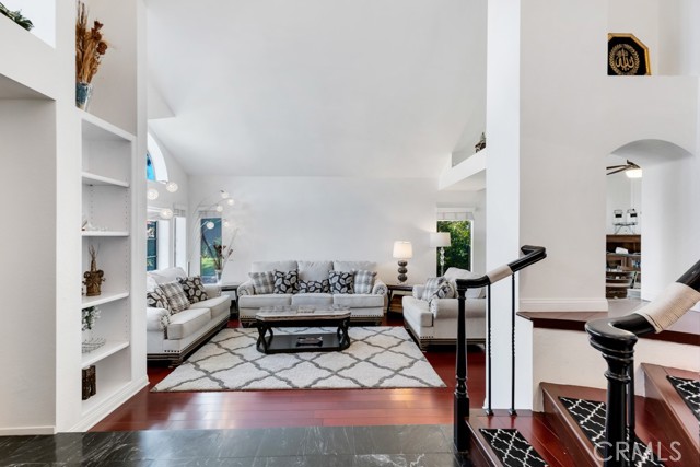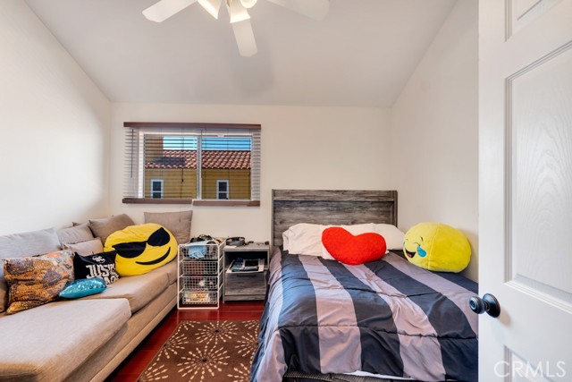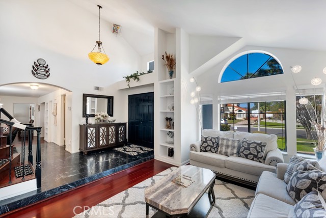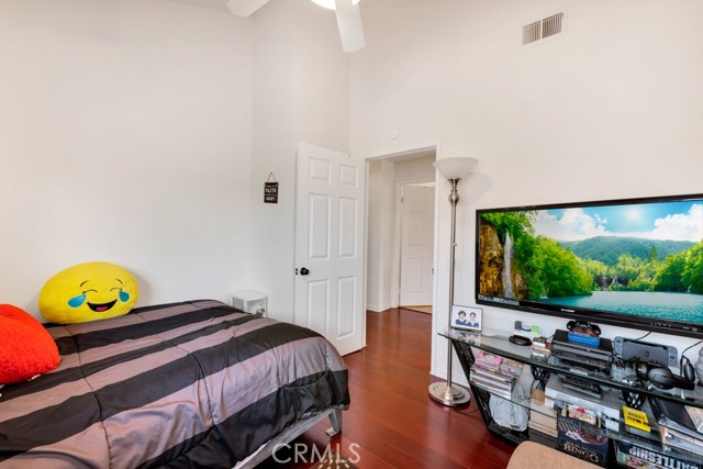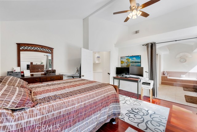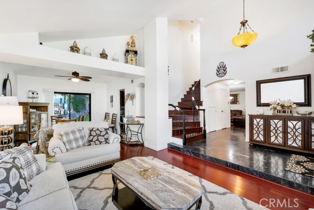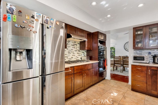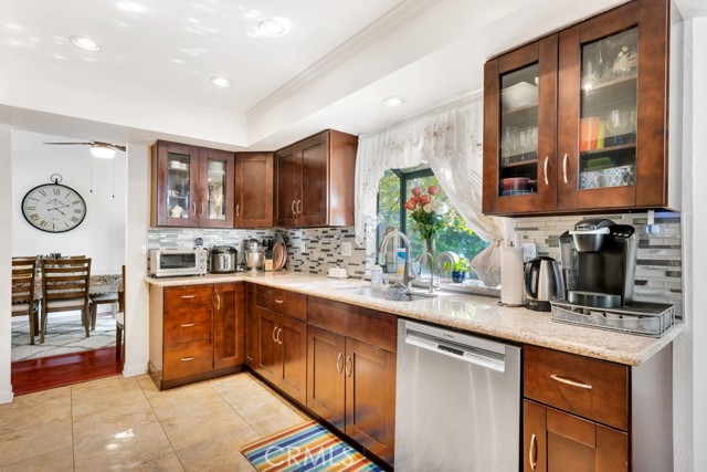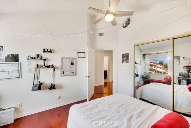 Prime South Corona Location has it all Cul-de-sac Street that is in the most desirable of areas with NO HOA. Built in the 90's with awesome curb appeal and the right floor plan, approximately 2,500 sq ft on 2 stories, Spanish clay roof with vaulted ceiling, featuring 5 bedrooms 2.5 bathrooms (1 bedroom downstairs with its own side direct access) Upstairs a true Primary Suite With French Doors To Walk-out Balcony & a large en-suite bathroom with his and hers, roman tub and a shower, a Fireplace Retreat with large walk in closets. All bedrooms and living spaces have beautiful cherry flooring. Recently remodeled gourmet kitchen is well-appointed with recessed lighting, gorgeous granite counters, designer backsplash, high end tile floors and solid wood cabinets. A good-sized pantry room also comes in handy. A formal Dinning room with a slider to back yard for entertainment. A formal living room for additional seating, and a large bright family room. Double French entry door with a foyer overlooking the circular staircase. The first floor bedroom with its own entry door offers rental or office/work possibilities, or comfortable quarters for guests and privacy seeking residents. A separate laundry room comes with a built-in shelf and a storage closet. There are 3 additional good-sized upstairs secondary bedrooms and a full hallway bathroom with double sinks. TWO fireplaces: one in the family room, another one in the Primary bedroom! A huge Private Secluded Lot full of fruit trees, singing birds, Gazebo, super relaxing on .20 acre cul de sac lot super private with lots of greenery and enough room for a pool. The 3 car garage is deep with a large driveway, Pride of ownership, newer paint and newer appliances are just a few more wonderful things this home has to offer. This home truly has it all! Near Santa Ana Regional parks, great schools, shopping, dining & entertainment in the best area of Corona, close to malls, shops and places of worship. This home qualifies for Community property loan which gives discounted mortgage rates regardless of income. Inquire for more info. This home is move-in ready!