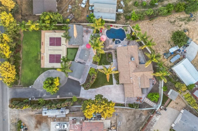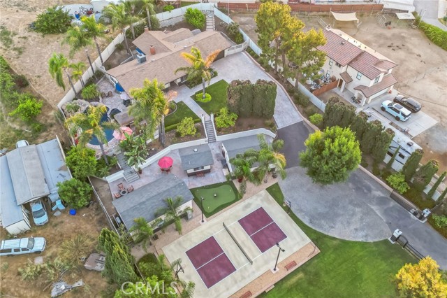 Live The Resort Lifestyle! You will love this magnificent one-of-a-kind private estate, with its meticulous landscaping, mature trees, beautiful pool, and wide variety of recreational activities. As you pass through the security gate, you will notice an expansive lawn area perfect for playing catch, cornhole, or practicing your chipping. Next you have your own pickleball court with new LED lighting installed in December 2022. It has a 6-hour timer, and the lights cover the pickleball court, lawn area, and mini golf. Other activities available include basketball, ping pong, foosball, and darts. This property is perfect for those who enjoy the outdoors and have a desire to lead a healthier and more active lifestyle. The main house has three bedrooms, two bathrooms, two fireplaces, a billiard room, and a private bar, which could be used as a fourth bedroom. The kitchen was remodeled in 2017 with new granite countertops, new flooring, re-stained cabinets, and new appliances installed in 2020. The home has a large pool deck surrounded by palm trees, BBQ island and palapa, two waterfalls, and a heated spa. The lower part of the property includes three buildings that were remodeled in 2017/2018 with new sheetrock, drywall, stucco, and paint. One of the buildings, which includes a loft, has a kitchenette, a bathroom, a dining area, and two new mini-split air conditioners installed in 2021. There is also a small multi-purpose building that could be used as an art studio, she shed, detached office, or an extra bedroom. It has a sink, countertop, and fan, and overlooks the mini golf and pickleball court. The third building is a detached garage currently being used as a game room. A new mini-split air conditioner was installed in 2019. This property has plenty of parking including room for an RV. It has had well over $300,000 worth of improvements since 2017 and it is move-in ready. It comes completely furnished including an A.E. Schmidt pool table, a Hoist weight machine, and nine flat screen TV’s. Another added benefit is the low tax rate, no mello roos, and no HOA fees! It is conveniently located near major freeways, schools, stores, shops, parks, and restaurants. This property is an entertainer's dream. Don’t miss this opportunity to turn your dream into a reality.