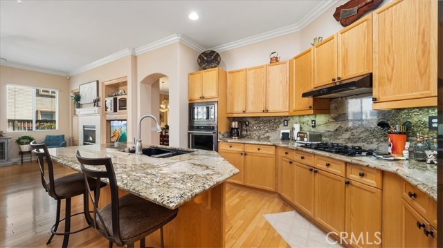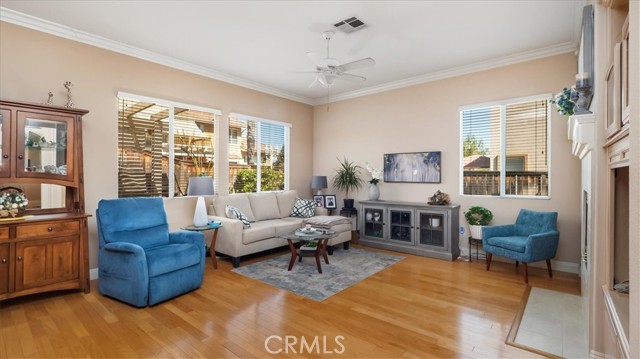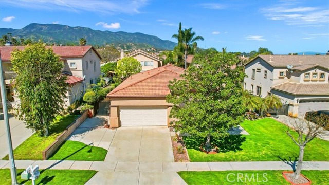 Welcome to this gorgeous home situated in a beautiful neighborhood with mountain views. This 4 bed, 3 bath home is a must-see with outstanding curb appeal. Step inside and be welcomed with tall 9-foot ceilings, large windows allowing for plenty of natural light, and gorgeous hardwood floors throughout. Crown molding adds an extra touch of elegance to the space. The spacious living room flows through an arched doorway into a family room with a cozy fireplace that's perfect for gathering around on chilly nights. The kitchen is stunningly designed with a center island that has both a sink and seating area making it ideal for entertaining or dinner prep. Beautiful wood cabinets provide ample storage space while also helping create an inviting atmosphere in the room. You'll love the graphite stainless steel appliances and the gorgeous countertops that match the backsplash! Additional features include a pantry and eating area off the kitchen with sliding glass doors leading out to the backyard. The master suite is spacious and inviting. It boasts 4 windows, a ceiling fan, a huge walk-in closet, and an attached master bath with double vanity, soaking tub, and walk in shower. Two of the additional bedrooms connect to a shared bathroom, while a fourth bedroom and guest bath complete the picture. Plus, there's a laundry room with a sink for added convenience. Step outside and be charmed by the covered back patio, which provides a great entertaining space for cookouts with friends and family, and the landscaped side yard is a great spot to relax and enjoy the sunshine! This home comes with a newer AC and a two-car garage, so you'll have plenty of room to store all your belongings! Come see this lovely home today!
