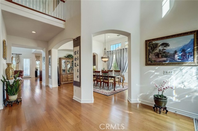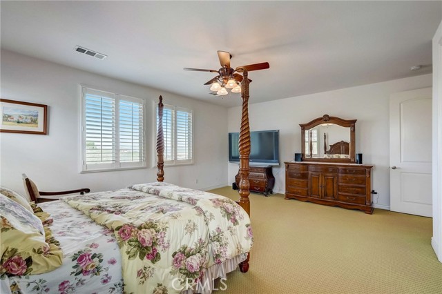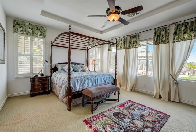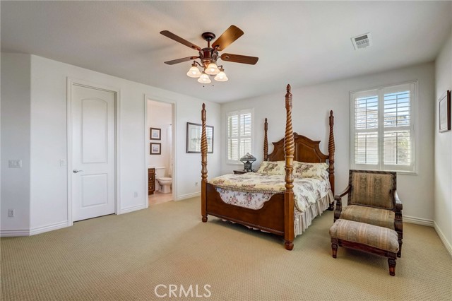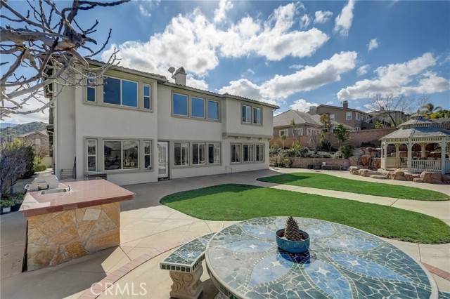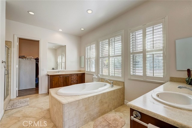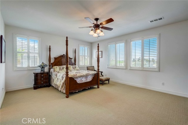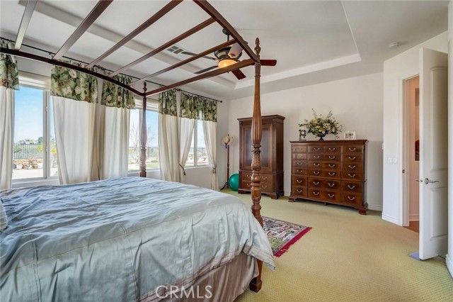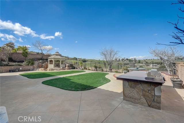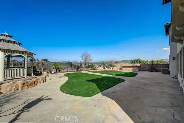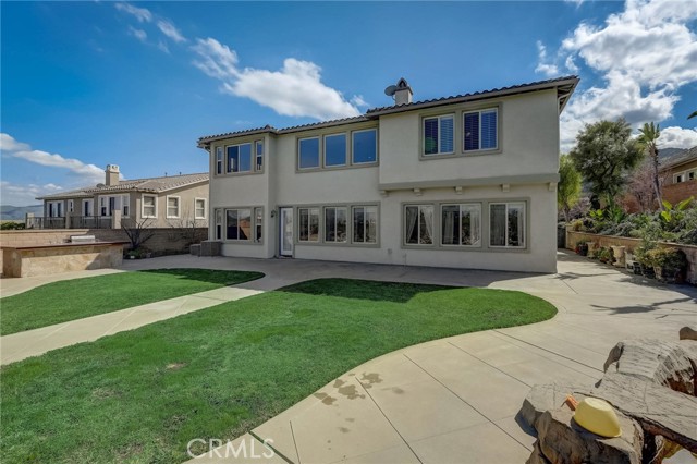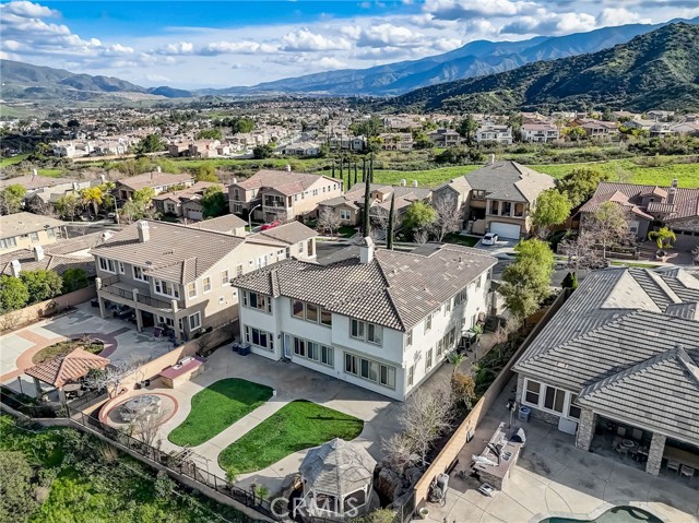 Immaculate executive home with stunning views of the snow capped mountains. Downstairs Master + 3 Master sized bedrooms, plus one guest bedroom for a total of 5 bedrooms and 4.5 bathrooms. Gated courtyard entry. Formal dining room, formal living room. Huge family room with soaring 20 foot high ceilings. Gourmet kitchen island with stainless steel appliances, including Sub Zero refrigerator. Lots of upgrades throughout the home, including: plantation shutters, custom ceilings fans, hardwood floors. Oversized backyard with lots of hardscape, a built in Gazebo surrounded by a rock fountain, a built in BBQ island, and fruit trees. Both side yards are concreted in and have room for lots of toys. 3 car garage with epoxy flooring. Located in the Retreat the Inland Empire's premiere 24-hour manned gated community.