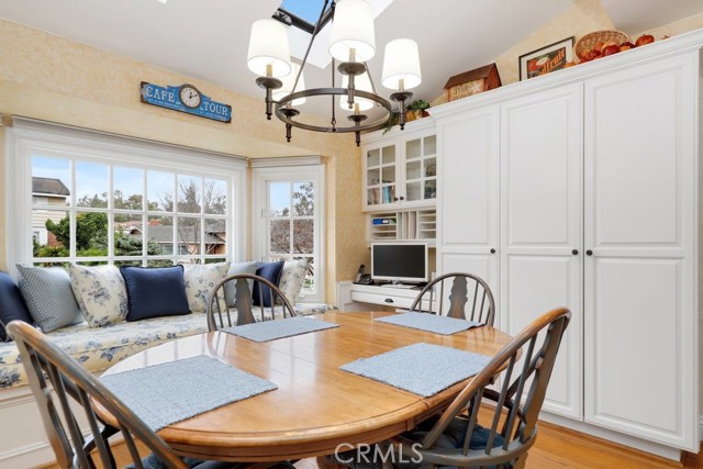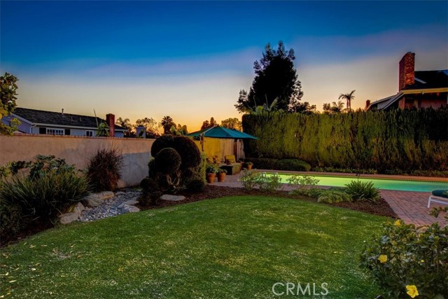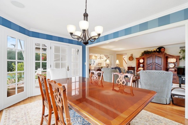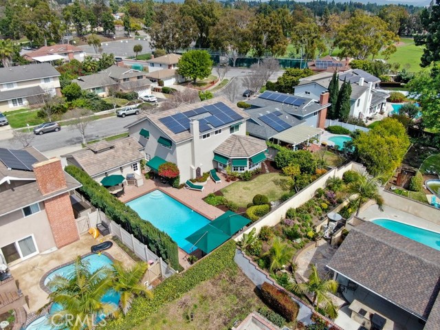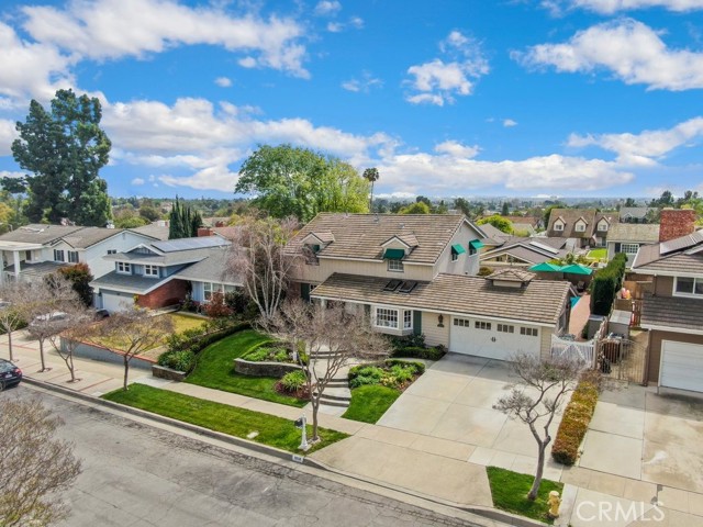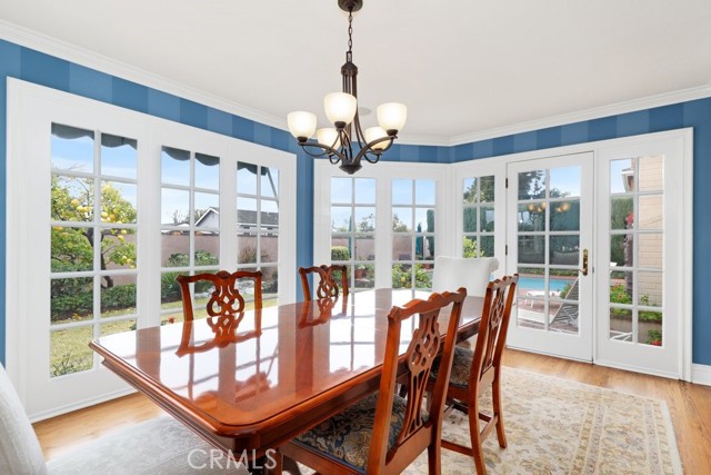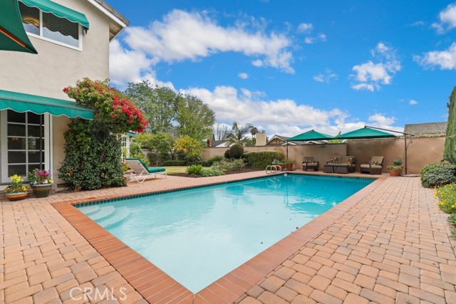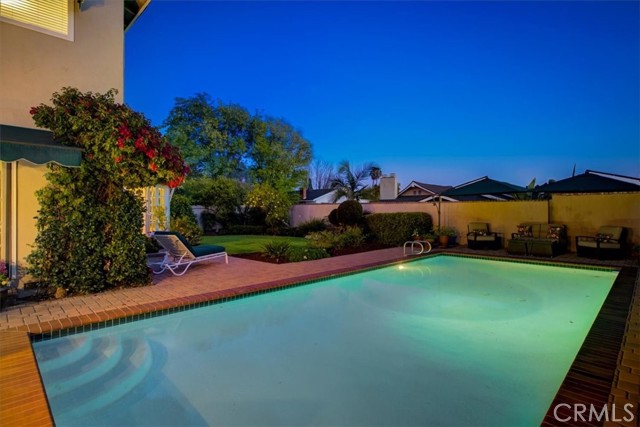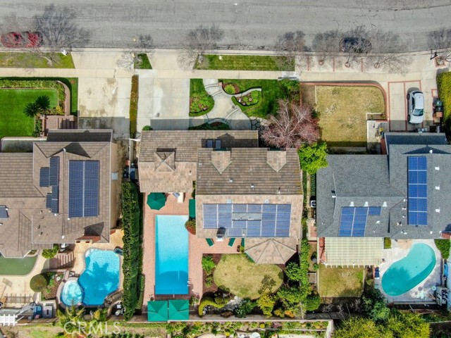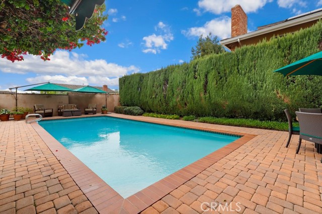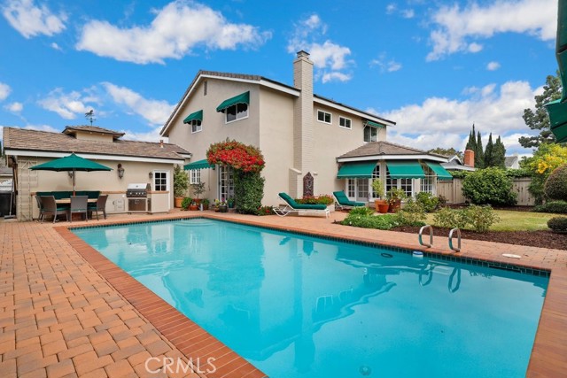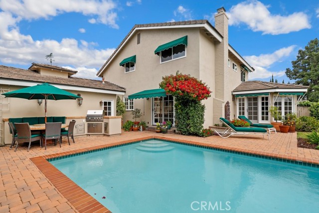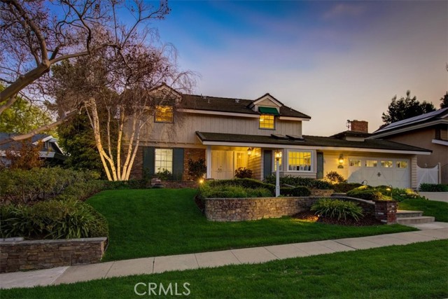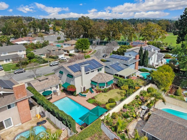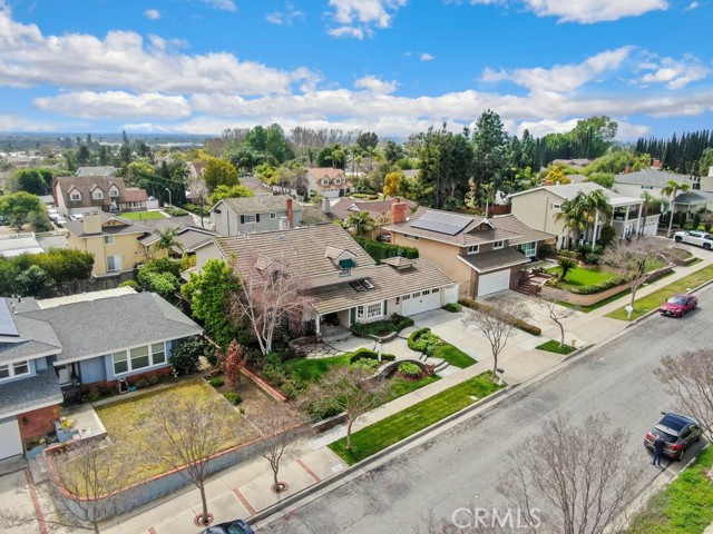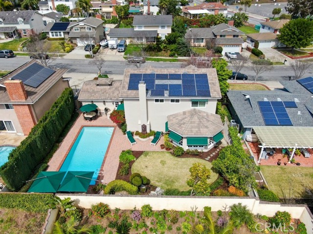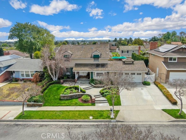 This beautiful five-bedroom home in Fullerton welcomes you, no wallpaper just custom modern neutral color tones, crown molding, larger base boards, recessed lighting, ceiling fans and gorgeous original hardwood flooring makes for an elegant space. The spacious living room features sconce lighting and detailed crown molding flows seamlessly in to the formal dining room, perfect for large gatherings and entertaining. The floor to ceiling windows allows an abundance of natural light to illuminate the open floor plan throughout. The family room boasts a gas and wood burning fireplace and French sliding door that leads to the backyard. The kitchen impresses with clean white cabinetry with plenty of counter space and storage. The stainless-steal appliances include a 5-burner gas cooktop, range hood, single oven, microwave, dishwasher and Amana refrigerator. Adjacent is a breakfast nook with bay-window bench seating, desk area, large pantry and two skylights. The downstairs bedroom and three-quarter bathroom feature furniture-style vanity with vessel sink and an upgraded glass enclosed step in shower complete the main floor. Parquet entry features wainscoting which continues up the stairs where there are the three secondary bedrooms with crown molding, blinds and two with ceiling fans. One of these rooms features a build in desk area perfect for working at home and Murphy Bed with build-in book shelving, great as a guest room too. The spacious primary ensuite features separate closets with mirror wardrobe close doors, ceiling fan and original hardwood floors. The private upgraded bathroom features dual sink vanity, glass enclosed step-in shower with floor to ceiling tile and tile flooring. Down the hallway is a full bathroom with a dual sink vanity, separate tub and shower with dividing wall for privacy. Inside laundry with shelving, includes washer & dryer. Relax in the spectacular backyard with paver open patio and decks around the large pool, new two speed pool pump and recently re-plastered, patio furniture and sun umbrellas included, built-in BBQ with storage & dining table, chairs and cushions, grass area, mature fruit trees, stucco wall and large Cypress trees for privacy. Great curb appeal with lush green grass and planters and beautiful stone trimmed step-up walk way. An oversized two-car garage with direct access, storage, cabinets, new water heater, dual zone A/C & heat unit, dual pane windows and a list of multiple upgrades. SOLAR PAID. Welcome home!