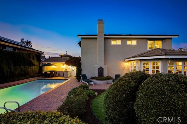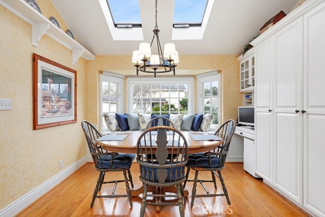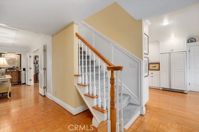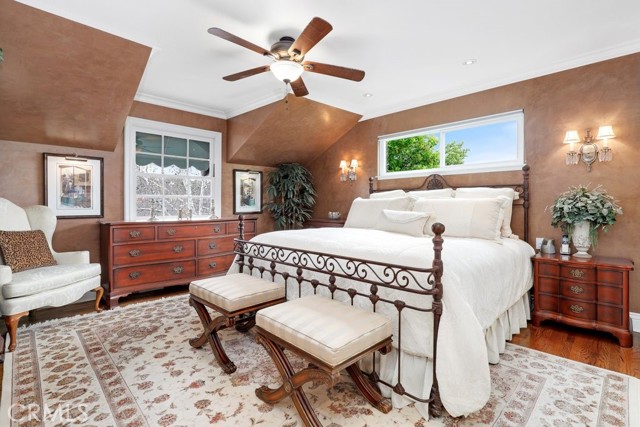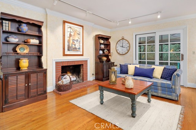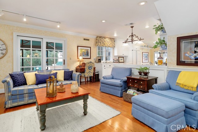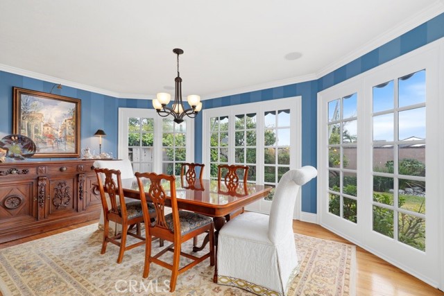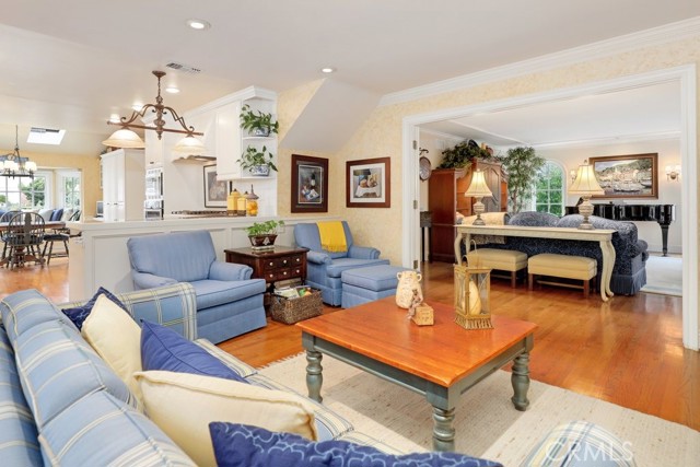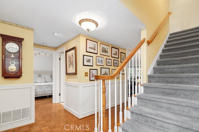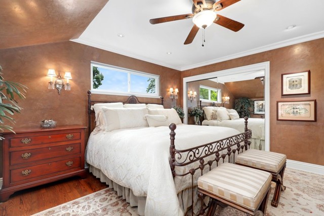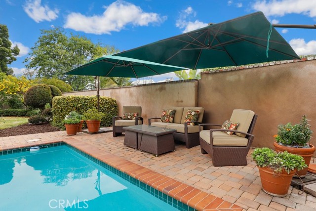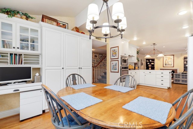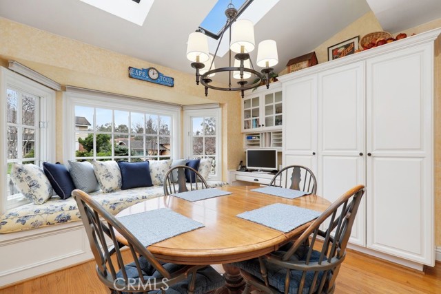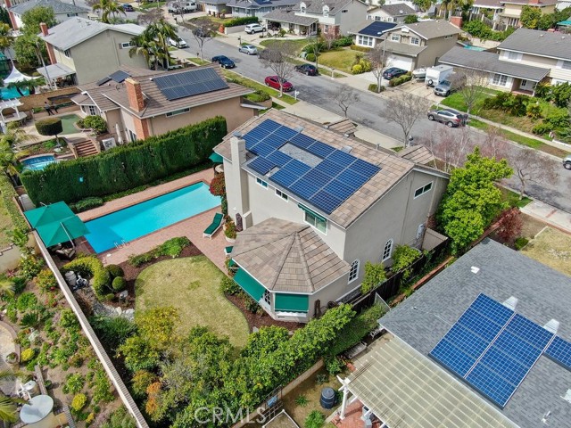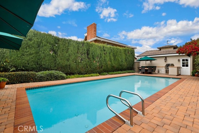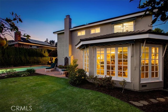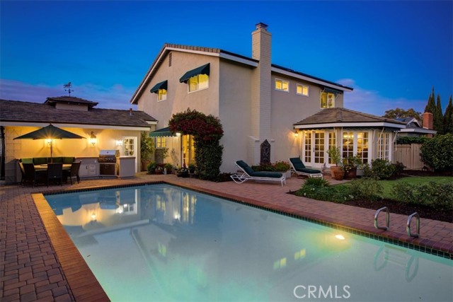 This beautiful five-bedroom home in Fullerton welcomes you, no wallpaper just custom modern neutral color tones, crown molding, larger base boards, recessed lighting, ceiling fans and gorgeous original hardwood flooring makes for an elegant space. The spacious living room features sconce lighting and detailed crown molding flows seamlessly in to the formal dining room, perfect for large gatherings and entertaining. The floor to ceiling windows allows an abundance of natural light to illuminate the open floor plan throughout. The family room boasts a gas and wood burning fireplace and French sliding door that leads to the backyard. The kitchen impresses with clean white cabinetry with plenty of counter space and storage. The stainless-steal appliances include a 5-burner gas cooktop, range hood, single oven, microwave, dishwasher and Amana refrigerator. Adjacent is a breakfast nook with bay-window bench seating, desk area, large pantry and two skylights. The downstairs bedroom and three-quarter bathroom feature furniture-style vanity with vessel sink and an upgraded glass enclosed step in shower complete the main floor. Parquet entry features wainscoting which continues up the stairs where there are the three secondary bedrooms with crown molding, blinds and two with ceiling fans. One of these rooms features a build in desk area perfect for working at home and Murphy Bed with build-in book shelving, great as a guest room too. The spacious primary ensuite features separate closets with mirror wardrobe close doors, ceiling fan and original hardwood floors. The private upgraded bathroom features dual sink vanity, glass enclosed step-in shower with floor to ceiling tile and tile flooring. Down the hallway is a full bathroom with a dual sink vanity, separate tub and shower with dividing wall for privacy. Inside laundry with shelving, includes washer & dryer. Relax in the spectacular backyard with paver open patio and decks around the large pool, new two speed pool pump and recently re-plastered, patio furniture and sun umbrellas included, built-in BBQ with storage & dining table, chairs and cushions, grass area, mature fruit trees, stucco wall and large Cypress trees for privacy. Great curb appeal with lush green grass and planters and beautiful stone trimmed step-up walk way. An oversized two-car garage with direct access, storage, cabinets, new water heater, dual zone A/C & heat unit, dual pane windows and a list of multiple upgrades. SOLAR PAID. Welcome home!