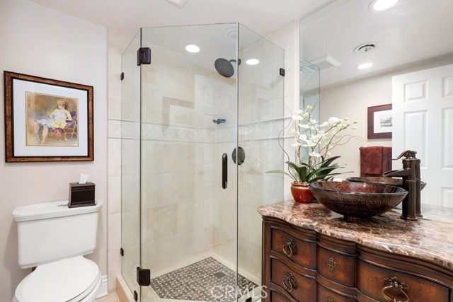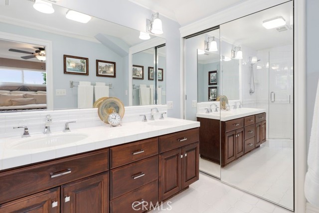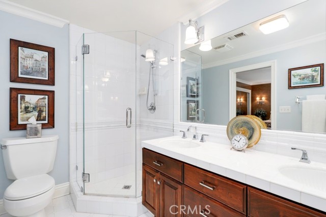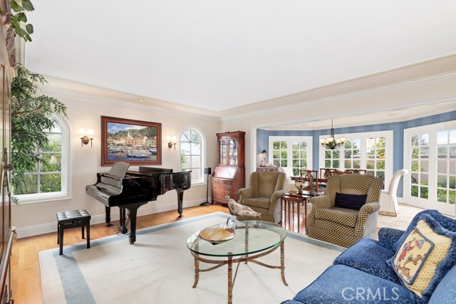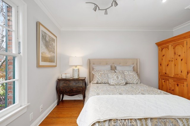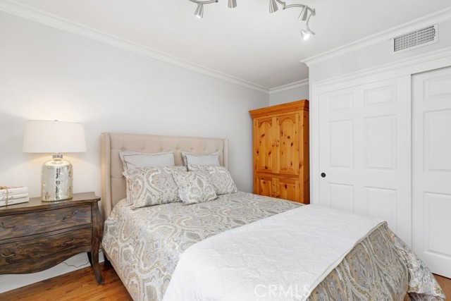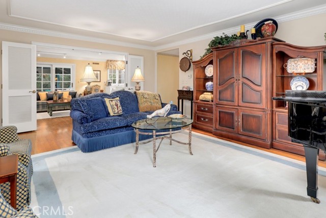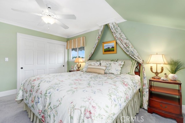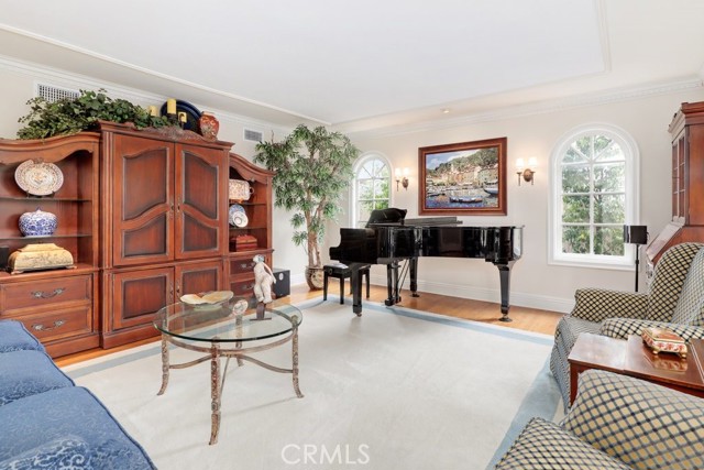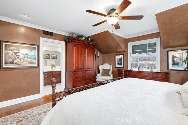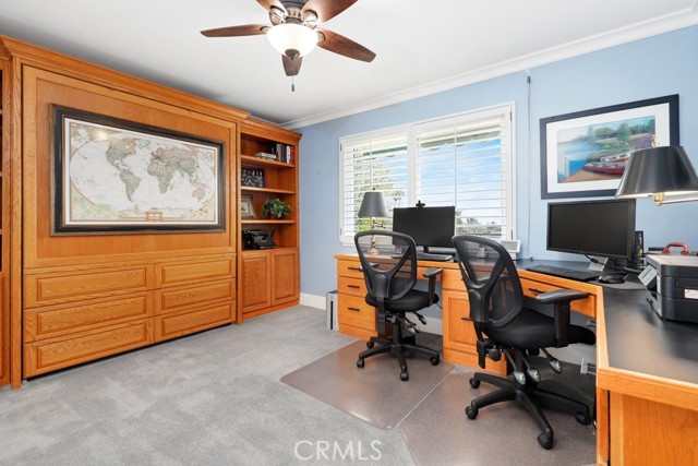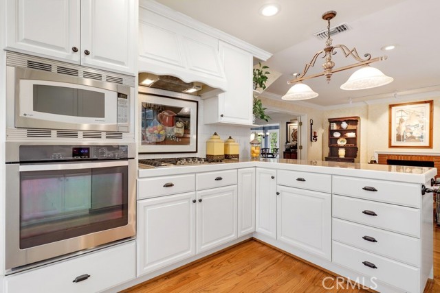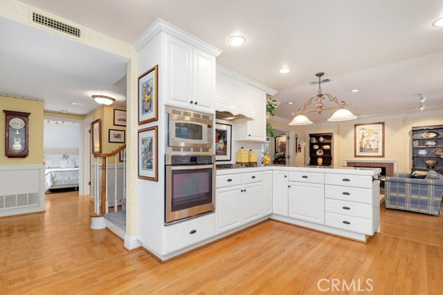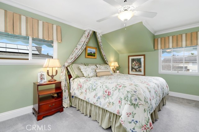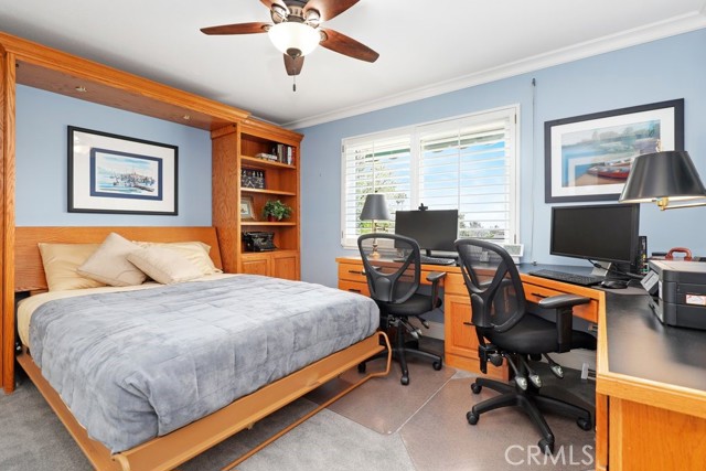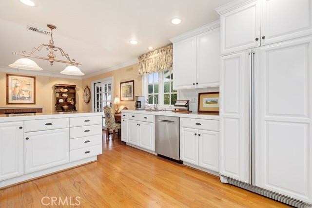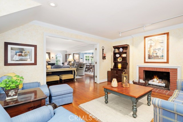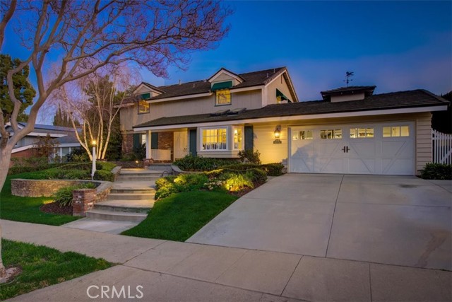 This beautiful five-bedroom home in Fullerton welcomes you, no wallpaper just custom modern neutral color tones, crown molding, larger base boards, recessed lighting, ceiling fans and gorgeous original hardwood flooring makes for an elegant space. The spacious living room features sconce lighting and detailed crown molding flows seamlessly in to the formal dining room, perfect for large gatherings and entertaining. The floor to ceiling windows allows an abundance of natural light to illuminate the open floor plan throughout. The family room boasts a gas and wood burning fireplace and French sliding door that leads to the backyard. The kitchen impresses with clean white cabinetry with plenty of counter space and storage. The stainless-steal appliances include a 5-burner gas cooktop, range hood, single oven, microwave, dishwasher and Amana refrigerator. Adjacent is a breakfast nook with bay-window bench seating, desk area, large pantry and two skylights. The downstairs bedroom and three-quarter bathroom feature furniture-style vanity with vessel sink and an upgraded glass enclosed step in shower complete the main floor. Parquet entry features wainscoting which continues up the stairs where there are the three secondary bedrooms with crown molding, blinds and two with ceiling fans. One of these rooms features a build in desk area perfect for working at home and Murphy Bed with build-in book shelving, great as a guest room too. The spacious primary ensuite features separate closets with mirror wardrobe close doors, ceiling fan and original hardwood floors. The private upgraded bathroom features dual sink vanity, glass enclosed step-in shower with floor to ceiling tile and tile flooring. Down the hallway is a full bathroom with a dual sink vanity, separate tub and shower with dividing wall for privacy. Inside laundry with shelving, includes washer & dryer. Relax in the spectacular backyard with paver open patio and decks around the large pool, new two speed pool pump and recently re-plastered, patio furniture and sun umbrellas included, built-in BBQ with storage & dining table, chairs and cushions, grass area, mature fruit trees, stucco wall and large Cypress trees for privacy. Great curb appeal with lush green grass and planters and beautiful stone trimmed step-up walk way. An oversized two-car garage with direct access, storage, cabinets, new water heater, dual zone A/C & heat unit, dual pane windows and a list of multiple upgrades. SOLAR PAID. Welcome home!
