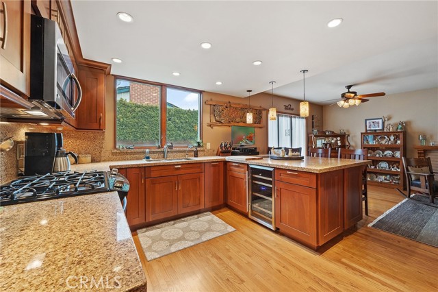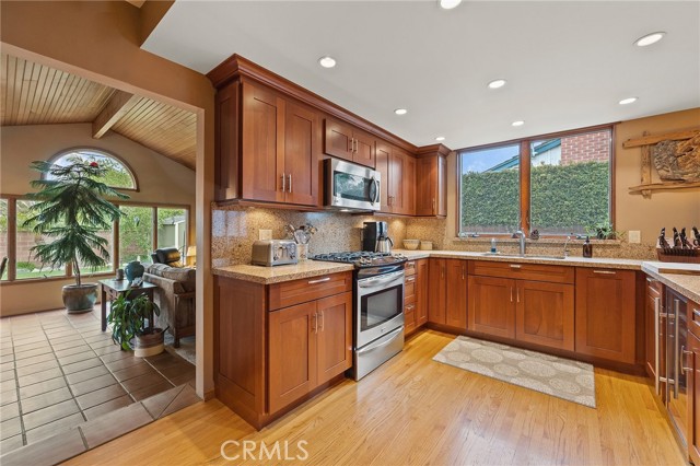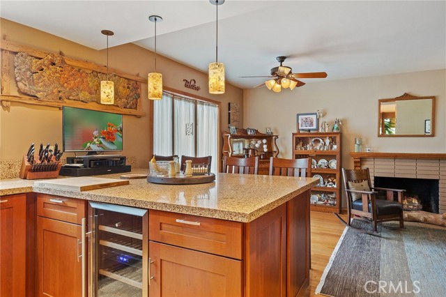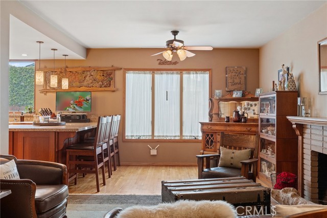 Beautiful single-story home, exquisitely cared for and updated with design top of mind. This 3 bedroom, 2 bath home offers an open floor plan with remodeled kitchen, cherry cabinetry, under counter lighting, recessed lighting, convection oven, gas cooktop, wine refrigerator, pull-out drawers, soft close feature, pendent lighting, huge quartz countertop for food prep on one side and eating space with bar stools for guests on the other. The addition off the back is an oversized living space with cedar wood vaulted ceiling, gorgeous custom fireplace, space for entertaining your guests with a large dining table & views to the lush backyard with access to a covered relaxing patio. If you like natural light, there is plenty of glass to enjoy nature right outside. 3 good sized bedrooms and main bedroom has an en-suite bathroom which has been updated as well as a hall bath also updated. Windows are double paned glass with exception of the front window staying with the style of the home, also redone. This comfortable home offers A/C, forced air heating, reverse osmosis, gas water heater, water softener, roof approximately 10 years old with 30-year warranty, sprinklers front & back for garden and grassy lawns. This is a must see, you feel welcome as soon as you enter with a front porch greeting you to come in and enjoy!