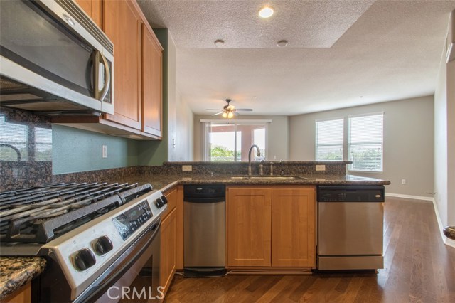 Welcome and Embrace Metropolitan Living in Central Orange County. Good condition, great value and convenient location is realized in this Move-in ready Condominium. This corner unit allows you to enjoy city light views and the colorful Disneyland fireworks. It's highly desired floor plan offers a functional-spaced kitchen with a center island that lends additional work space or table for quick everyday meals. Stainless steel appliances complements the kitchen's thermafoil cabinetry. Clean lines neatly separate all other spaces for comfort and easy decorating. 2 additional secondary bedrooms are spotless with full-sized closet space. Kitchen and bathroom countertops are in uniform granite. Both bathrooms are fitted with shower over tub for a restful and relaxing retreat. The inside laundry can accommodate a side-by-side washer and dryer, tucked away in a separate closet. The interconnected living and dining area extends to a covered balcony for outdoor seating. Wood flooring combined with carpeting, refreshed walls, an inside laundry and a recently installed Heating and Airconditioning System, ensures a comfortable accommodation. Stepping out to the common courtyard, is a Zen-inspired garden, with towering bamboos and spherical water fountains. The outstanding community amenities features a sparkling pool & spa, BBQ area, fire pit, a clubhouse with a full service kitchen and a fully outfitted fitness room that's regularly maintained and sanitized. Right around the community's corner is a park for dog walking. The monthly HOA pays for trash, water and gas. The unit comes with 3 assigned parking spaces and a storage cage to secure seasonal or occasional bulky items. Top this with ideal Orange County location, with easy access to major freeways, dining, shopping, entertainment and employment. Discover the vitality and convenience of City Living!