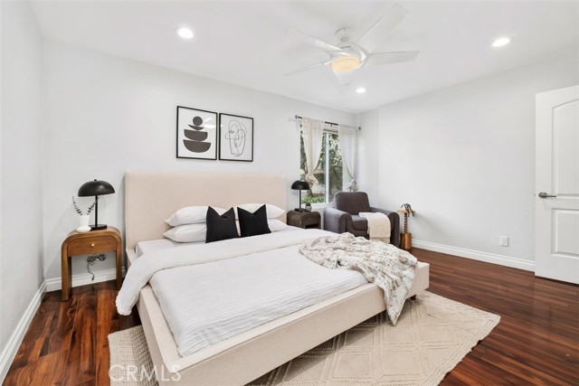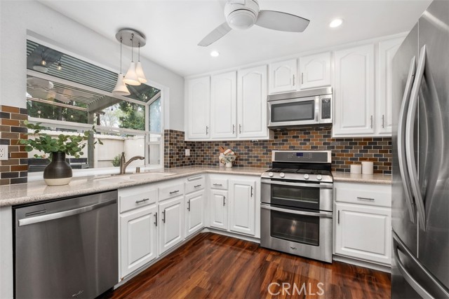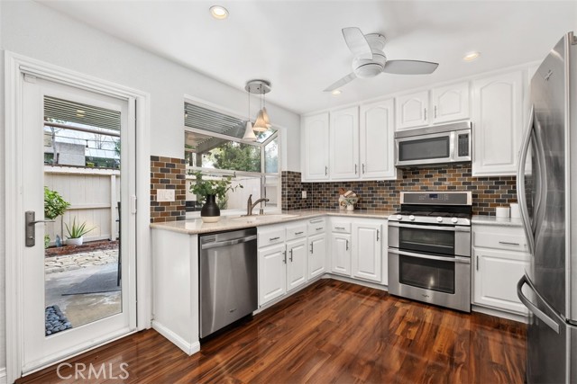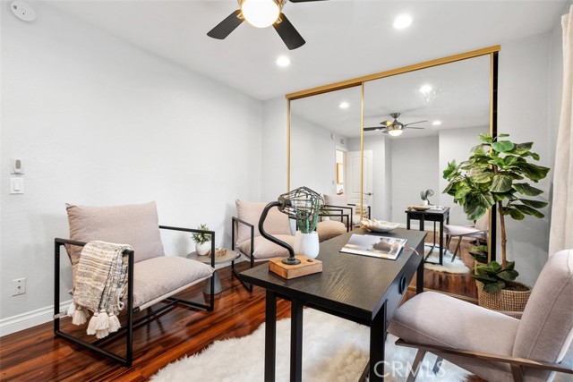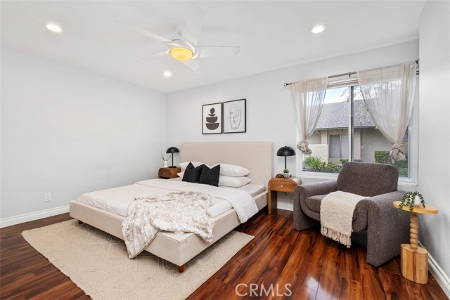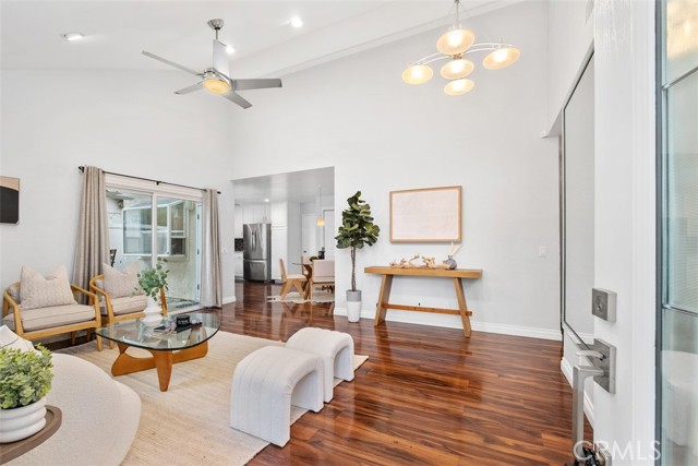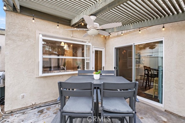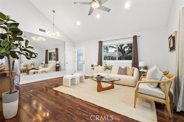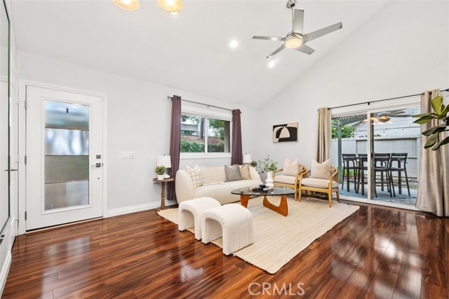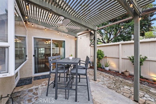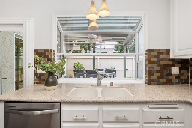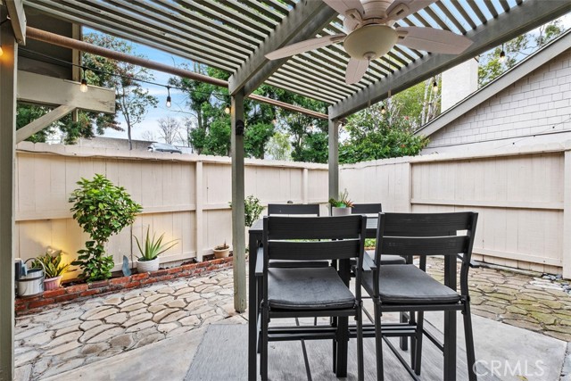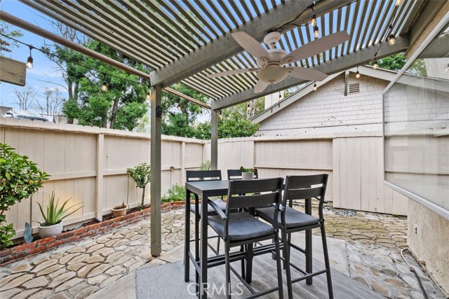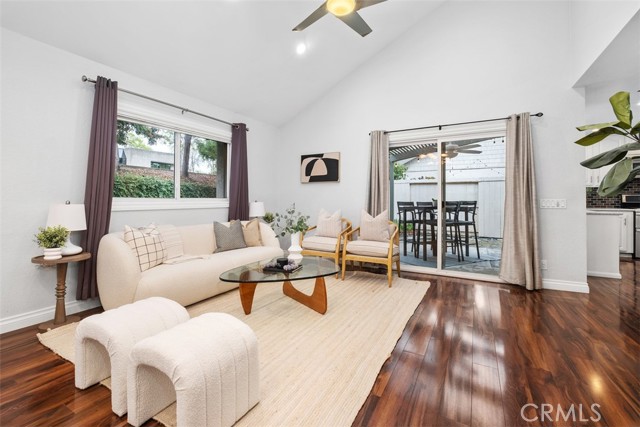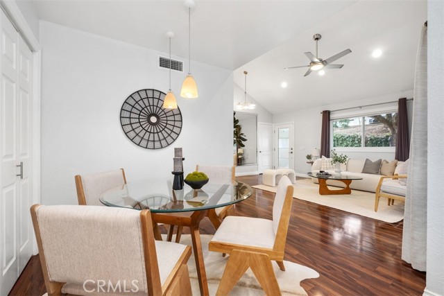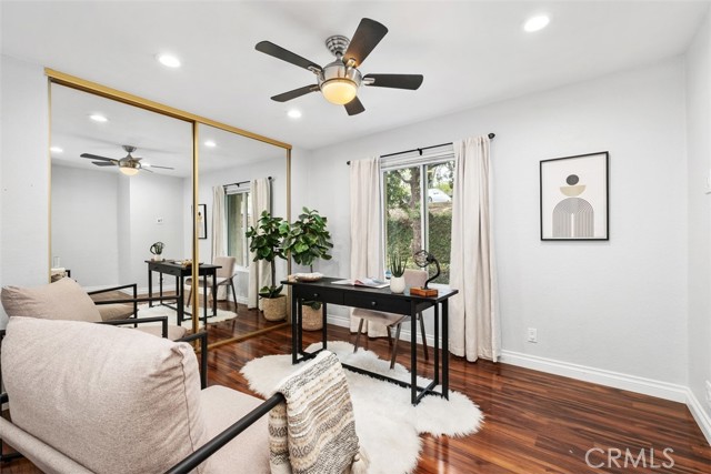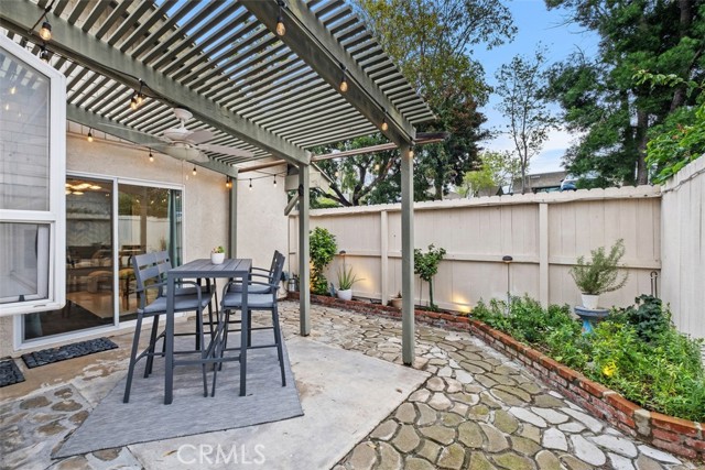 Welcome to your private getaway tucked in the back of the community. You will notice private greenbelt walkway and park access on your way to the front door. As you open the glass entry door, the feeling of the light and bright space washes over you. The high ceiling with recessed lights feel like you just walked into a suburban home. The open main living space provides direct access to the updated kitchen with eat-in dining. A large garden window overlooking the patio provides a wonderful view of your private and low maintenance outdoor patio. Enjoy this exterior space with the covered patio and sunshades for own outdoor dining or relaxing escape. On your way to the bedrooms you will pass a versatile space suitable for an office or guest room. The main bedroom is secluded from the rest of the space with a private bathroom and walk-in closet including a custom organization system. The second full bathroom is also updated and allows for private yet convenient access. The updated heating and cooling system with high efficiency filter ensures a clean and comfort atmosphere year-round. Your own interior laundry and multiple storage spaces provide for more options than expected in a home of this size. From the kitchen you have direct two-car garage access with epoxy floor and custom storage system. Enjoy a sense of security as you drive right up and into your garage. Take advantage of this smaller community's multiple relaxing amenities including pool, spa, and relaxing creek home to turtles and koi fish. Only one unit stands between you and one of Laguna Hills hidden city parks. The beautifully maintained Veeh Ranch Park provides additional green space and a relaxing atmosphere adjacent to the community while far enough to maintain the privacy of your home.