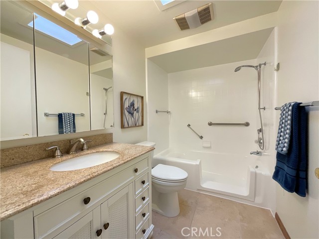 Welcome to this wonderful home boasting THREE BEDROOMS, TWO BATHS, newer CENTRAL AIR, PRIVATE LAUNDRY, and no one above or below! Enjoy Travertine and laminate flooring, wood plantation shutters on the windows, recessed lighting in the living room and addition, skylights in the added bedroom and both bathrooms, and ceiling fans in all three bedrooms. Take in views of the large greenbelt off the added room with big windows to let in plenty of light. Additionally, appreciate the walk-in tub in one bathroom and a shower in the other. This is an expanded Madrid model, recently painted with an approximate total of 1,300 square feet of living space. Discover Orange County's premier 24 hour guard gated 55+ active living community of Laguna Woods, boasting 27-hole championship golf courses, a 9-hole executive par 3 course, tennis, pickleball, lawn bowling, two fitness centers, seven clubhouses, five swimming pools, an equestrian center, gardening opportunities, art studio, world-class wood shop, over 200 clubs and organizations, free bus transportation around the community and nearby shopping and bus trips, and an economical RV storage area. We are approximately six miles from world-class Laguna Beach! HOA dues includes: water, trash, basic cable, landscaping, and exterior building maintenance. Come see it for yourself, you'll be glad you did! The carport is Structure #143 Space #4.