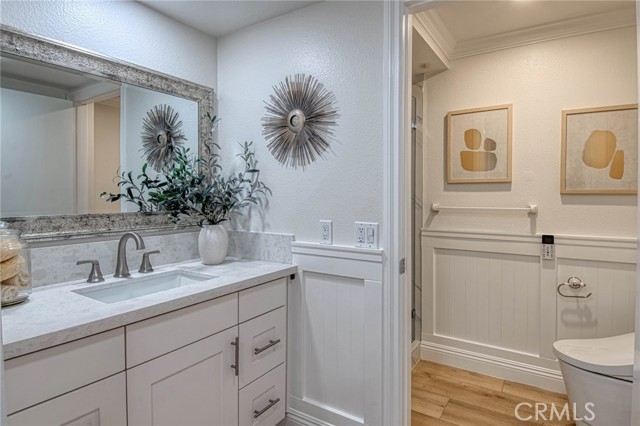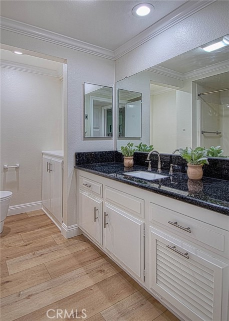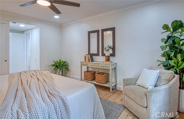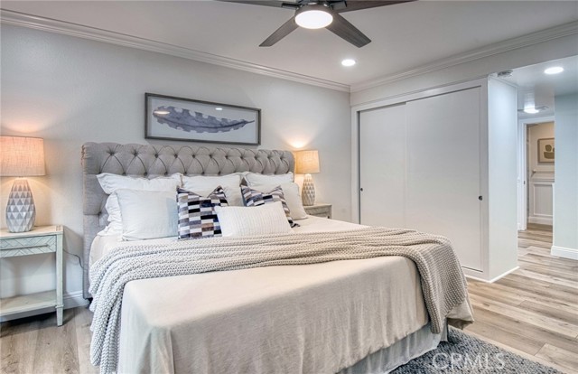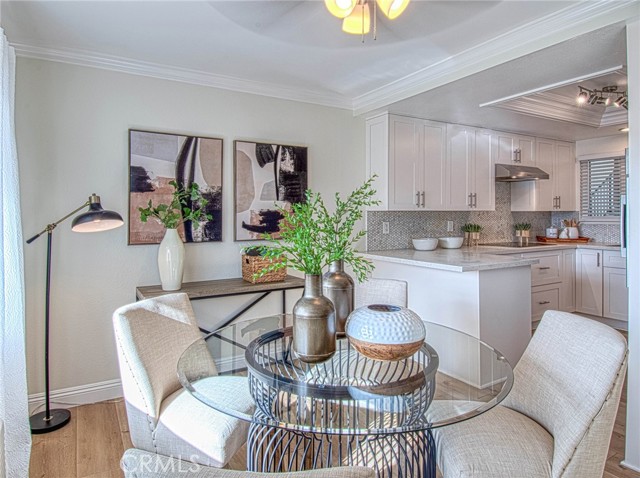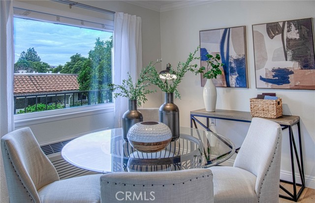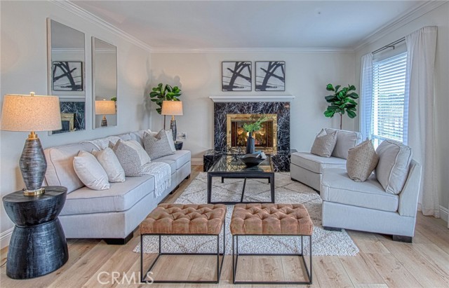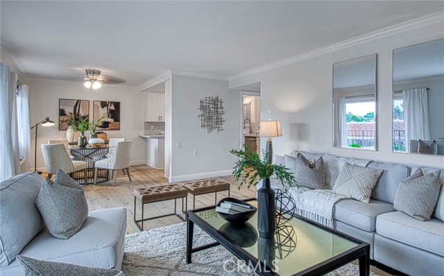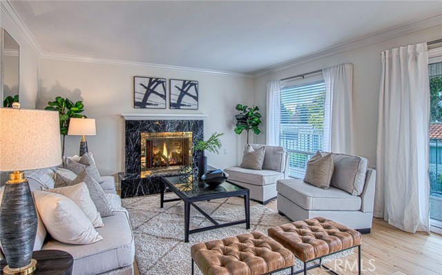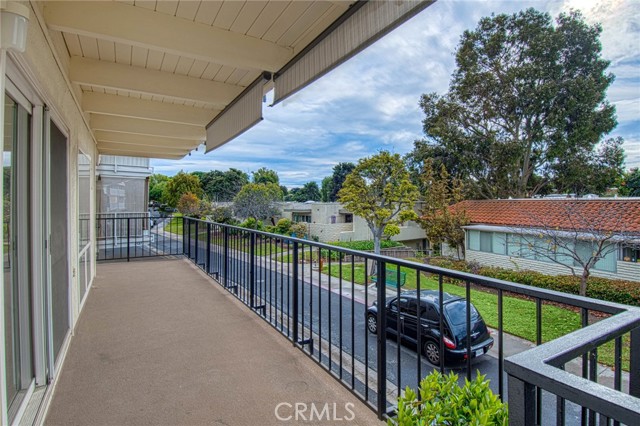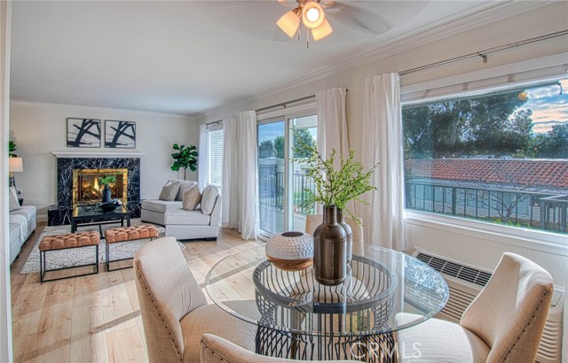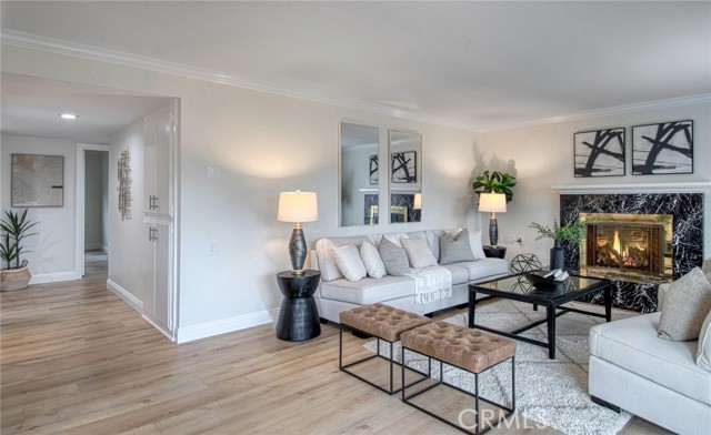 RE MODELED-Beautiful Castilla Model, Two Bedroom Two Bathroom Condo in Picturesque Laguna Woods (55+over Community). includes cozy wood burning, fireplace covered in marble, wainscoting in master bathroom area, double pane windows throughout, double pane slider to very long balcony off living room, inviting paint colors, wood floors, quartz counter tops in Kitchen and primary bathroom, recessed lighting, crown molding in canned lighting, mouldings on all doorways, dining, living and bedrooms. Full size washer and dryer in the unit. #17 Carport includes storage cabinet. Laguna Woods is a guard gated community with many amenities, over 200 clubs, activities available ranging from golf, tennis, a plethora of classes, sports, fitness & more. Facilities include Clubhouses, Laguna Woods Performing Arts Center, History Center, Village Library, Garden Center, Community Center, etc., visit Laguna Woods website to learn more. Homes is located on the second floor and does require one to walk down stairs to get to the front door of the unit. Laguna Woods only requires an ID to enter gates for Open houses.