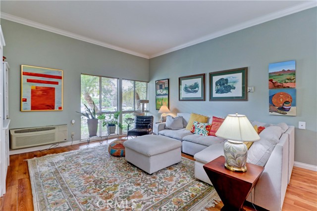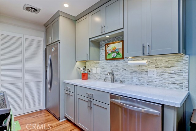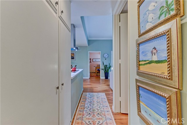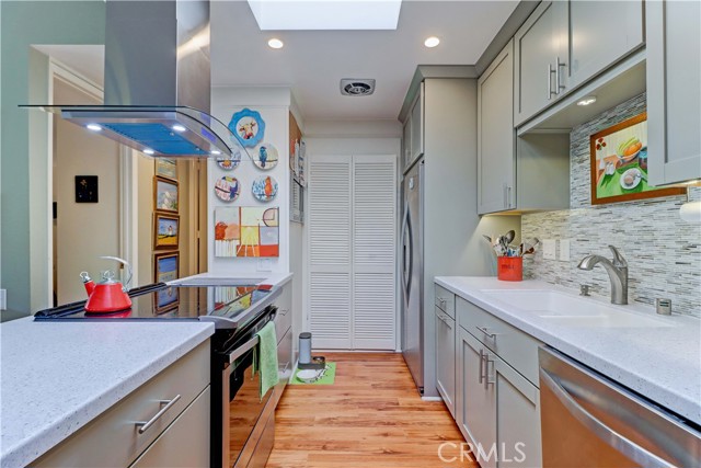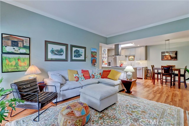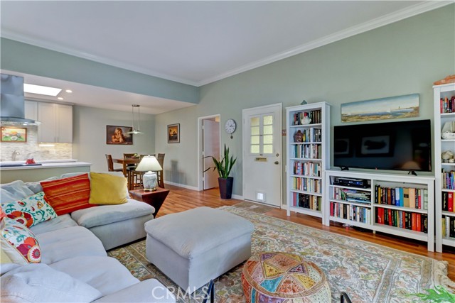 55+ community! Remodeled cottage "Monterey" co-op - sunny southwest orientation with no steps and no one above or below. Lovely front tiled entry patio for a private, relaxing space to take advantage of the indoor/outdoor lifestyle. Front door features opening window panels for light and air flow plus a fun vintage feel. Stepping inside, you'll love the remodeled, open kitchen with shaker cabinets in on-trend light sage tone, Corian counters with integrated sink, tile backsplash, recessed lights, large skylight, panty area, stainless appliances including vent hood and microwave cubby nicely tucked into the wall. This great home features waterproof laminate flooring, smooth ceilings, crown molding, large windows plus stack washer/dryer! High ceiling visually expand the space. 2 spacious bedrooms are on opposite sides of the home for nice privacy and both have mirrored closet doors. Bathroom enjoys newer vanity and tile floors. This beautiful home is conveniently located between gates 5 and 6 in a quiet area with parking right in front. Can be sold with most of the furnishings for a ready to go 2nd home or rental. Laguna Woods Village residents are privileged to enjoy a 27-hole championship golf course, a 9-hole executive par 3 course, pickleball and tennis courts, lawn bowling, gyms, clubhouses, swimming pools, horse stables, gardening centers, an art studio, computer workrooms and classes + over 200 clubs and organizations! IMMERSE YOURSELF WITH THE MATTERPORT WALK-THROUGH TOUR - CLICK THE WHITE CIRCLES TO MOVE THROUGH, THE 360 ICON TO WALK OUTSIDE AND WALKING PERSON ICON TO COME BACK INSIDE.