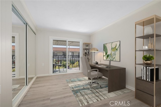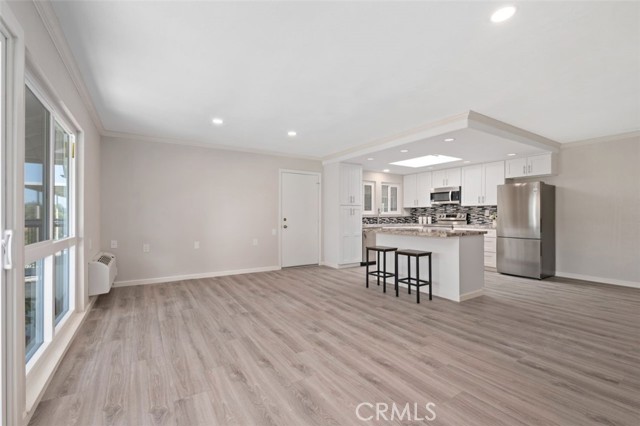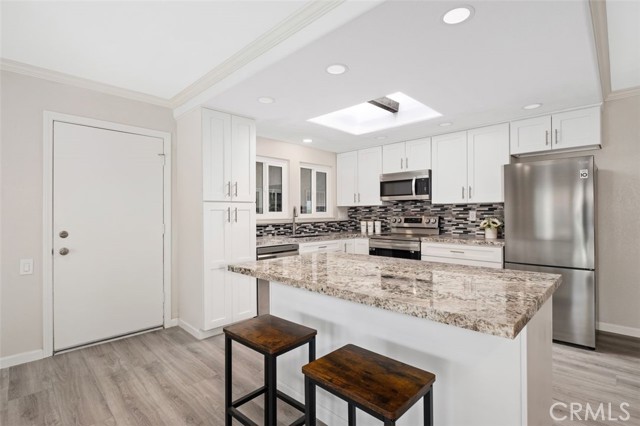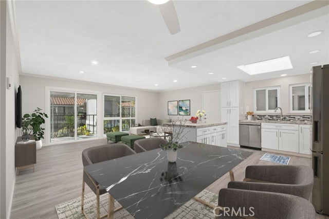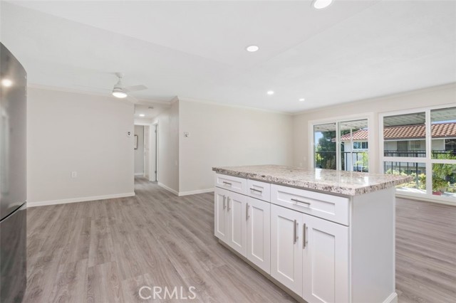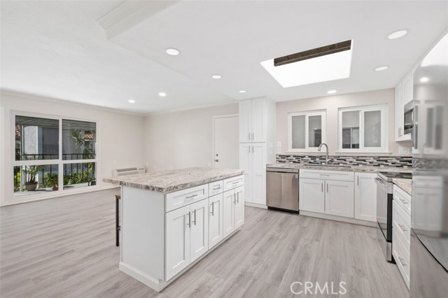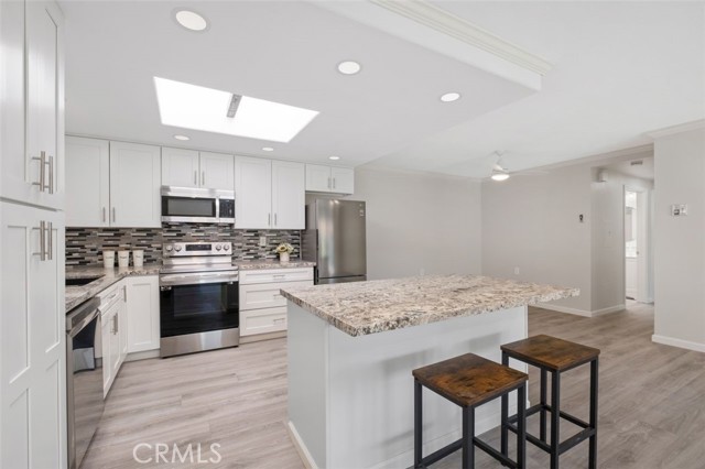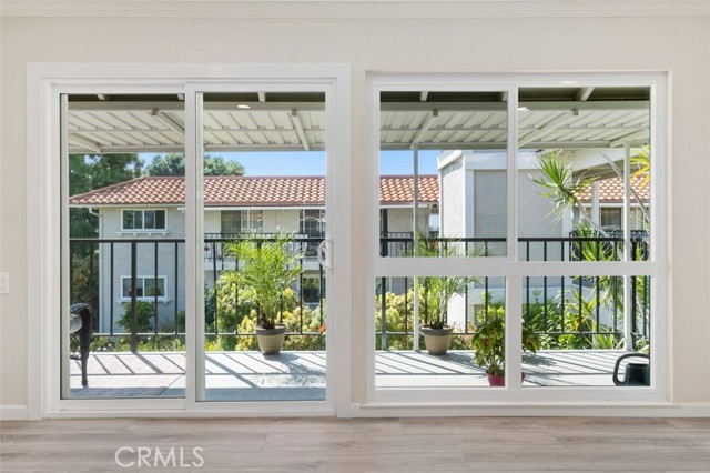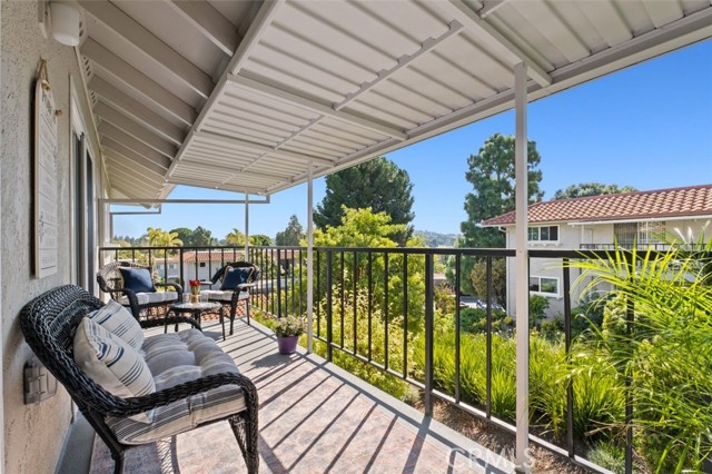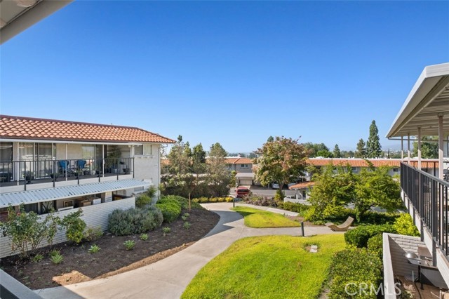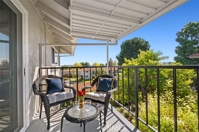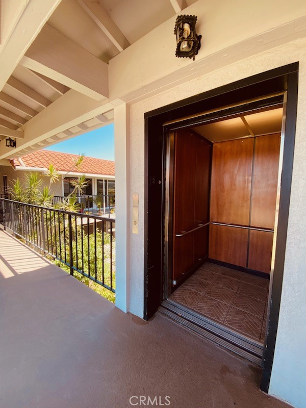 Light, bright, totally turn-key contemporary, two bedroom-two bath casual living in this completely remodeled Contenta Royal condo. Enter in to see a veranda view of hills, golf course, and greenery of the community. Even better, an additonal asset: An elevator, unique to this style building, with direct to parking below. Quiet area, vistas, and walking paths surround. Careful detail and designer features include: LG stainless steel appliance suite, dual pane windows & sliding glass doors throughout, new A/C heat pump, smooth ceilings, recessed lighting, crown molding, durable and neutral wood-inspired laminate flooring, enlarged and open kitchen, granite countertops, two remodeled bathrooms, two cheerful bedrooms, LG full-sized washer & dryer, storage, every detail lovingly considered. Open floor plan with lots of light and fresh air as this unit has two large skylights as well as sits on the top of Via Puerta. Unique to this building is an elevator maintained by the HOA just steps from the carport and your front door, allowing easy access with no stairs to consider. Large outside covered balcony flows right from the main room—ideal for entertaining, reading or simply taking in peaceful, beautiful evenings. In your carport? You can even charge your eBike, golf cart or electric car, too. Value, beauty, style and comfort--- doesn’t get better than this! As a Laguna Woods Village resident you will be able to enjoy 7 clubhouses, 5 swimming pools, private community golf courses (27 hole championship course and 9-hole par executive courses), tennis courts, lawn bowling greens, shuffleboard courts, craft and hobby workshops, garden centers, game rooms, billiard rooms, gym, horse stables, a very active theater and arts community, and library. Over 200 social clubs to join. This is all within a beautifully landscaped, gate-guarded golf community convenient to freeways, shopping, restaurants, outstanding medical facilities and of course, the beach.