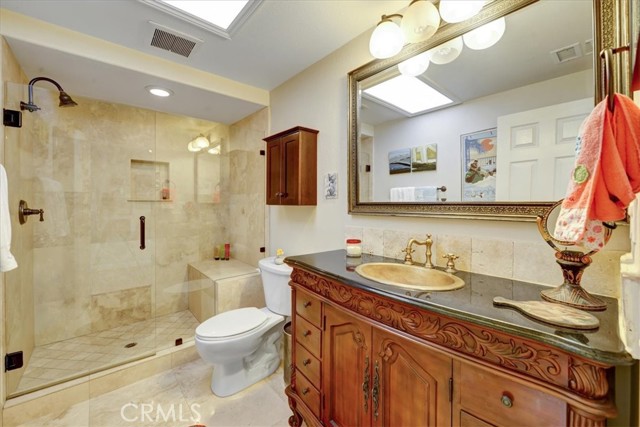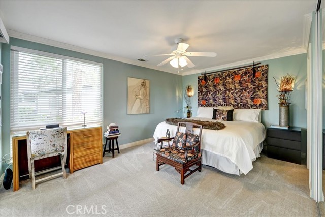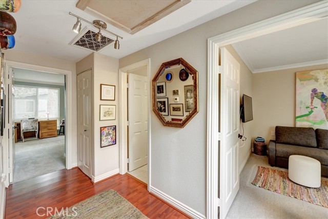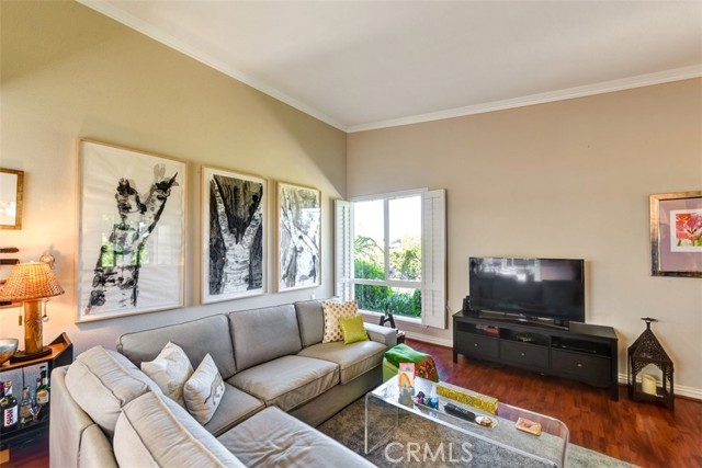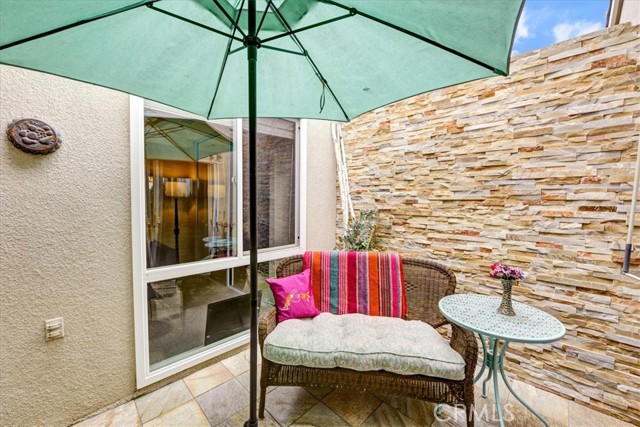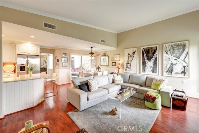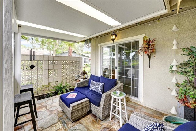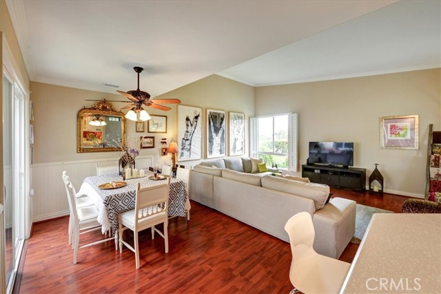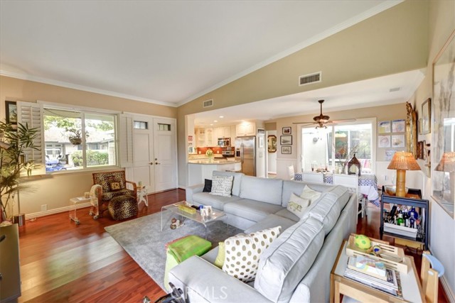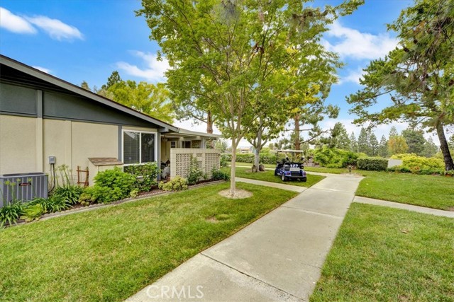 Come and see this outstanding end unit Granada on the bluff of Friendship Walk with panoramic views of Saddleback Mountain. This beautiful 2 bedroom, 2 bath home has central heat and air, thermal pane windows, stainless steel appliances, washer/dryer, smooth ceilings, crown molding and wainscoting. The flagstone covered patio offers comfortable outdoor living space to simply relax or entertain. Enter this home through double doors leading to the spacious living with vaulted ceilings, plantation shutters and gorgeous views. Adjacent to the living room and dining area is the beautifully appointed open kitchen with an abundance of storage and counter space, Corian counter tops, red glass tile back splash and a window overlooking the patio and lawn. Kitchen appliances include a double door refrigerator, dishwasher, self-cleaning oven, garbage disposal and microwave. The guest and master bathrooms include custom vanities and mirrors and travertine showers. Additional features include security double screen doors, an open atrium with a stunning stone wall and slate flooring, mirrored and organized closets in both bedrooms and a sliding glass door from master bedroom to patio. Come and enjoy a peaceful retirement in a very active 55 plus community. Just 7 miles to Laguna Beach for galleries and restaurants. Laguna Woods has a 27 hole golf course, 19th hole restaurant, executive par 3, five pools, 7 clubhouses, pickle ball courts, tennis and much more along with over 250 social clubs, very close to shopping, doctors offices an hospital.