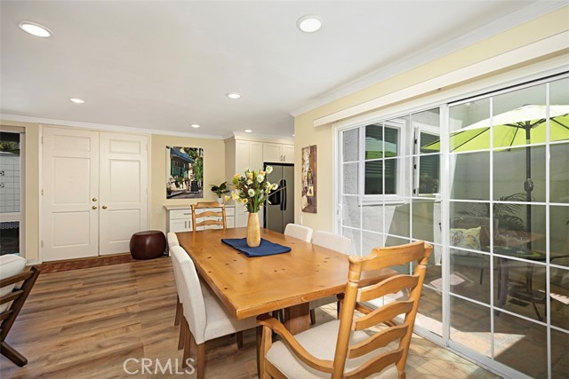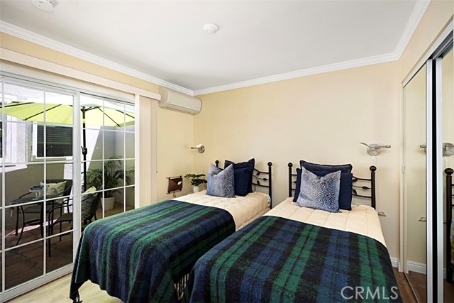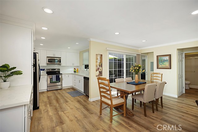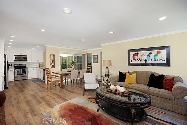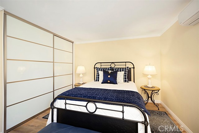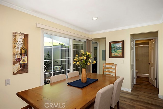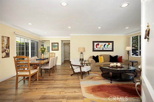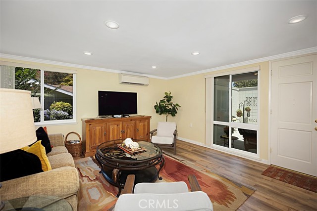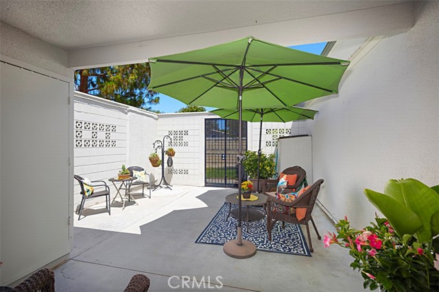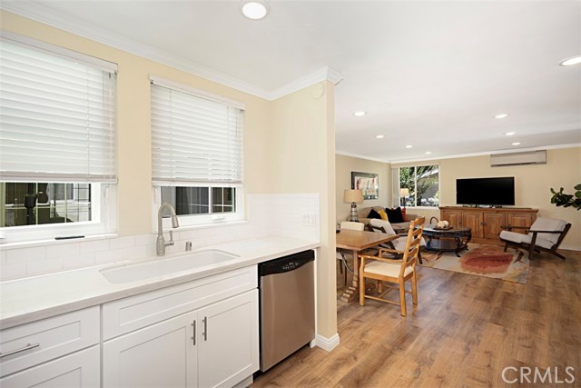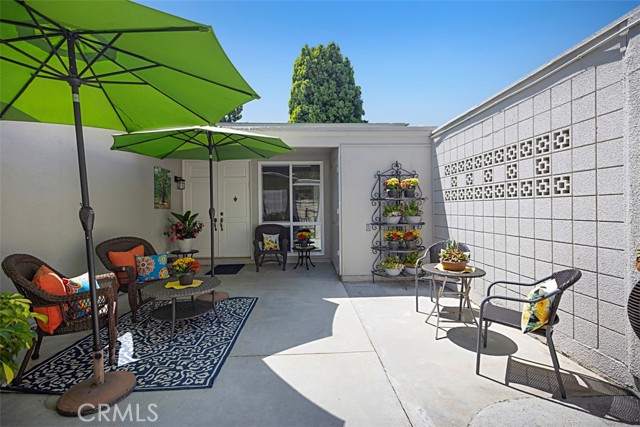 Remodeled single level cottage with a huge, private front patio entrance - California living at its best! Great location in a quiet area between Gates 1 and 3. This "Madrid" floorplan is calling you home to enjoy the great upgrades including remodeled and open kitchen, added guest bathroom, washer/dryer, vinyl plank flooring, dual pane windows, upgraded crown and base moldings, recessed lighting, smooth ceilings and energy efficient zoned, ductless mini-split HVAC. Double door entry leads into the spacious living room with 2 large windows. Your eye then immediately gravitates to the expanded kitchen featuring white shaker cabinets, quartz counters, subway tile backsplash, stainless appliances, recessed and under cabinet task lighting, huge single basin sink and 2 windows over the sink looking out to the atrium. The adjacent dining area can accommodate a large table and has sliding doors leading out to the interior atrium. The atrium provides light and air flow to the kitchen, dining and guest bedroom and give a burst of afternoon sun that brightens this home and extends the visual footprint! The guest bedroom enjoys its own bathroom with tiled walk-in shower plus mirrored closet doors and electrical in place for a ceiling fan if you wish. Stack washer/dryer conveniently located in the hallway and upgraded panel doors invite you into primary bedroom and bathroom. Primary bath houses a large walk in, tiled shower with seat, glass enclosure and quartz-topped shaker vanity. The large primary bedroom stays moderate thanks to the north facing window and you'll love the modern closet doors. This is a great co-op with lots of light! Carport is very close. Laguna Woods Village residents are privileged to enjoy a 27-hole championship golf course, a 9-hole executive par 3 course, pickleball and tennis courts, lawn bowling, gyms, clubhouses, swimming pools, horse stables, gardening centers, artist studios, computer workrooms and classes + over 200 clubs and organizations! ENJOY THE VIRTUAL WALK-THRU TOUR - CLICK ON THE WHITE CIRCLES TO WALK THROUGH, 360 ICON TO WALK OUTSIDE TO VIEW FRONT AND BACK YARD COMMON SPACES AND WALKING PERSON ICON TO COME BACK INSIDE!
