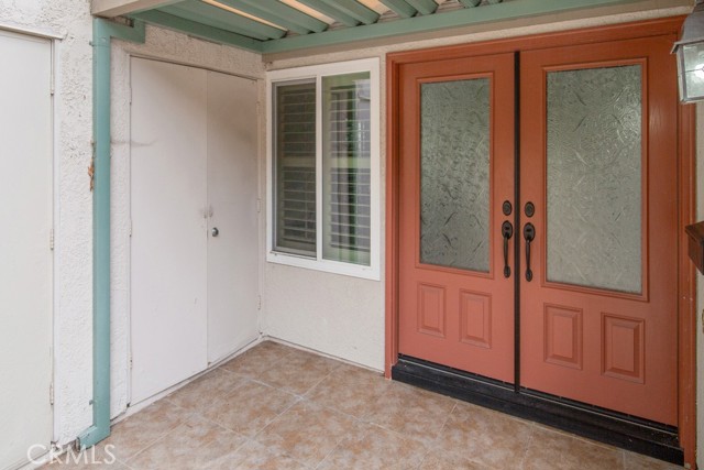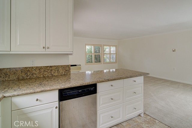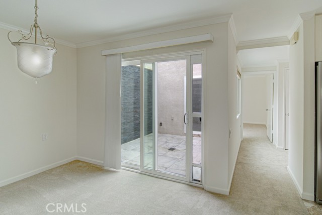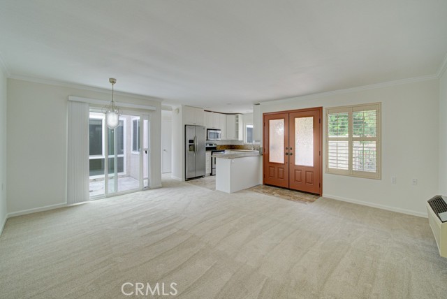 Lovely upgraded single-level two-bedroom, two-bath VILLA NOVA residence in the Laguna Woods senior community. Private quiet location far from busy streets and noisy highways. No stairs from nearby carport to your front gate. Large open front patio is perfect for outdoor entertaining, dining and relaxing. The double door entry with attractive custom glass inserts opens to the large living room. The kitchen features upgraded cabinetry, stainless steel appliances and a window that looks onto the front patio. The open central atrium with an attractive stone wall provides another desirable outdoor space to enjoy. The master bedroom has convenient direct access to the front patio via sliding glass door. Both bedrooms have mirrored closet doors. Upgrades throughout the residence include smooth ceilings, crown molding, recessed lighting, dual-pane windows, plantation shutters and baseboards. Brand new neutral paint and carpeting throughout. A stackable washer-dryer unit is conveniently located in a hall closet. Additional storage capacity is available in the front patio closets and large cabinets in the nearby assigned carport space. Do not miss.