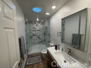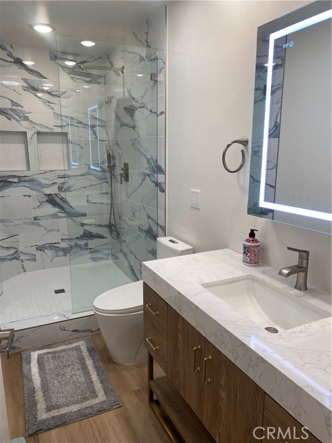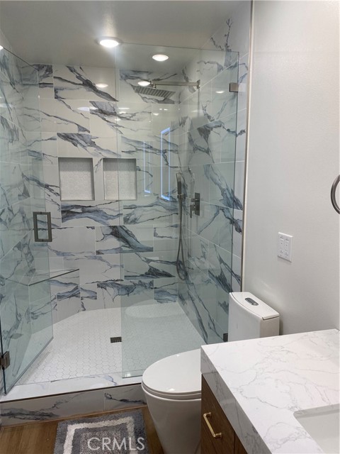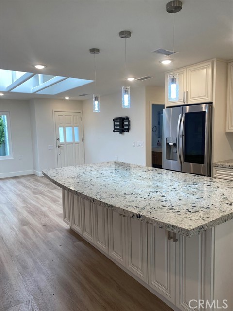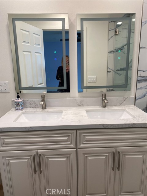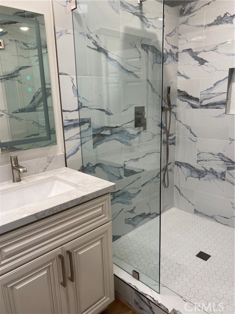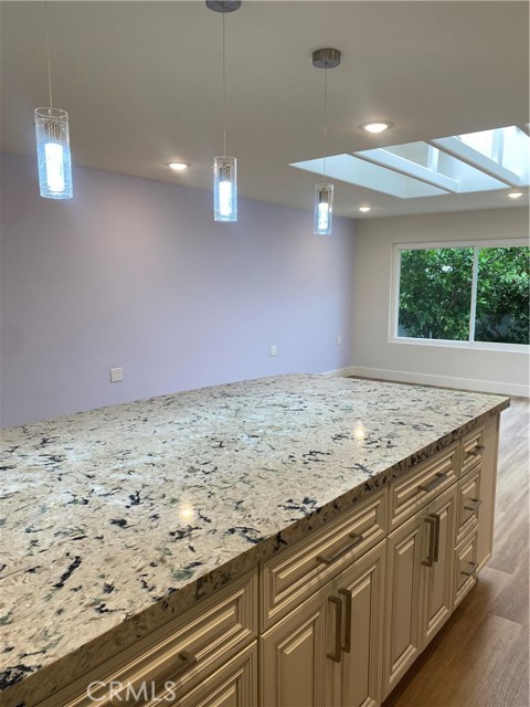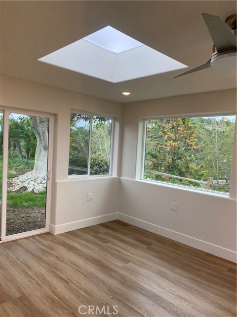 LA REINA- Rare 3 bedroom/2 bathroom; attached large 2 car garage. End unit. No stairs to the front door. No one above or below. SPECTACULAR COMPLETE REMODEL! Amazing views from huge 72" picture windows! Added sunroom 200+ square feet of fully insulated HVAC living space; making this home a total of 1450+ square feet. Enter home into the light and bright living area; lit by a large custome 4'X8' skylight. Brand new open concept kitchen with large quartz island w/added storage and high end appliances including induction stove and sound insulated dishwasher. Both bathrooms have custom luxury sized frameless walk-in-showers with deluxe fixtures, anti-fog vanity mirrors and skylights that bring in natural light. Master bedroom enjoys a large walk in closet. Both bedrooms have ceiling fans and recessed lighting. Recessed lighting throughout. Scraped ceilings throughout. Brand new high efficiency central heat and air conditioning. 2 car garage ready for electric cars with a Tesla outlet and electric car plug in. Full size washer/dryer and an extra refrigerator in the garage. Breezeway when you enter allows for outdoor living and BBQ. Really too much to mention. You must come take a look! Enjoy all the amenities of this active 55+ community with golf, tennis, swimming, 7 clubhouses, over 200+ active clubs, 2 gyms, 1 restaurant, 1 library, horse stables and a free bus system. Laguna Woods Village is 6 miles from famous Laguna Beach in the heart of South Orange County!