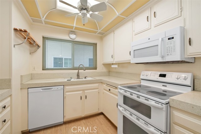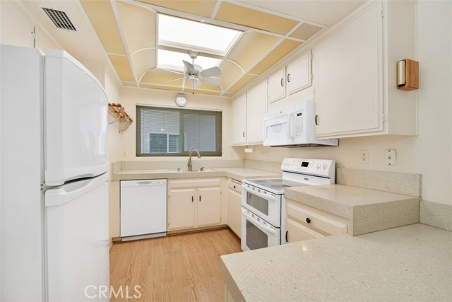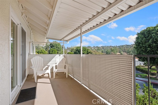 Casa Vista Model without steps. Walk into your 2 bedroom /2 bath unit with a lovely green view. Nice-sized Balcony to enjoy the view or sit in the living room and see the pretty view. The Balcony can be accessed from the living room and 2nd bedroom. The kitchen has the appliances needed to enjoy cooking. This home offers central air and heat, a walk-in closet in the master bedroom, a washer/dryer in the closet, dual pane windows, a skylight in the kitchen, and master bathroom, also shutters in the Master Bedroom. Laguna Woods is a 55+ community with amenities galore. Duplicate Bridge, Social Bridge, Golf, Driving Range, Pickleball Courts, Tennis Courts, Paddle Tennis Room, approximately 200+ clubs to join, jewelry-making room, Woodworking, Sewing, Pottery, Painting, Heated Swimming Pools, Performing Arts Center, Ballroom Dancing, Bocci Ball, Lawn Bowling, etc. Close to Laguna Beach, Medical Facilities, Restaurants, Supermarkets, Mothers Market, Trader Joes etc. Easy drive to John Wayne Airport, and Segerstrom Theater.
