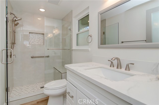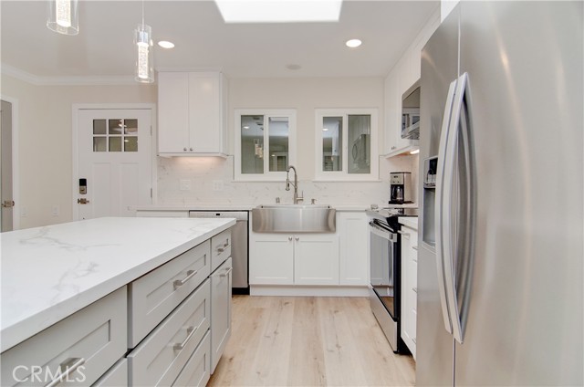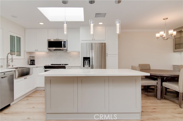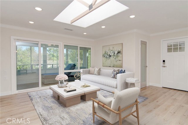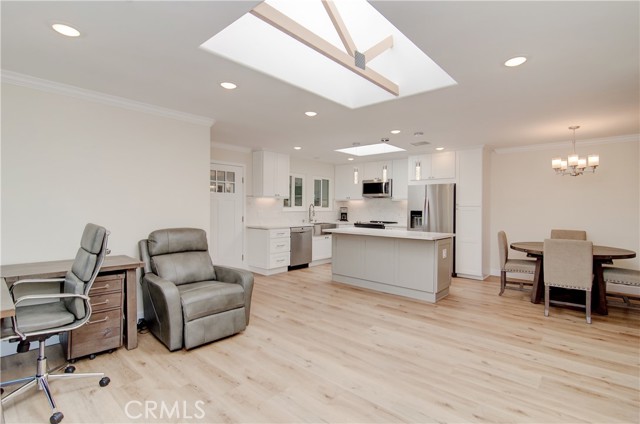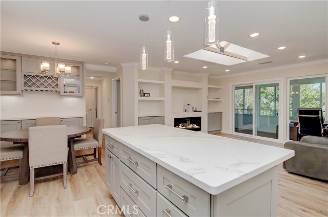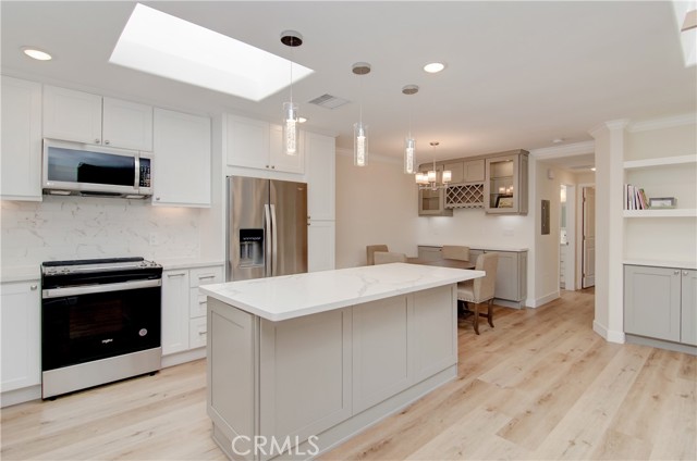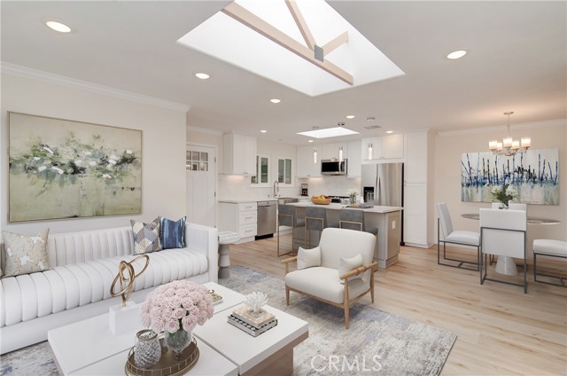 NO STAIRS to your new impeccably remodeled end-unit "Casa Linda" model, with a highly sought-after single-story floor plan. Located on Nob Hill a highly desirable location within Laguna Woods. This beautiful property offers buyers a great location combining comfort and convenience. Step inside and prepare to be mesmerized by the open-concept living area, expertly designed for open-concept entertaining and quality living. With two spacious bedrooms and two elegant bathrooms with dimmer lighting, every detail of this property exudes sophistication. The lavish primary suite serves as a true retreat, featuring a generously sized walk-in closet, a large walk-in shower, two bidet outlets and a ceiling fan. The gourmet kitchen is a standout highlight adorned with stunning quartz countertops, a custom backsplash and a large island. Kitchen designed with custom designed cabinetry, soft-close doors and drawers, a premium KRAUS sink and high-quality stainless-steel appliances. Adding to the kitchen's quality, bask in natural light through the magnificent custom-beamed skylight creating a bright and airy ambiance. The newly installed under-cabinet and display cabinet lighting accentuates the impressive design. Additional interior features include a built-in multi-use closet for extra storage, attractive quality vinyl flooring, smooth ceilings, crown molding throughout, energy-efficient LED recessed lighting, new dual pane windows and sliding glass doors. Embrace the convenience of a CARRIER central heating & air conditioning system only 2-years old, along with a large capacity LG washer/dryer leaving no detail overlooked to provide a comfortable living experience. Laguna Woods Village is the pinnacle of active senior living with exclusive access to incredible amenities offered by the community. Enjoy the privileges of seven (7) clubhouses, five (5) pools, two (2) golf courses, three (3) fitness centers, Ten (10) tennis courts, an equestrian center, complimentary bus service, and more. Don't miss out on this rare opportunity to own a truly luxurious home in this exceptional community. Take the first step toward an upgraded lifestyle today!