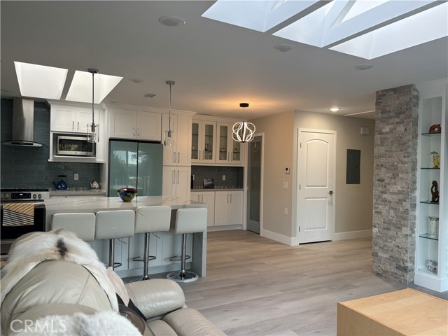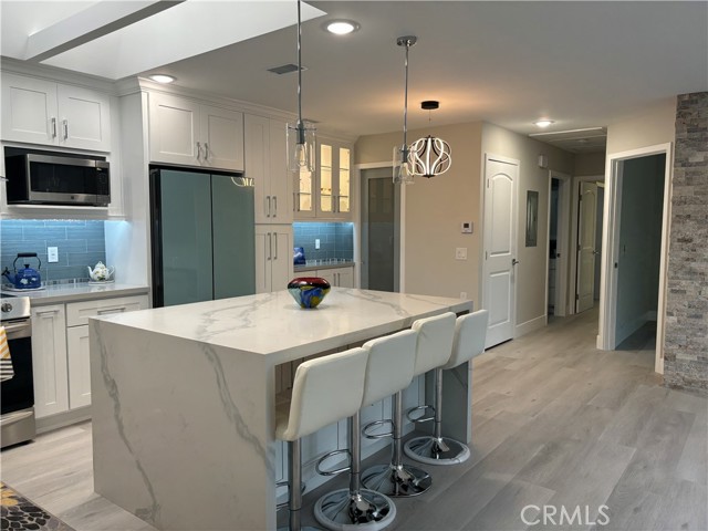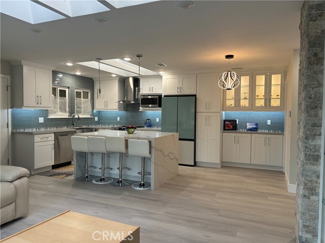 Beautifully remodeled Casa Contenta model in Nob Hill area of Laguna Woods Village. This property was redone from top to bottom with Quality Materials and Excellent Workmanship. massive Kitchen Island with Quartz Counters, All New Appliances, walk in Pantry plus plenty of closet space, Skylights in living room, kitchen and bathroom, Ceiling Fans in both Bedrooms, Two bathrooms, one walk in shower, one shower over tub, both with beautiful tile finishes, Laundry in the closet, New Central air-condition and heating, updated Plugs and Switches, new interior doors and baseboards, new Plumbing Fixtures, Dual Paned Windows, Great Views over the tree canopy into the distance hills and mountains, a passenger elevator for residents or visitors. Welcome to this Senior Resort Community of Laguna Woods Village that has 7 Clubhouses Including 800 Seat 'Performing Arts Center' Plus a World Class Golf Clubhouse with Spectacular Views & Dining. 27 Hole Course , Driving Range and another 9 Hole 'Executive' Par 3 Course. Full Equestrian Center. 5 Swimming Pools, 4 Hot tubs, Lighted Tennis & Pickle Ball Courts. 3 State of the Art Fitness Centers. 2 Computer Centers (Mac & PC ), Card rooms, Video Lab, Digital Photography Studio, Wood Shop, Sewing Rooms, 2 Ceramics Studios, Art/Painting rooms, Jewelry Making & Lapidary. Example- Club House 1 has a Fitness Center, Swimming Pool, Hot Pool, Volleyball, Basketball, Bocce, Billiard Room, Indoor Archery Range, Bus Station, Drop-In ( Coffee ) Lounge, and all activities like Yoga, Tai Chi, Chi Gong, Painting, Shuffle Board, Line Dancing, Badminton. Multiple Walking paths, Free Local Bus service, Cable TV System & Broadcasting Studio. 2 Garden Plot areas for growing your own, only 7 miles to the Pacific Ocean in Laguna Beach.