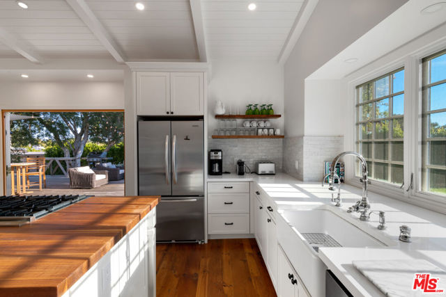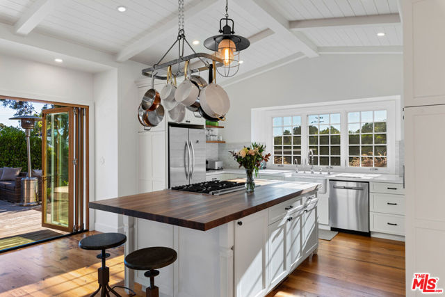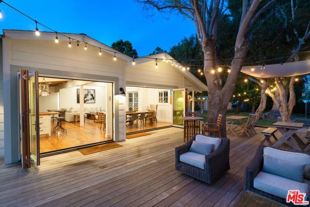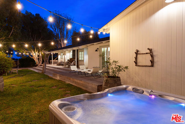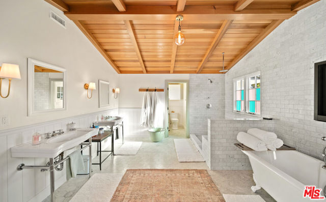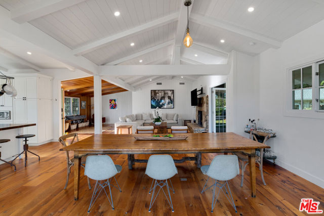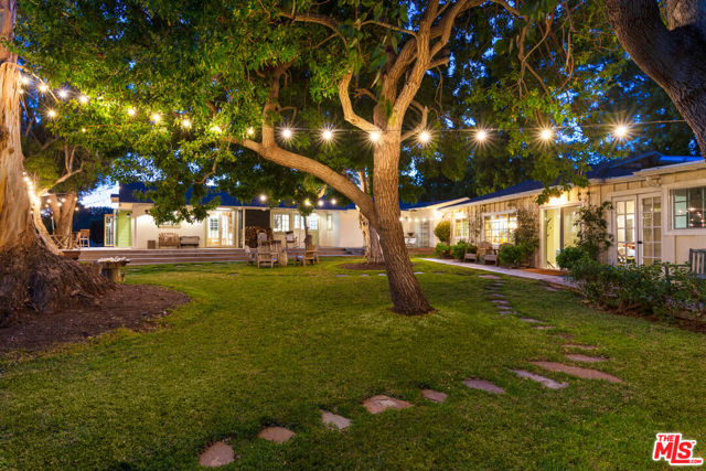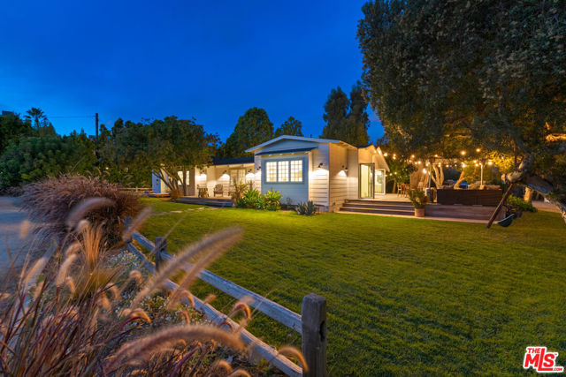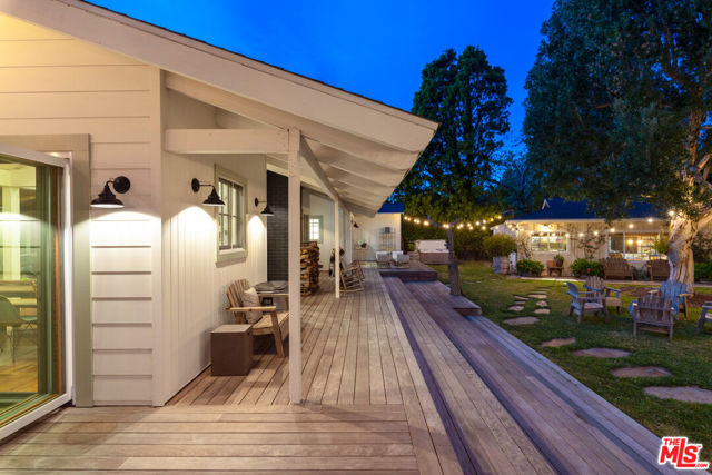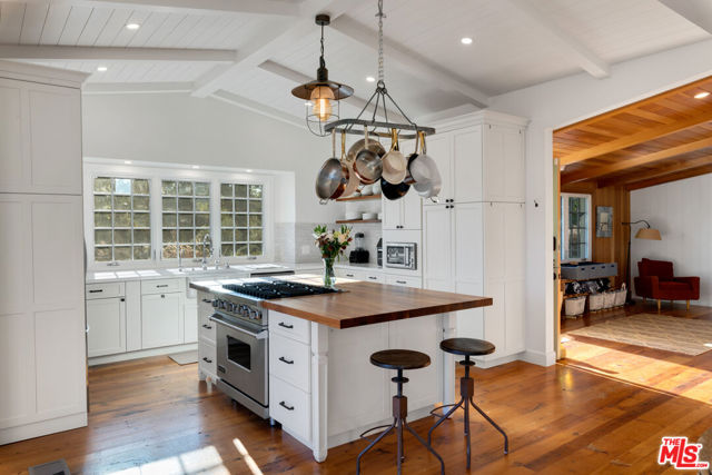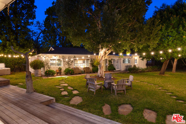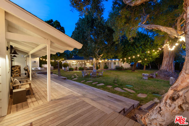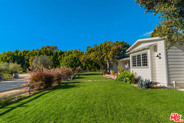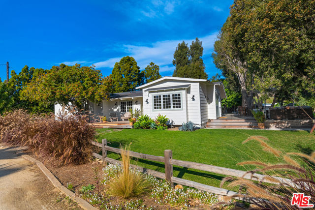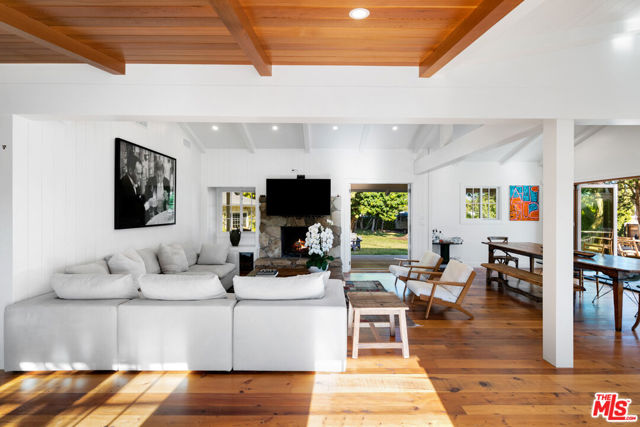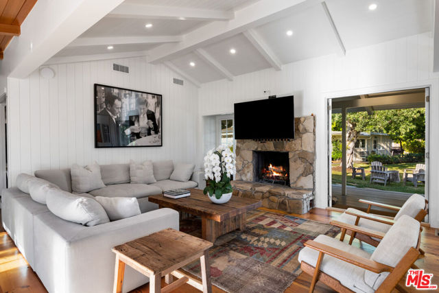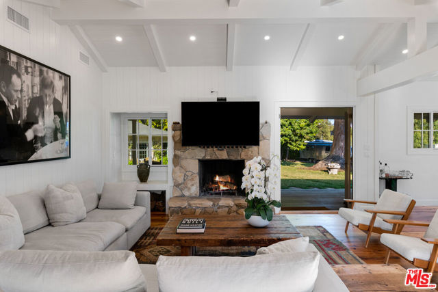 This private and charming Point Dume mid-century ranch home is spacious and open, with wonderful indoor-outdoor flow, expansive front and backyards, a lovely guest cottage, and beach keys to Little Dume. The fully renovated single-level home with 3 bedrooms and 3.5 bathrooms and the guesthouse with 2 bedrooms and 1 bathroom, are set on an acre of property with gates and privacy hedges, gorgeous gardens, mature trees, and two driveways providing ample space for multiple vehicles. The interior features high beamed ceilings and hardwood floors, a huge stone fireplace in the living room, a spacious dining room, and a beautifully equipped kitchen with an island, wood countertops, bar seating, and loads of cupboards and storage space. The living room opens to the back deck, while the dining room and kitchen open onto the side deck. Off the entry, a barn door in the hallway opens to the laundry room, and another opens to the powder room. Further along the hall are three en-suite bedrooms, including the primary suite, which has a huge closet and a marble-tiled bath complete with a fireplace. At the front of the house, the sensational grounds feature a circular drive, two fountains, a small gazebo, an outdoor dining area, a generous lawn, and a welcoming front porch that looks out at an enormous fragrance and flower garden with meandering pathways. At the side of the house, a large deck provides an outdoor living area for relaxed evening entertaining. The deck wraps around to the covered back porch, which has a sitting area, and the backyard provides additional areas for seating and recreation, plus a Caldera spa. The home's second driveway opens at the back of the house, with room for six or more vehicles, and a shed. Flagstones in the back lawn lead to the air-conditioned guest cottage, which has a wooden front deck, a large living room with high, beamed ceilings, a gorgeous kitchen, and two bedrooms. Behind the guest house is a surfboard rack and an outdoor shower. More than just a home, this private compound is a tranquil getaway for easy Malibu living and entertaining. Available for lease at $30,000 per month.