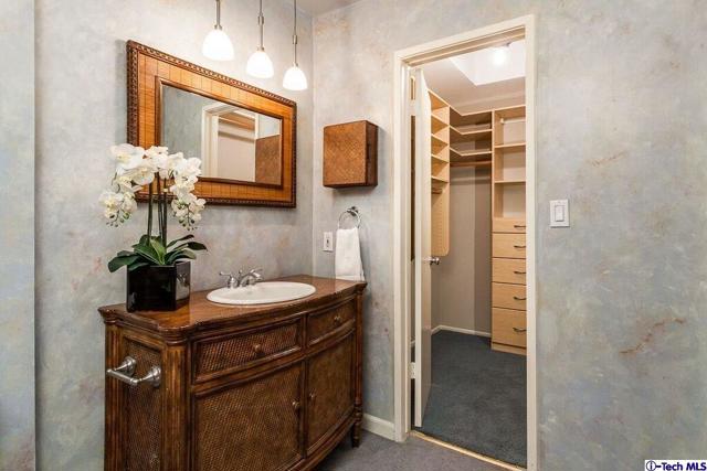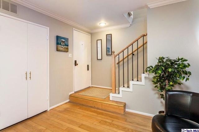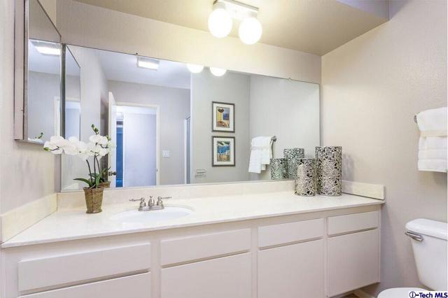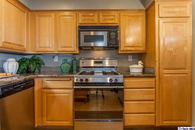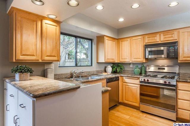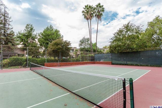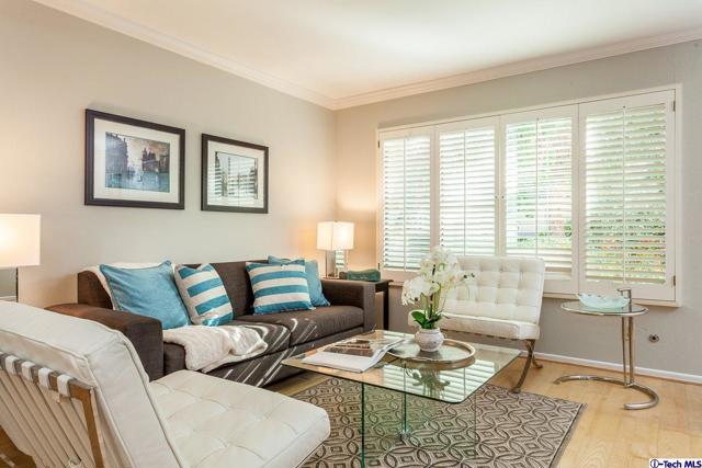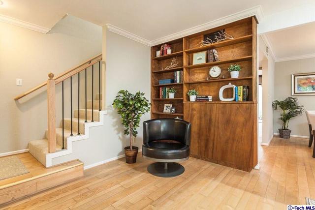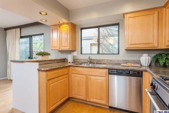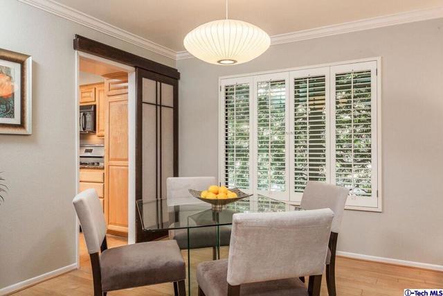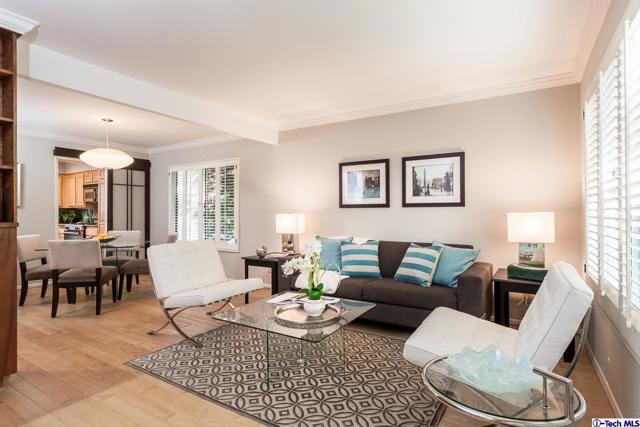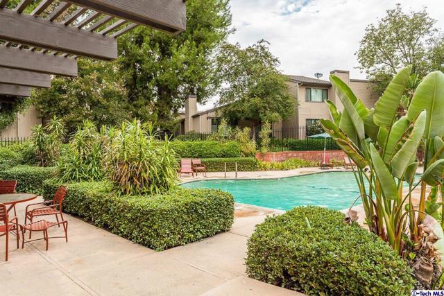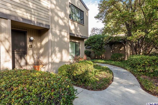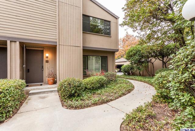 This delightful three bedroom end unit townhouse has been freshly painted and literally sparkles. The kitchen has been updated with maple cabinetry and granite counter tops and is adjacent to FR/Den/Office. Sliding doors open onto an enclosed patio that leads to the garage which includes ample storage space as well as a washer/dryer. The renovated master bath has an oversize shower with seating area. Other features include plantation shutters, crown moldings, faux hardwood flooring, double paned windows and a Murphy bed in the middle bedroom. The complex itself has extensive grounds, tennis court and a pool with spa. It is located within a short distance of major freeways and close to Old Town Pasadena. There are five guest parking spaces next to and behind the unit.