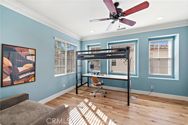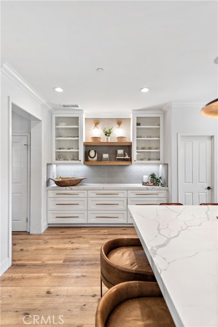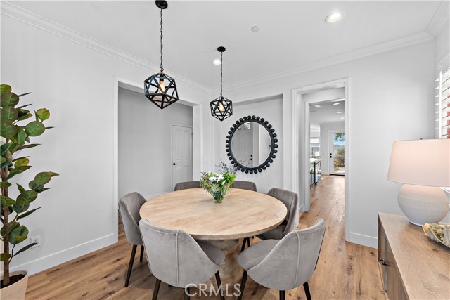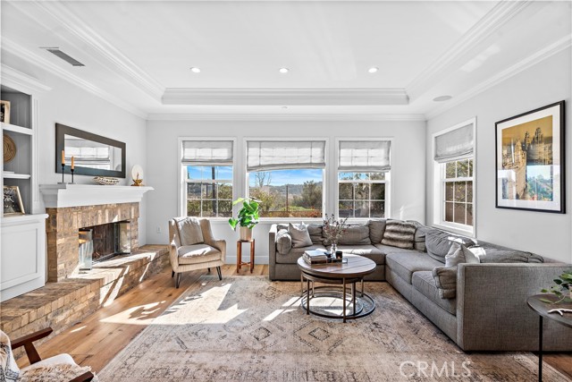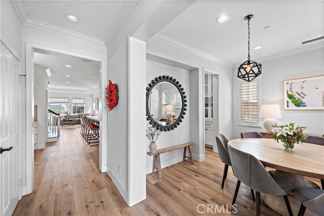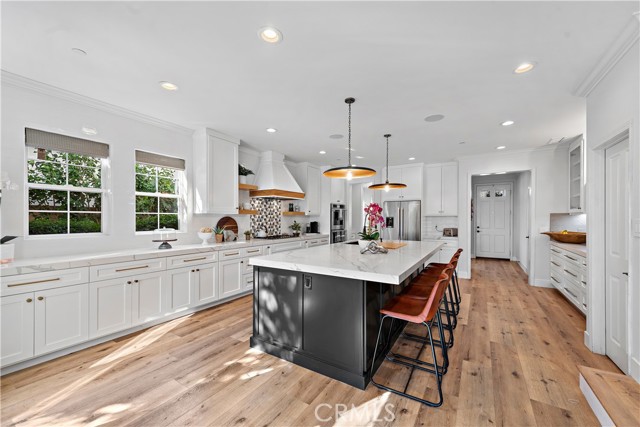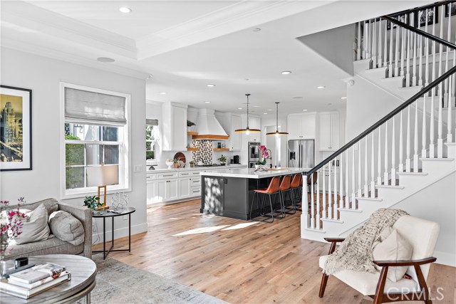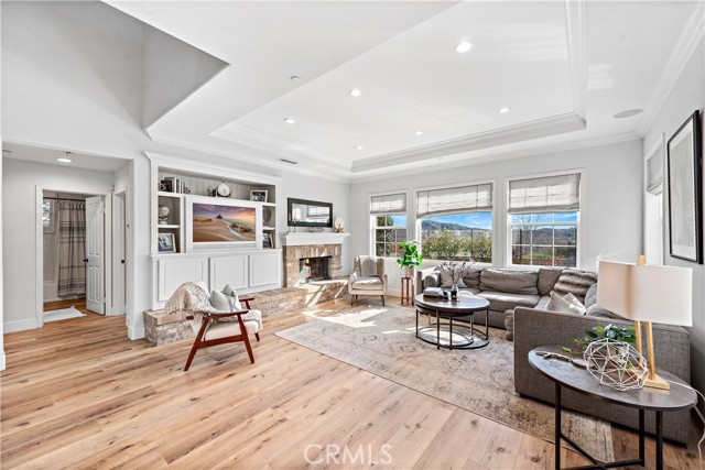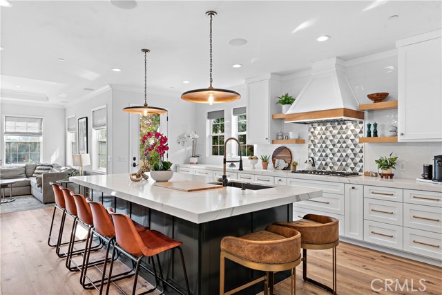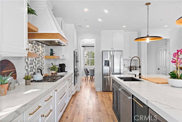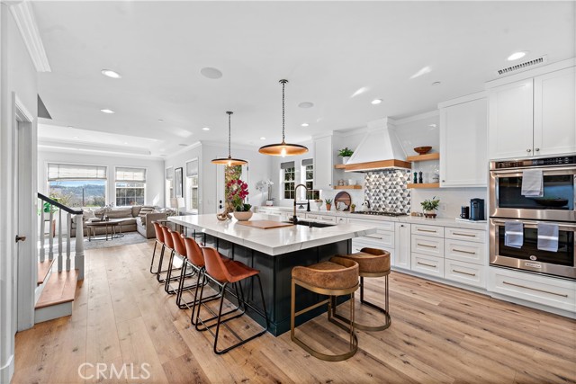 Exquisite Talega residence with unrivaled custom designer upgrades throughout! This 5 bedroom + bonus room/den, 3 bath home is nestled against a beautiful, panoramic hills view backdrop. Inside, easy flowing spaces are infused with ample natural light and create a practical open floorplan with one bedroom and one bathroom on the main level. The large gourmet kitchen is absolutely stunning showcasing a long center island with seating, quartz counters, pristine white cabinetry with chic hardware, on-trend open shelving, a unique tile backsplash designed as a fun focal point, and stainless-steel appliances including double ovens. A quaint dining room, a spacious laundry room with a sink and storage space, and a cozy family room with a built-in entertainment center, fireplace, and lovely hills views finish off the lower level. The additional four bedrooms are located on the upper level. The impeccable master bedroom impresses with French doors leading to a balcony showcasing spectacular hills views, and a divine master bathroom with dual sinks, a soaking tub and a large walk-in closet with built-ins. The bonus room/den has endless possibilities as an office, game room, 6th bedroom, gym, etc.! Also adding to the charm of this impeccable home are the unique lighting fixtures, beautiful LVP flooring, crown molding and more. The backyard is the perfect spot to enjoy a casual outdoor setting for dining, lounging, and entertaining with picturesque hills views. Excellent location within walking distance to the community pool! Talega is a phenomenal community with numerous amenities including pools, playgrounds, multiple sport courts, hiking/biking trails, shopping and only minutes to the incredible San Clemente beaches.