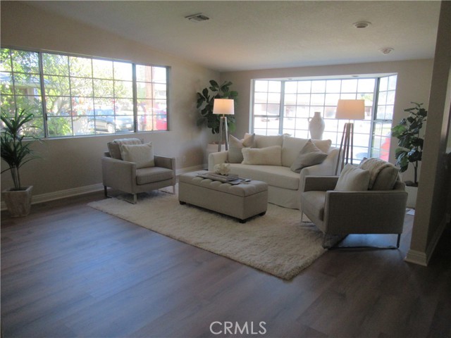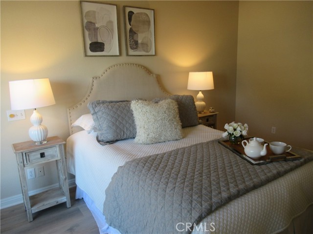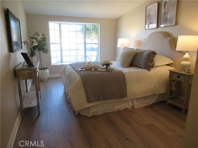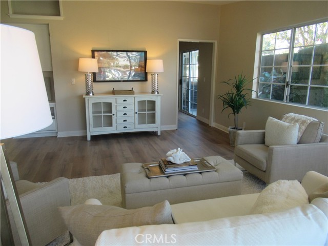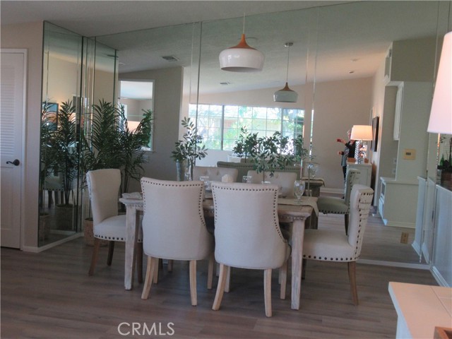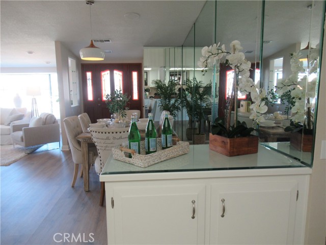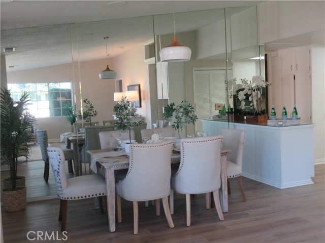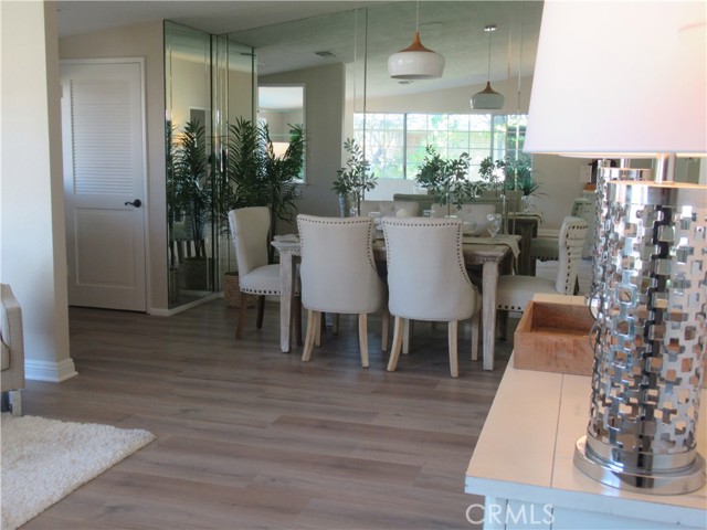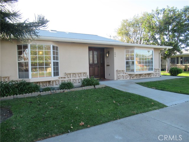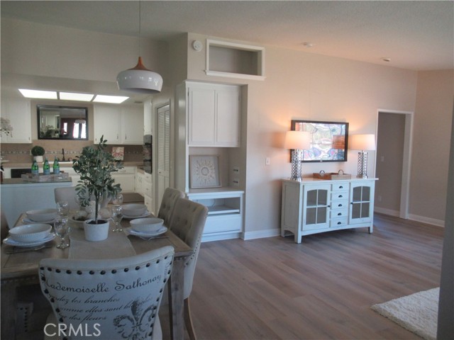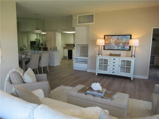This elegant fully expanded corner two-bedroom one bathroom home features a spacious living room and formal dining room. The living room has Bay windows, recessed lighting and is adjacent to a formal dining room with a beveled-mirrored wall. The cheerful kitchen has white cabinets with tile counters, built-in appliances including a refrigerator, stove, oven, microwave, and dishwasher. The kitchen also has an extra-large skylight and an added pantry. The main bedroom has a large walk-in closet and Bay window. The bathroom has a skylight and walk-in shower. The second bedroom has a built-in wall unit with desk and sliding doors to a private side patio addition. This charming home has been painted throughout and has newly installed deluxe vinyl plank flooring with tile flooring in the bathroom. Additional features include double pane windows, central heating and new air conditioning unit added in 2023, entry closet, leaded glass entry door, an outside storage closet, and convenient drive-up parking. Don’t miss out on this beautiful home located in the resort-like community of Leisure World Seal Beach. This senior community offers over 200 clubs, activities, and organizations including a nine-hole three-par golf course, gym, swimming pool, jacuzzi, arts, crafts, amphitheater, library, health care center and so much more. Enjoy the fabulous ocean breezes that the city of Seal Beach has to offer.
