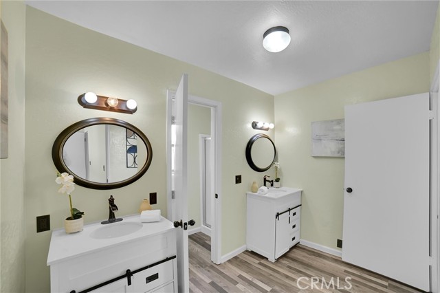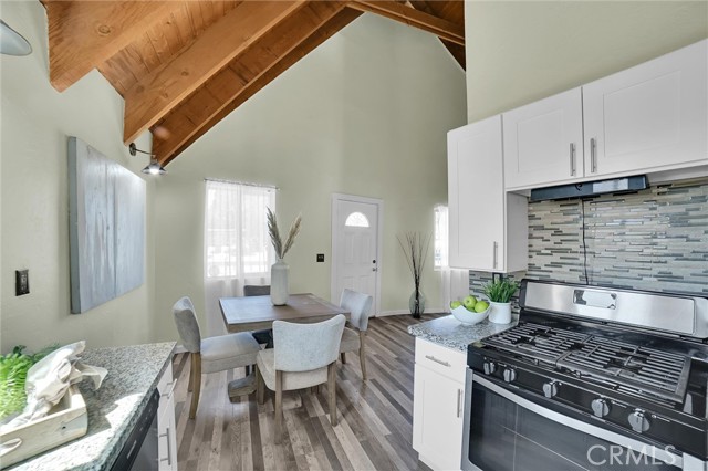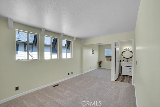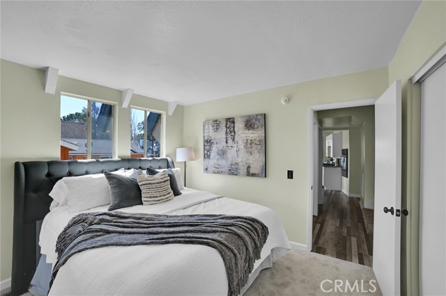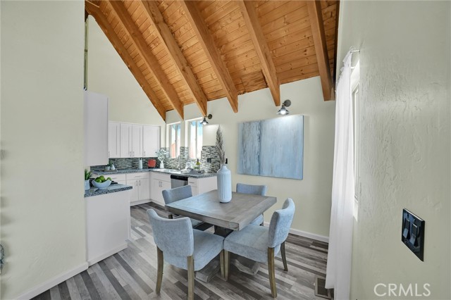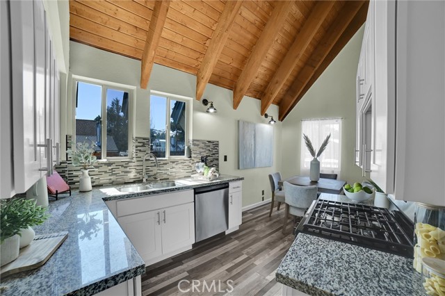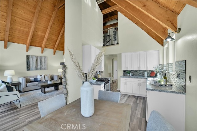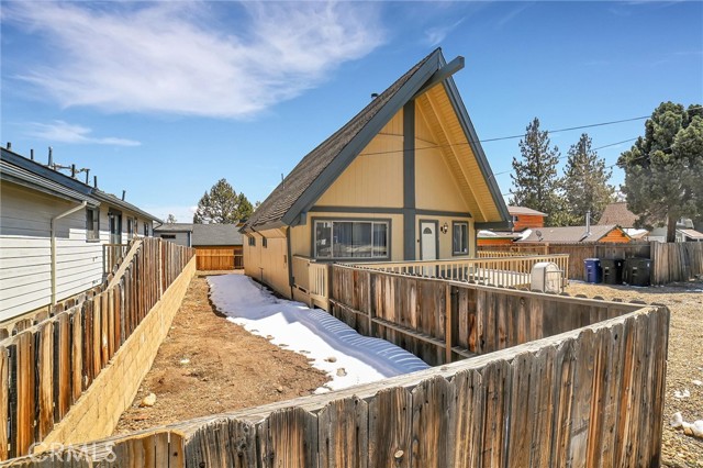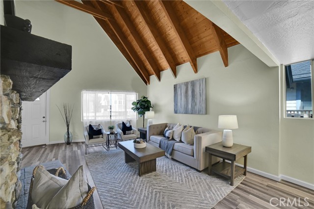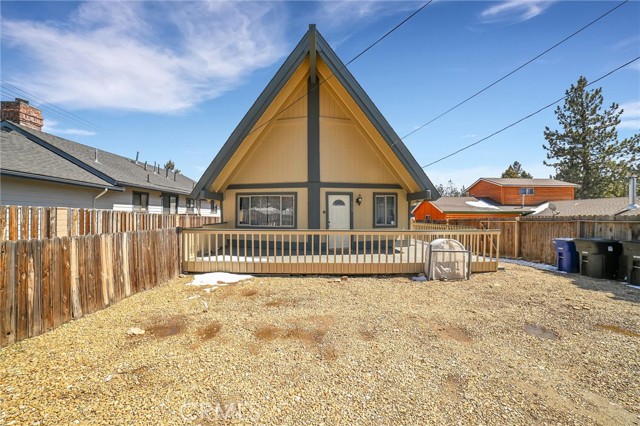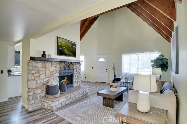 This is the quintessential A Frame inspired 3 bedroom and 2 bath cabin, on a large lot, located only a few minutes away from Big Bear Lake. Charming, oversized front porch makes for an attractive curb appeal. The dramatic wood beam, cathedral style ceilings greet you as soon as you enter through the front door. Unique and clever floorplan makes excellent use of the ample, nearly 1700sf of living space, from the open flowing kitchen with new cabinets and countertops, to the warmth of the stone wrapped fireplace in the family room. Desirable, dual downstair master bedrooms each with a retreat! Upstairs features a balcony with a view across the entire kitchen and family room, and plenty of additional storage space. The private upper level bedroom looks across the neighborhood with views to the scenic snow capped mountains! With central heat and a private laundry room, this is the Sugarloaf cabin you have been looking for...New paint and flooring, new contemporary vanities in both bathrooms, and beautiful upgrades throughout, this will not last. Whether home or investment, mountain getaway or vacation rental, this home has plenty to offer!