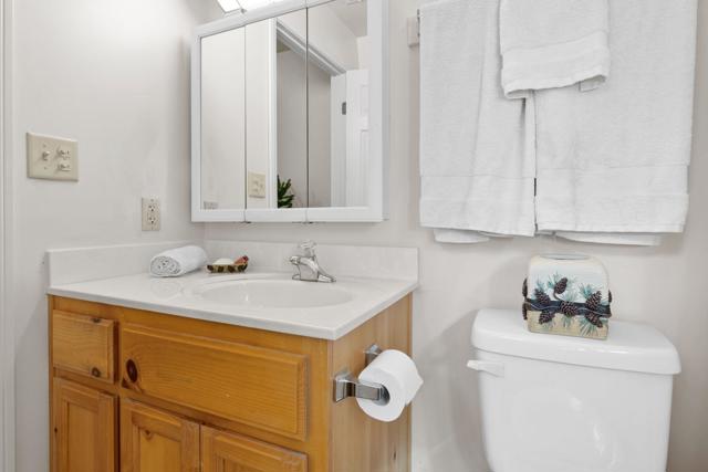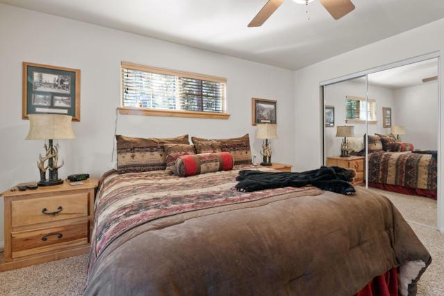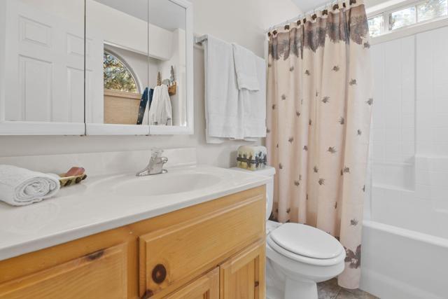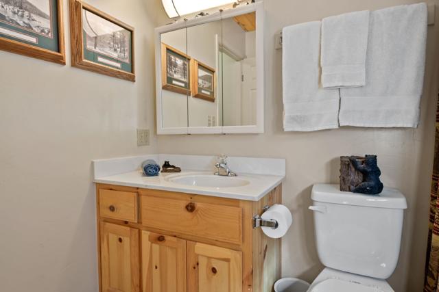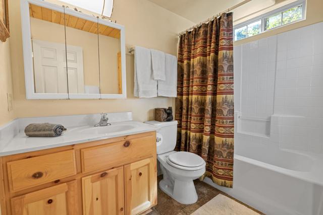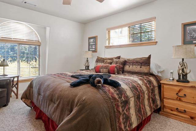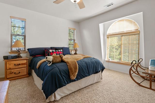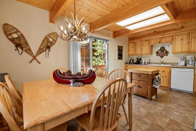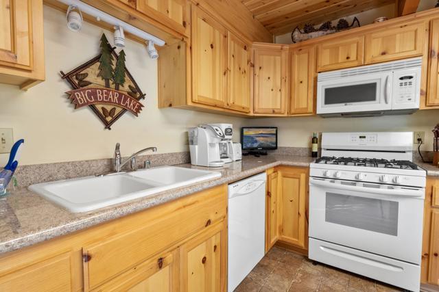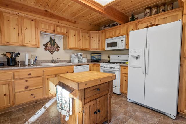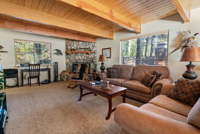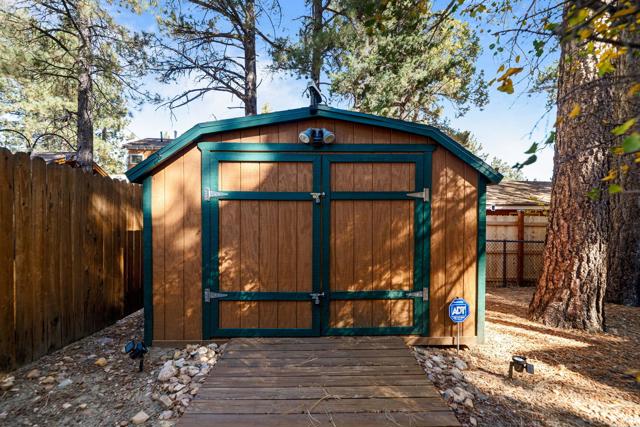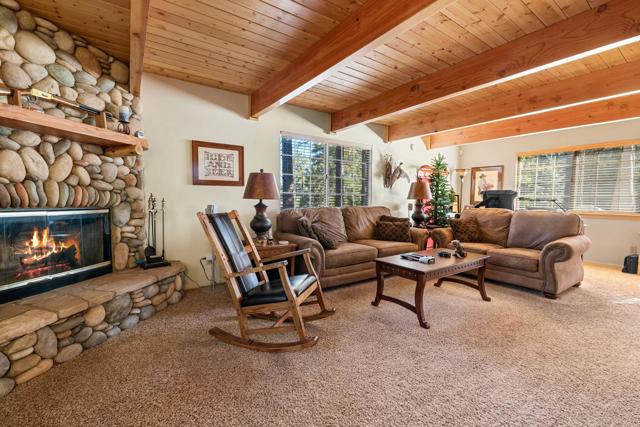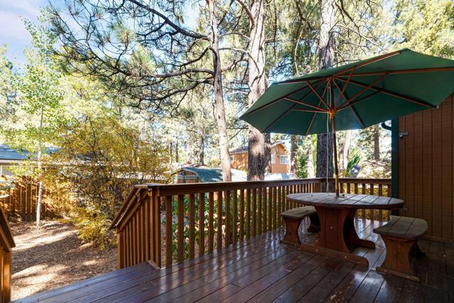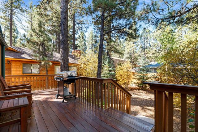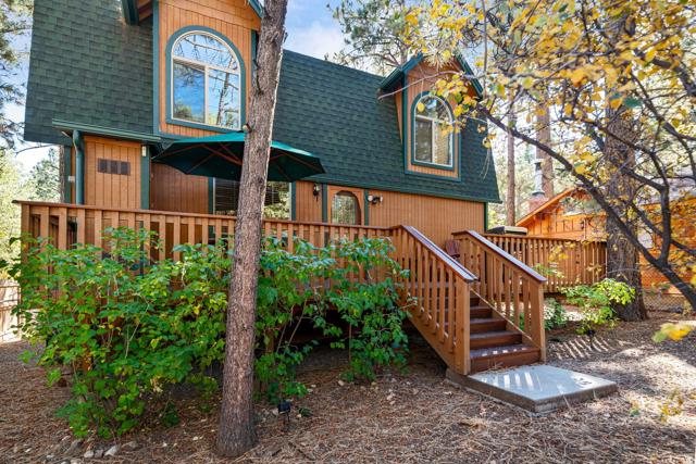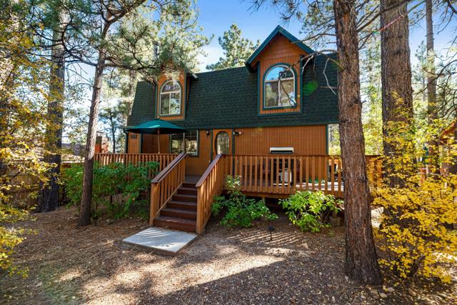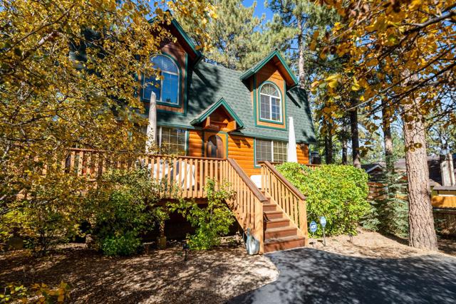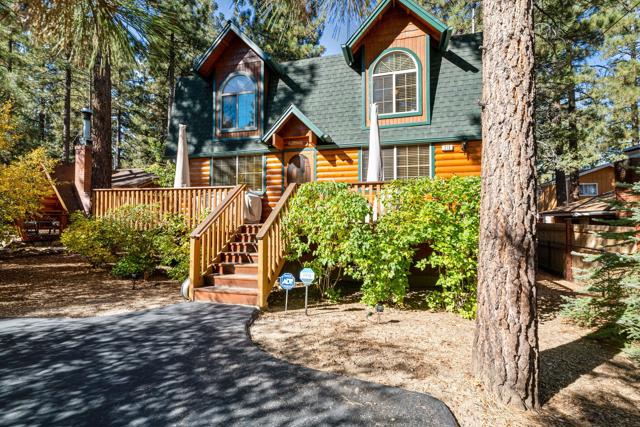 This remarkable log-style gambrel cabin is nestled in its own quiet forest of pine and spruce trees. The completely fenced in, level lot is beautifully landscaped and the home features a wraparound deck from front to back. The main living area is large featuring a cozy rock fireplace for those snowy winter evenings. Beamed, T&G ceilings give the home a nice cabin feel. The kitchen has plenty of room for all your cooking needs. Granite countertops and knotty pine cabinets add to the mountain cabin charm. There is one full bathroom and a laundry area downstairs, upstairs are the 3 bedrooms and another full bath. This home has been meticulously maintained since it was built in 2007...equipped with dual pane windows and forced central heat and A/C. Home was painted and driveway redone within the last 2 years, still looks new! Enjoy all that Sugarloaf and Big Bear Lake have to offer...walking and biking trails, Sugarloaf park with dog park is within walking distance. The two ski resorts, Big Bear Lake and The Village downtown are just a short drive away. This home would be great for full time living through all 4 seasons of Big Bear or any kind of investment property. The home comes furnished, less personals. (exclusion list)