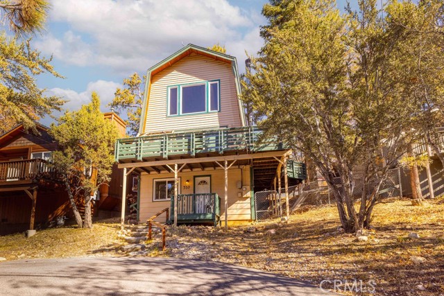 This is the vacation home dreams are made of, a quiet personal mountain retreat with groceries, shopping, and the entertainment of Big Bear Lake and the SLOPES only 10 minutes away. This large three bedroom, two bath modern gambrel cabin sits on a double lot that is slightly elevated from the freshly-paved street, and offers beautiful sunset and forest views from the expansive wrap-around deck. The property welcomes you in to an entryway with space for all your snowboards or skis and a large coat closet. Step upstairs into an abundance of natural light from the large updated windows and gorgeous high ceilings. The recently-remodeled kitchen boasts brand-new stainless steel appliances, new countertops, and the cabin has been freshly painted. The updated light fixtures maintain the modern rustic feel of the property. The open-air primary bedroom in the large loft enjoys the best views of beautiful mountains and tree tops. MUST SEE TO APPRECIATE! The new happy owners will experience utmost privacy with a single bedroom on each level and plenty of space. The convenient shuttle stop at the local general store easily brings you to Big Bear Mountain, Snow Summit Ski Resort, Oktoberfest, or to the nightlife and dining in the village. The paved driveway features 4 parking spaces for your family and guests. Included with the furnishings is a fully stocked kitchen with newer toaster, airfryer, crockpot and anything else you need to begin building your own cozy cabin memories. Smart home devices like a nest thermostat and ring security camera also are included with the sale. The yard is fully fenced in for your furry friends and the wrap around deck features comfortable lounge furniture, a Tree Hammock and a porch swing perfect for taking in sunset views and epic starry nights.