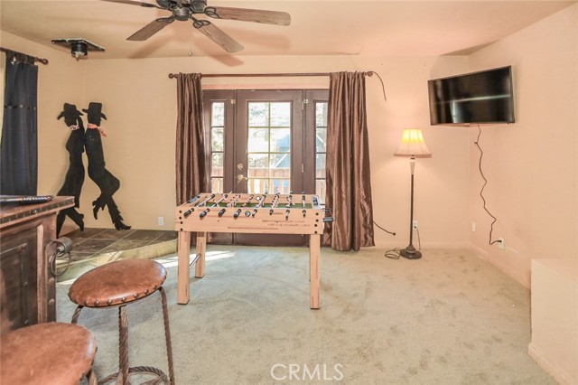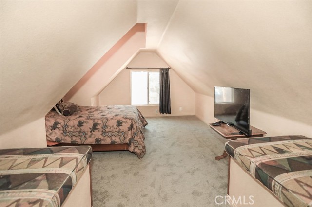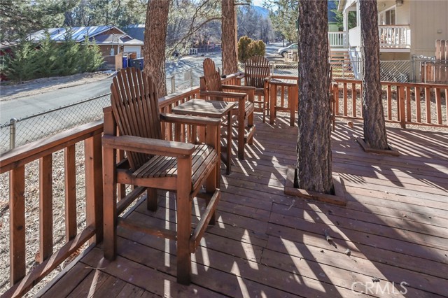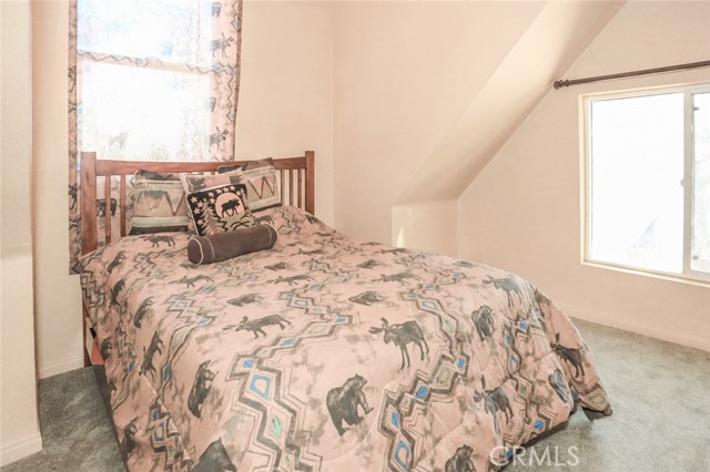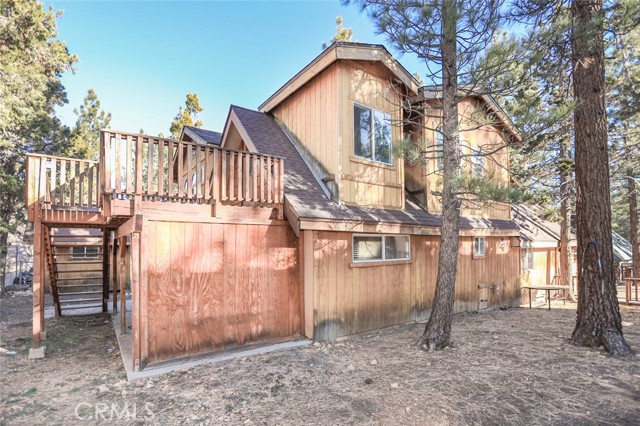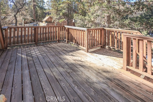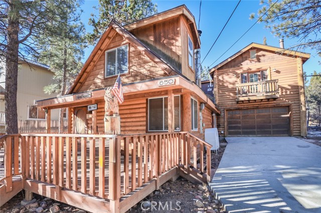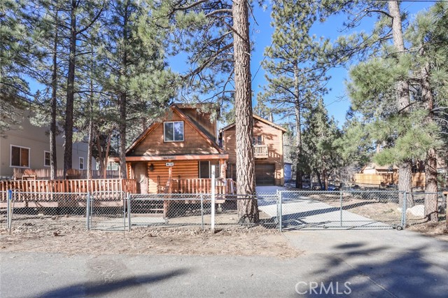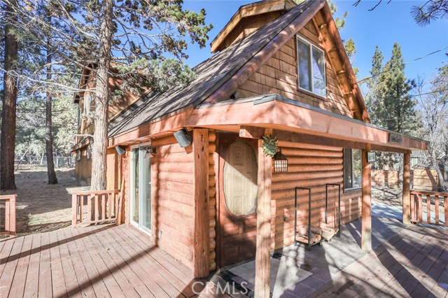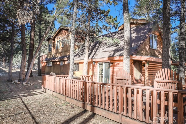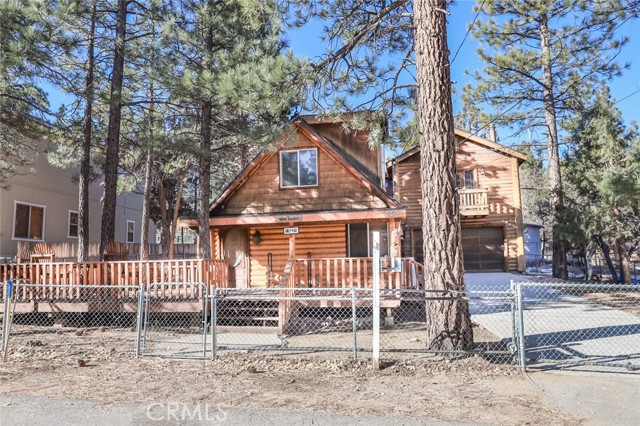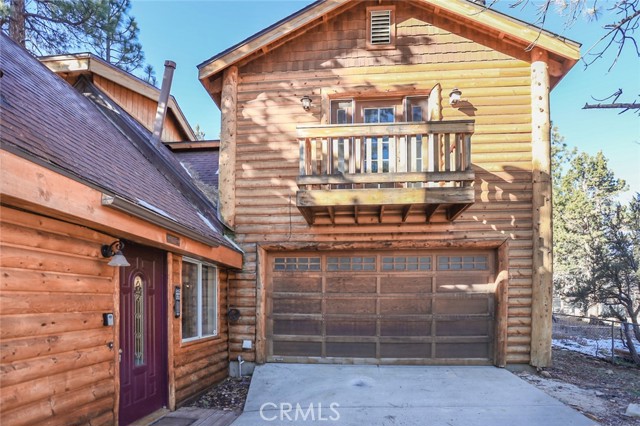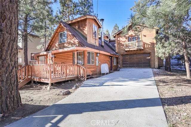 Spacious log sided home in Sugarloaf with many elements suited for entertaining if you wish, inside and out. This cabin has all the amenities for your comfort. Bottom floor offers large open floor plan including kitchen, dining area and living room. Also downstairs is one full bathroom, storage room/laundry and one bedroom with a huge closet which leads to porch and Jacuzzi outside. Beamed ceilings, recessed lighting, breakfast bar, native rock wall feature and free standing stove to warm up the place are just a few more details to note. Carpet and paint are in good shape. You'll appreciate lots of windows and natural lighting. Cabinets and appliances are also in good shape. Metal spiral staircase takes you to large additional square footage upstairs, perfect for large family gatherings and STR possibilities. Another 2 large bedrooms and their closets, 2 balconies, game/bar/family room (counted as 4th bedroom) and full bathroom compete the 2nd story. This property is unique for the area and feels mountain- cozy. Wrap -around decking with abundant trees is perfect for star gazing or throwing snow balls. The large driveway can hold 3 cars or boat/RV, in addition to the attached 2 car garage. There is also street parking. Sugarloaf is located just a few miles from Big Bear Lake. This property is easily accessible and roads are a piece of cake to drive in winter. Just off the highway to 38 or 18, this cabin will check off all your "must haves".