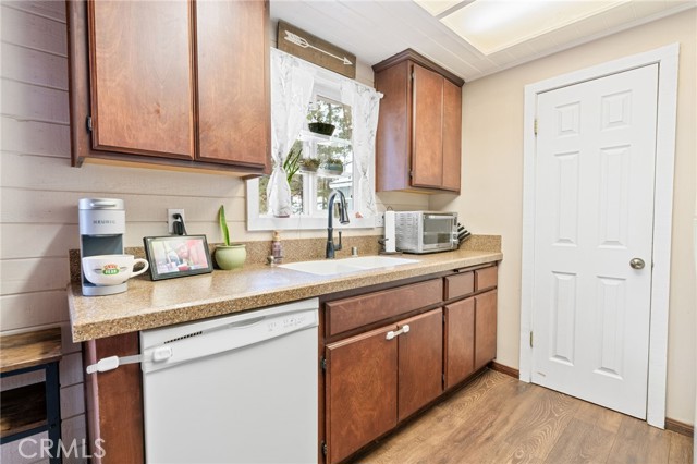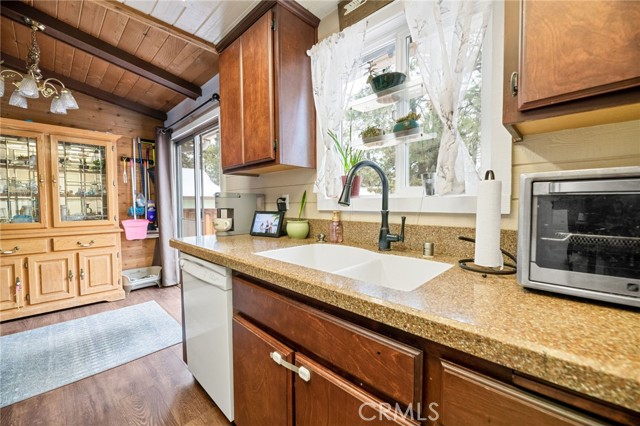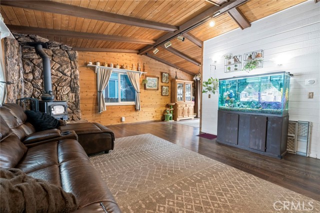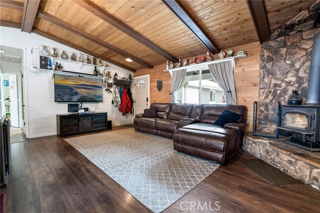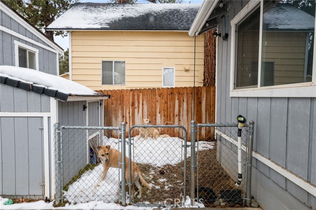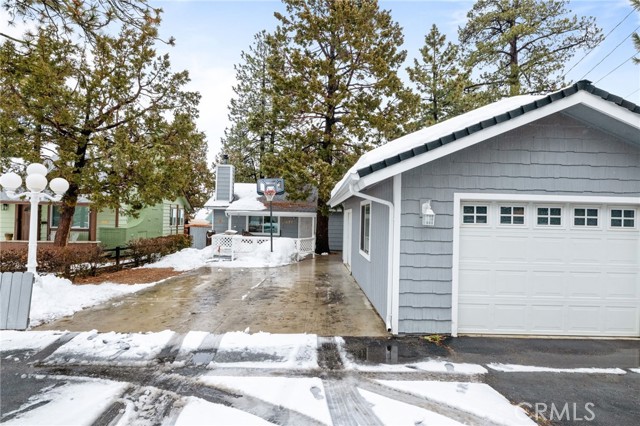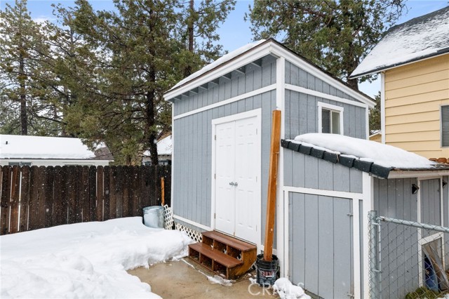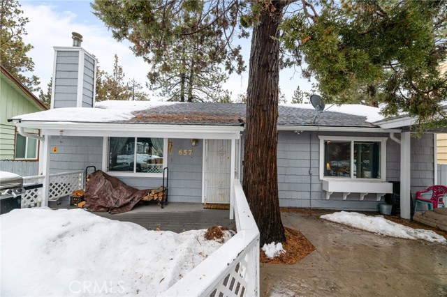 Welcome to this charming 2 bed, 1 bath 960 sq ft home situated on a spacious 5000 sq ft lot. This cozy home boasts vaulted beamed ceilings, laminate flooring, and granite kitchen countertops. The free standing wood burning stove keeps this home overly warm on those cold winter nights. Step outside onto the big beautiful trex deck in the fully fenced rear yard, complete with a dog run and a large shed with gas and electricity connected. The front yard is equally inviting with a trex deck and concrete patio for outdoor entertaining. The oversized 1 car garage can fit a second smaller vehicle and includes a workbench, lots of cabinets for storage, and 220V electricity, perfect for any hobbyist. And don't miss the enchanting Disney light in the front yard that adds a magical touch to this lovely property. Located within walking distance to the national forest, this home is the perfect retreat for nature lovers. This home is move in ready. Don't miss out on this gem! Buyer and buyers agent are solely responsible for verifying the accuracy of any and all information provided.