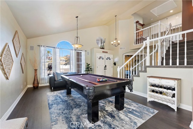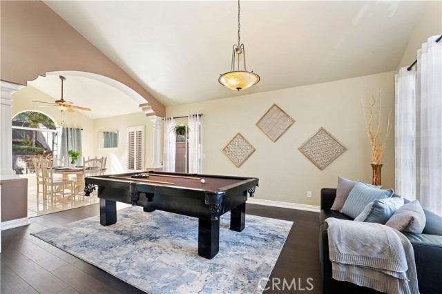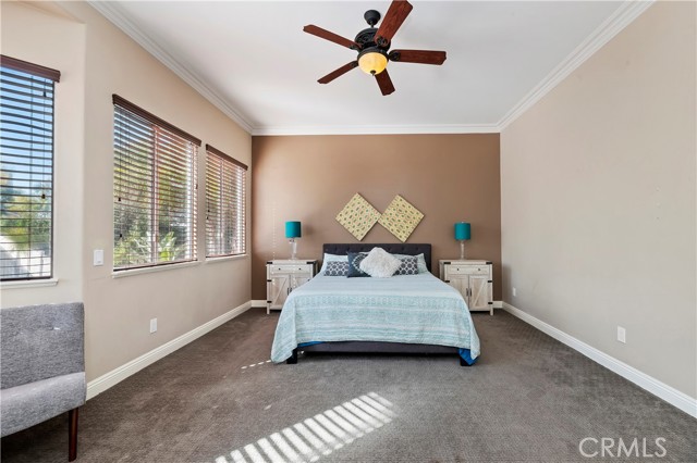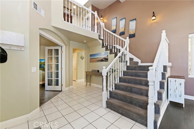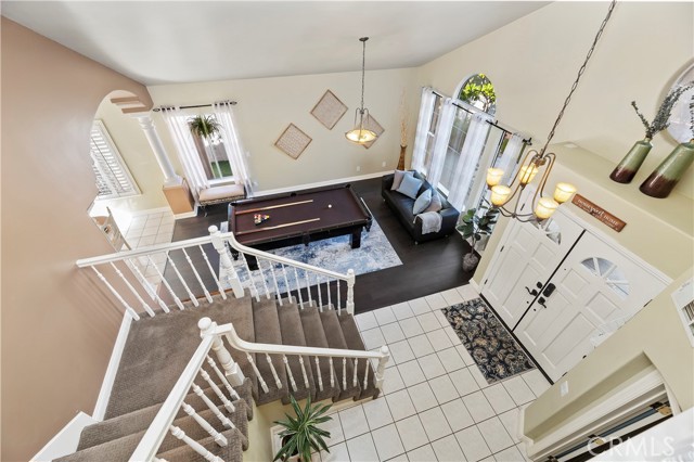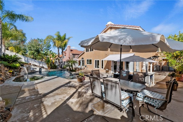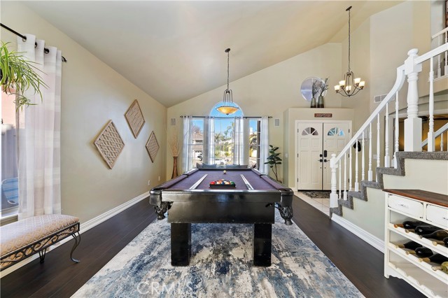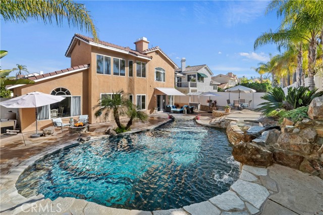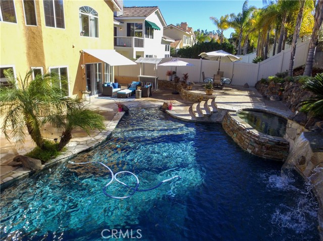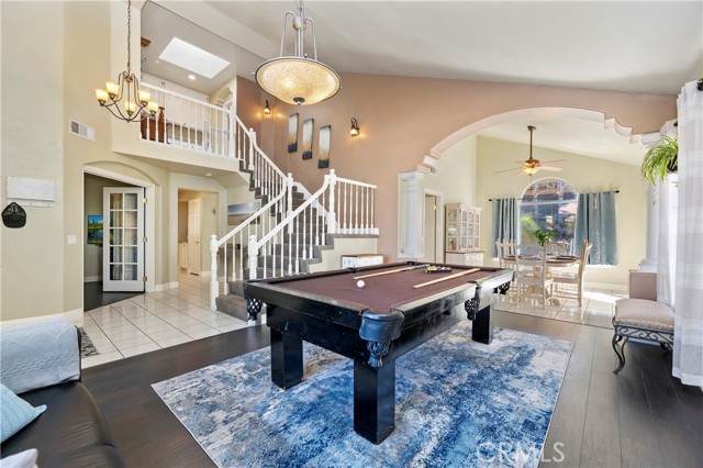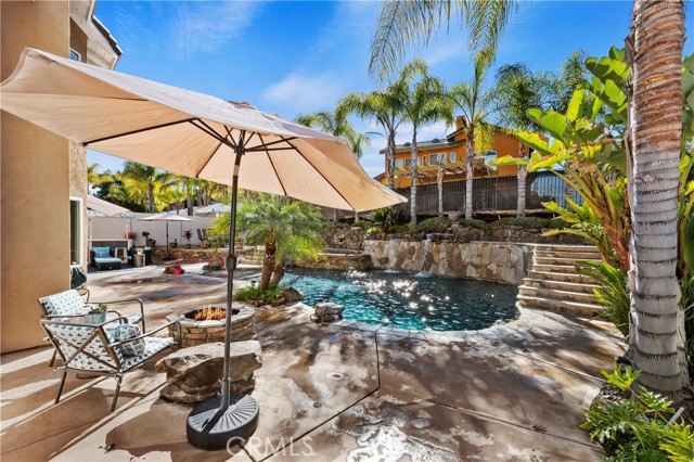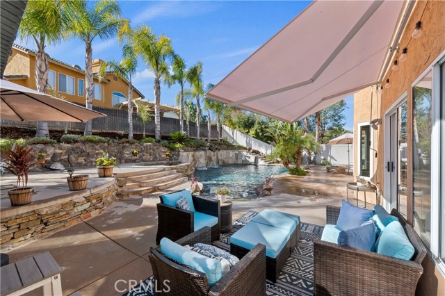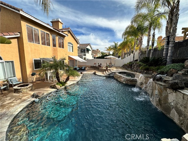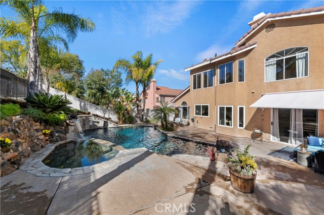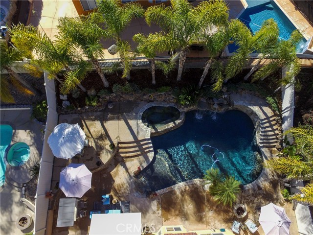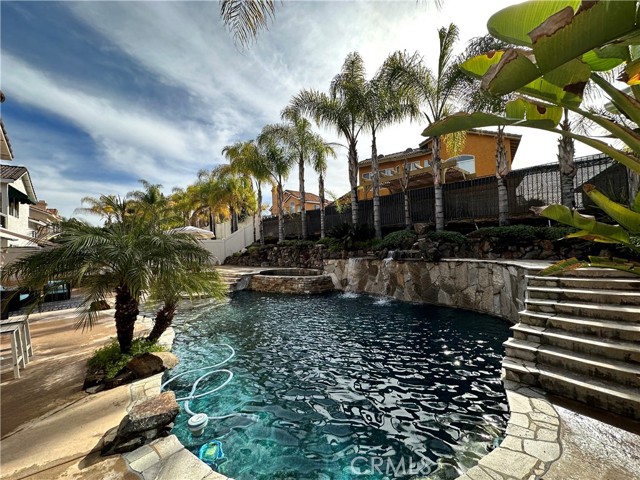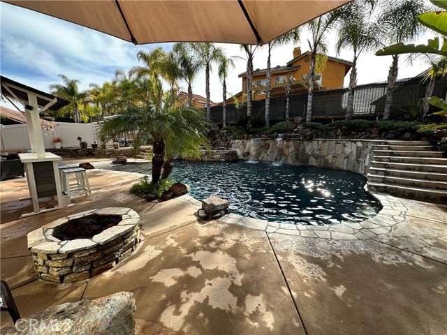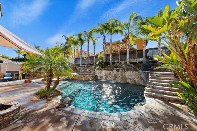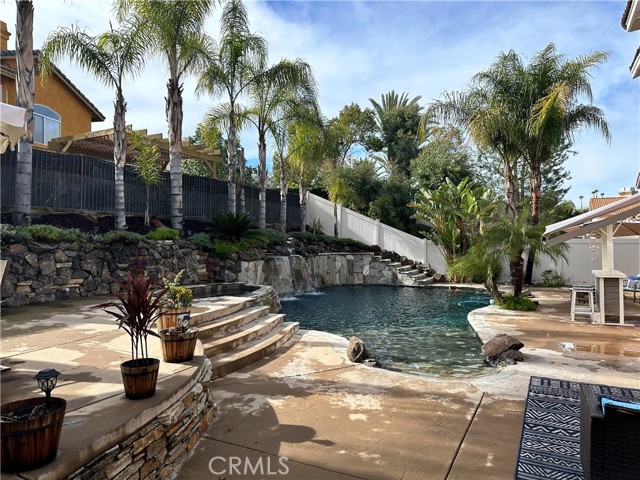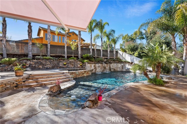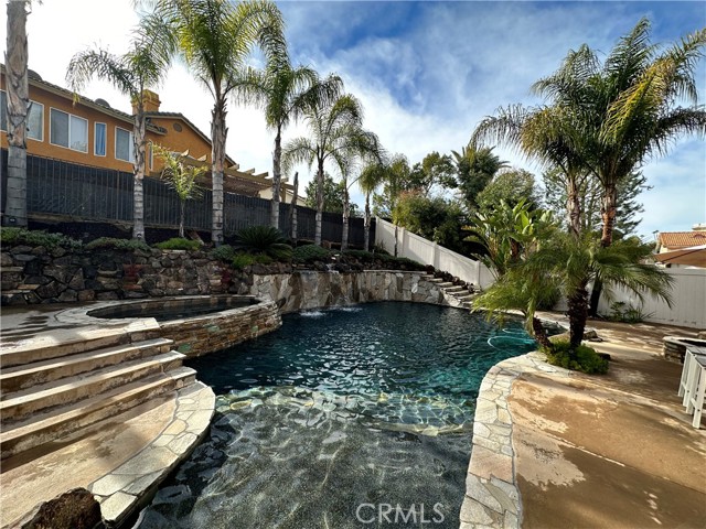 Welcome to your Backyard Oasis! This spacious home is centrally located in the heart of Temecula just minutes to the Wineries. This home sits on a Cul-De-Sac ending in a lovely family and dog friendly park and is a close walk to the newly renovated Rancho Elementary. It offers a beautiful updated kitchen with quarts counters and a walk-in pantry with extra storage under the stairs. The downstairs room can be used as a 5th bedroom and the downstairs full bathroom has its own entrance from the backyard for convenience while using the pool. Upstairs boasts 4 large bedrooms. The master bedroom is large with a passthrough fireplace into the spa sized bathroom offering a soaking tub, separate walk in shower, dual sinks and dual walk in closet. Bedrooms 2 and 3 are good size and share a full bath. The fourth bedroom upstairs can be used as a bonus room, an office, a game room, or a movie room. The 3 car garage has some built in storage and a 220V outlet to be used for charging an electric vehicle. The backyard is an entertainer's dream with multiple sitting areas, a gas fire pit and a salt water pool. The pool is over the top, with a beach entry, 10 person jacuzzi, 2 love seats, and a children's rock climbing wall with waterfalls. Yard is beautifully landscaped with solar lights around the steps and pool, multiple palm trees, 2 lemon trees, and 1 blood orange tree, as well as a dog run with turf on the side yard. In the backyard there are available gas, electric, water, and drainage lines installed for a possible built-in BBQ/Kitchen. All this comes with low taxes and No HOA!