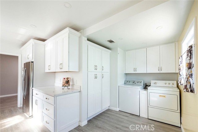 Gorgeously remodeled home with huge family room and amazing detached garage set up. Bright, light & airy with dual pane windows throughout and solar tubes to bring in even extra light! The home was refurbished and beautifully remodeled two years ago, the roof replaced, and there is central heat and air conditioning. The sunroom adjacent to the family room can be used as a playroom or home office. The home has wood-like floors throughout and has been freshly painted. At the rear are three spacious and deep garages. The first has high ceilings and finished workshop and the middle garage has a loft. Each garage has its own roll up door opener. Located on a quiet cul-de-sac street - Conveninet for commuters and in excellent Torrance school district.