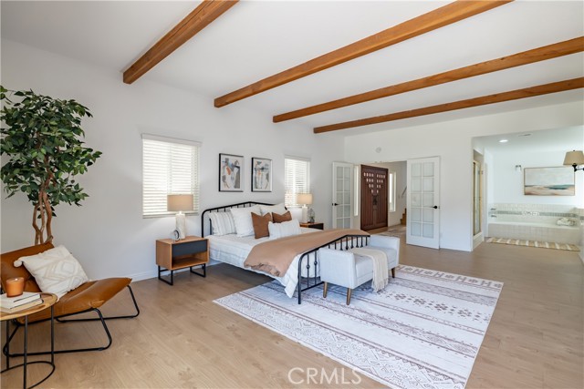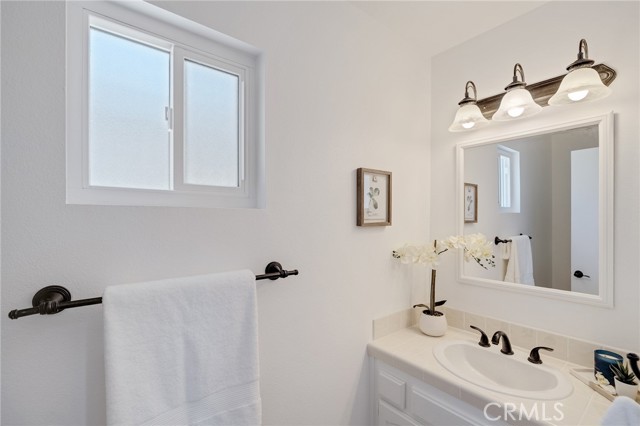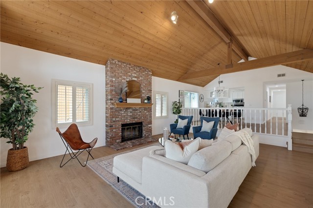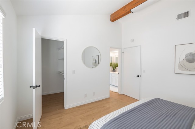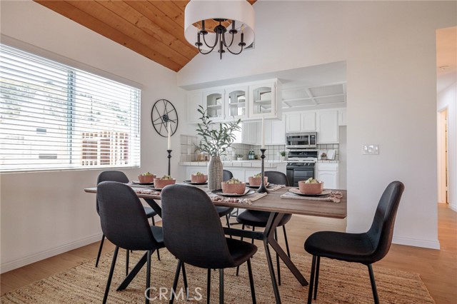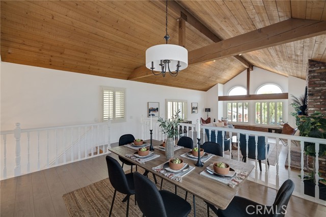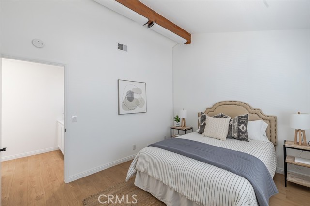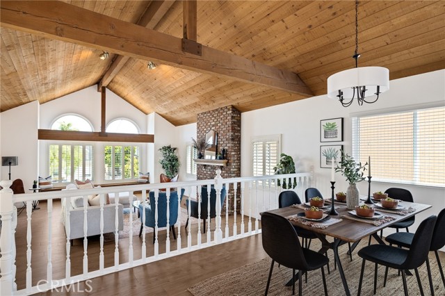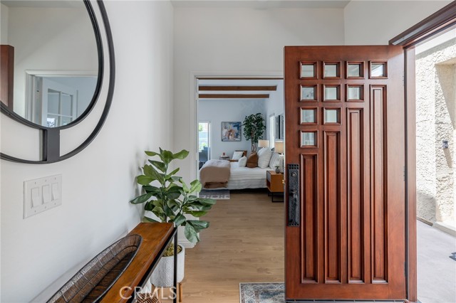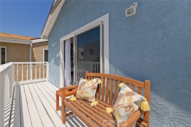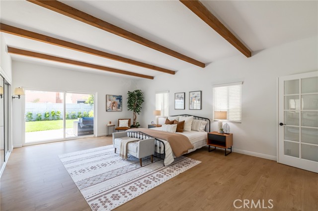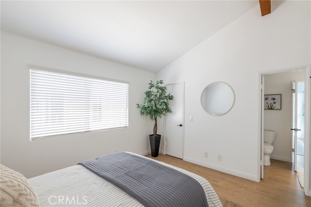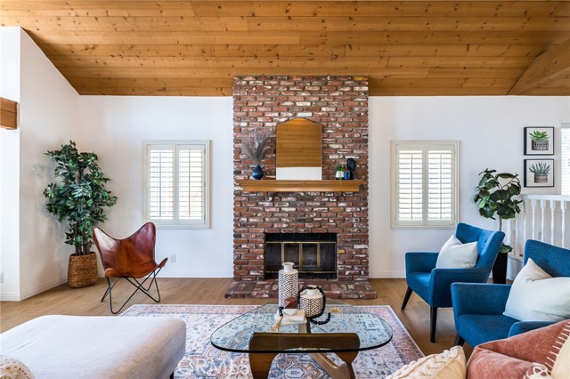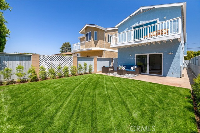 Walteria Tall & Skinny Single-Family Home. This spacious 2-level 4 Bedroom 2.5 Bath home has a reverse floorplan, with living areas upstairs. A formal double-door entry leads to the primary bedroom, laundry room, 4th Bedroom, storage closets, and direct access 2-car garage on the first floor. French doors welcome you to the generous Primary Bedroom En-Suite with beamed ceilings, dual mirrored closets, & sliding patio door to enjoy the backyard. Your primary bathroom offers a walk-in shower, dual vanities, a soaking tub, and a separate lavatory closet. Upstairs you will find stunning wood vaulted ceilings, a generous-sized step-down living room with custom plantation shutters, gas brick fireplace with an oak mantle, and a formal dining room off the freshly painted kitchen with tiled counters, Bosch dishwasher, & pantry. A powder room, linen cupboards, and 2 bedrooms with a full-size jack-and-jill bathroom are off the hallway. The 1st bedroom has a walk-in closet, the 2nd bedroom features mirrored closets & a patio sliding door that opens to a west-facing balcony overlooking the yard. Upgrades include- interior paint, laminate wood floors, LED lighting, faux wood blinds, roof replaced in 2015, James Price Vinyl windows 2018, 50-gallon water heater, water softener, built-in pet door, rain gutters, finished 2-car garage with automatic door, and professionally landscaped backyard with new grass, sprinklers, and privacy trees.