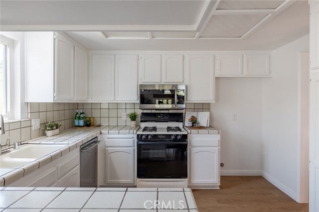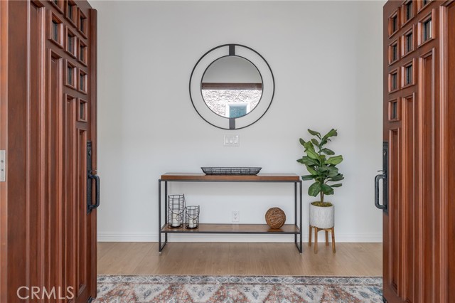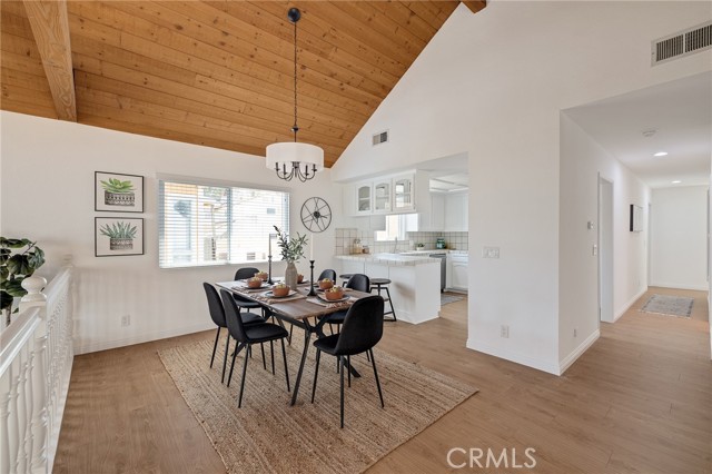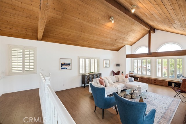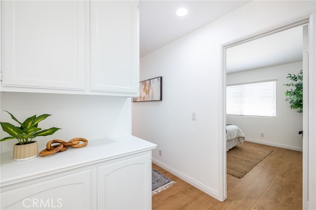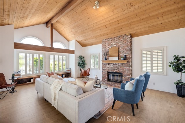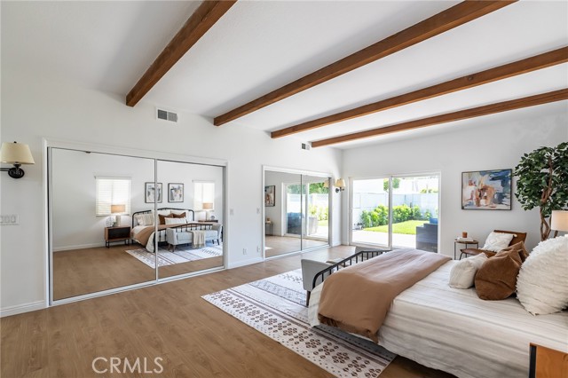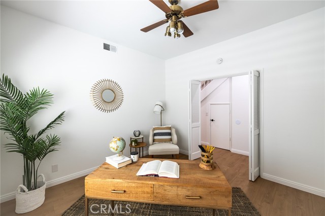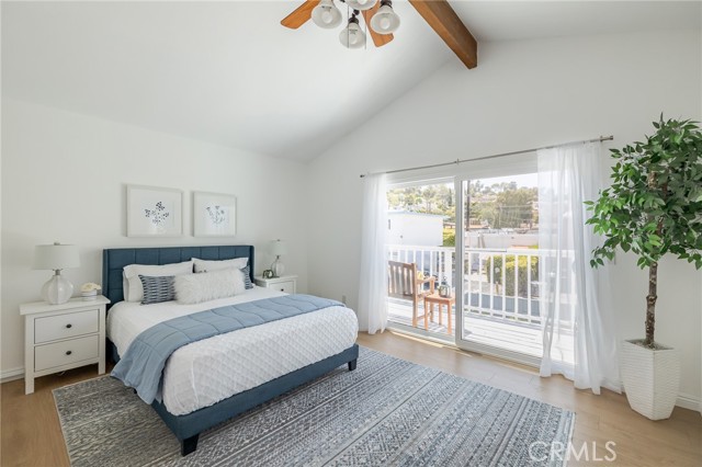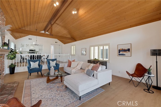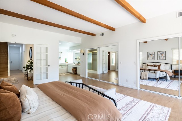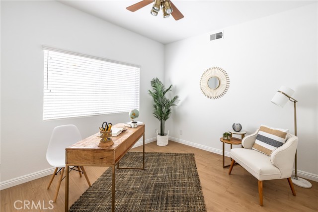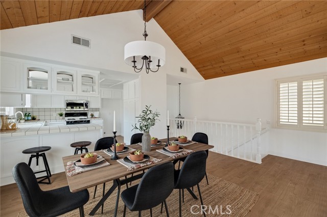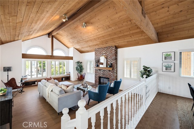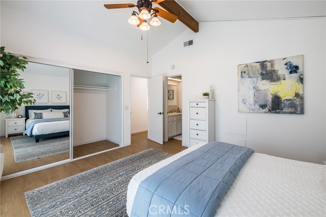 Walteria Tall & Skinny Single-Family Home. This spacious 2-level 4 Bedroom 2.5 Bath home has a reverse floorplan, with living areas upstairs. A formal double-door entry leads to the primary bedroom, laundry room, 4th Bedroom, storage closets, and direct access 2-car garage on the first floor. French doors welcome you to the generous Primary Bedroom En-Suite with beamed ceilings, dual mirrored closets, & sliding patio door to enjoy the backyard. Your primary bathroom offers a walk-in shower, dual vanities, a soaking tub, and a separate lavatory closet. Upstairs you will find stunning wood vaulted ceilings, a generous-sized step-down living room with custom plantation shutters, gas brick fireplace with an oak mantle, and a formal dining room off the freshly painted kitchen with tiled counters, Bosch dishwasher, & pantry. A powder room, linen cupboards, and 2 bedrooms with a full-size jack-and-jill bathroom are off the hallway. The 1st bedroom has a walk-in closet, the 2nd bedroom features mirrored closets & a patio sliding door that opens to a west-facing balcony overlooking the yard. Upgrades include- interior paint, laminate wood floors, LED lighting, faux wood blinds, roof replaced in 2015, James Price Vinyl windows 2018, 50-gallon water heater, water softener, built-in pet door, rain gutters, finished 2-car garage with automatic door, and professionally landscaped backyard with new grass, sprinklers, and privacy trees.