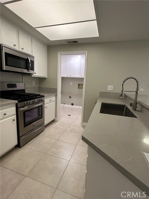 Beautiful spacious 1 bedroom/1.5 bathrooms condo in the prestigious gated community of Windemere. Large living room area w/open kitchen featuring a breakfast bar & stainless appliances; Convenient laundry area inside the unit; Fireplace; Central-Air; A large patio with access from living room & master bedroom; huge windows for lots of natural light, surrounded by lush greenery. Newer floors, appliances, toilets, faucets, blinds and lightings. The lease includes water, trash & basic cable. This unit is located in the best location facing to the court yard. Two subterranean parking spaces; Windemere is a gated community w/24-hour security guards and features a beautiful clubhouse, a large pool area, lap pool, racquetball courts, saunas, locker rooms, gym, game room & barbeque area. Must see.