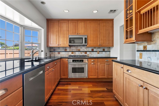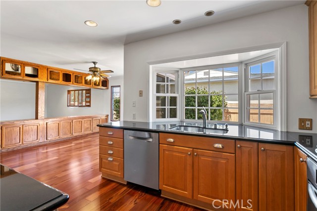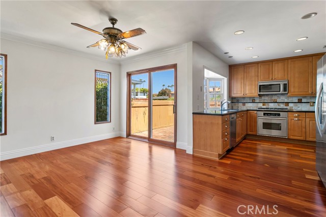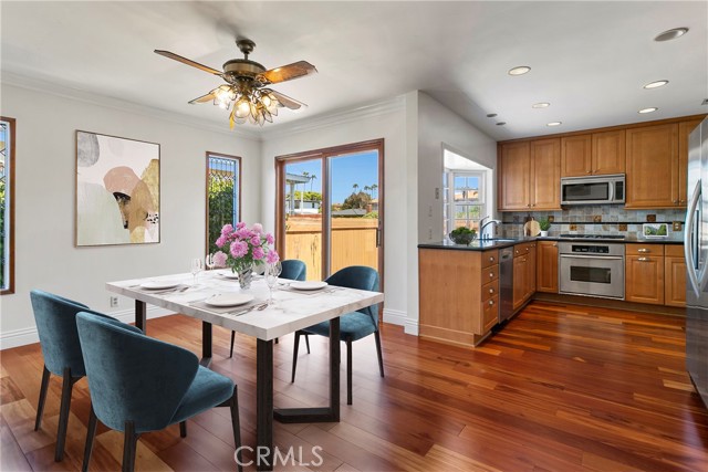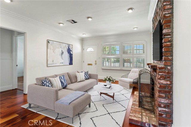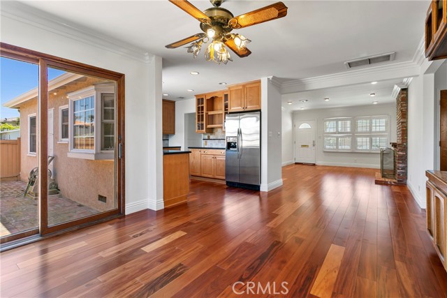 Fantastic opportunity to own this spacious single story 4 br 2 ba home in the highly sought-after South Torrance neighborhood. Fresh interior two tone painting, upgraded wood floors in living areas, new carpet in family room and 2 bedrooms. Formal living room with fireplace, plantation shutters and crown molding, dining room with sliding glass doors to backyard, gorgeous updated chef's kitchen with newer cabinets (in cabinet lighting and glass insert cabinet doors), stainless steel appliances (KitchenAid cooktop, oven, refrigerator, Bosch dishwasher) garden window, granite countertop and custom tile backsplash, recessed lighting, separate family/ great room with track lighting, built in cabinets between the dining room and family room, huge primary bedroom with mirrored closet doors, master bath, nice size bedrooms (4th bedroom can be used as an office/den and closet can be finished according to need) with mirrored closet doors, hallway bath updated with custom tile works, forced air heating and central air conditioning, dual pane windows throughout, ceiling fans, brick patio area for bbq's and entertaining, corner lot location with possibilities of enclosing the large side yard for additional outdoor living space, and 2 car attached garage with direct access and 2 additional parking spaces in the driveway. Don't miss out!