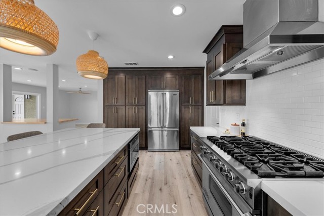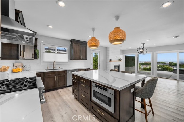 UNOBSTRUCTED, PANORAMIC VIEW OF THE LA BASIN! Ocean! Beach! Queen's Necklace! Hollywood sign! What an eye-popping opportunity to live that ideal indoor-outdoor SoCal life with this recently renovated gem on an epic 10,000-plus SF lot! All improvements new since 2018, with a complete kitchen remodel and structural modifications creating this perfect open-concept layout for the living room, dining room and kitchen. The primary bedroom is its own haven with en suite bathroom and walk-in closet featuring built-in storage. Gorgeous kitchen has quartz countertops, under-cabinet lighting and Viking appliances. Valuable July 2024 improvements to the backyard hill and front landscaping, plus exterior paint, make this an even more magical place to entertain. Too many upgrades to list in the amazing rear of the house, but you'll especially love the Alumawood covered patio with lighting, fans and outdoor heaters. Backyard office with electrical and CAT5 wiring, too! Amazing location with award-winning schools nearby and close proximity to the beach and Riviera Village. Just a two-minute walk to Los Arboles Rocketship Park! Custom brick driveway, two-car attached garage, stained-glass front door and much more wonderful to be discovered here where the views are stunning and the neighborhood is quiet and community-oriented!