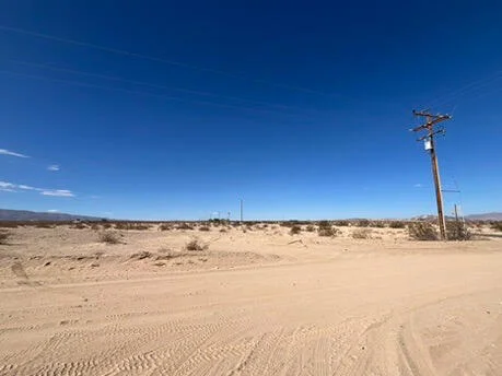 DANBY ROAD, 29 PALMS $14,000.00 - This 2.1 acre parcel is available in the desirable Wonder Valley area of Twentynine Palms. Dimensions 331 X 290 = 95832 sq. ft. The property is ideally located near amenities such as the Wonder Valley Community Center Park with restroom and off roading areas. This level land is ready for construction. Electricity runs along the street. No water. This is the 2nd lot south of Amboy Rd so very near a paved road. Also available are two 2.2 acre parcels adjacent to the south 3rd & 4th lots south of Amboy Rd. Owner Will Carry Loan with 20% down $2,800.00 a 1st Trust Deed of $11,200.00 @ 7% interest amortized over 5 years payable $221.77 monthly + $15.00 monthly loan service fee. DIRECTIONS: From Downtown 29 Palms go east on Amboy Road about 8 miles to where Community Center Park is go just past it to right on Danby Road. APN0625-372-02-0000.