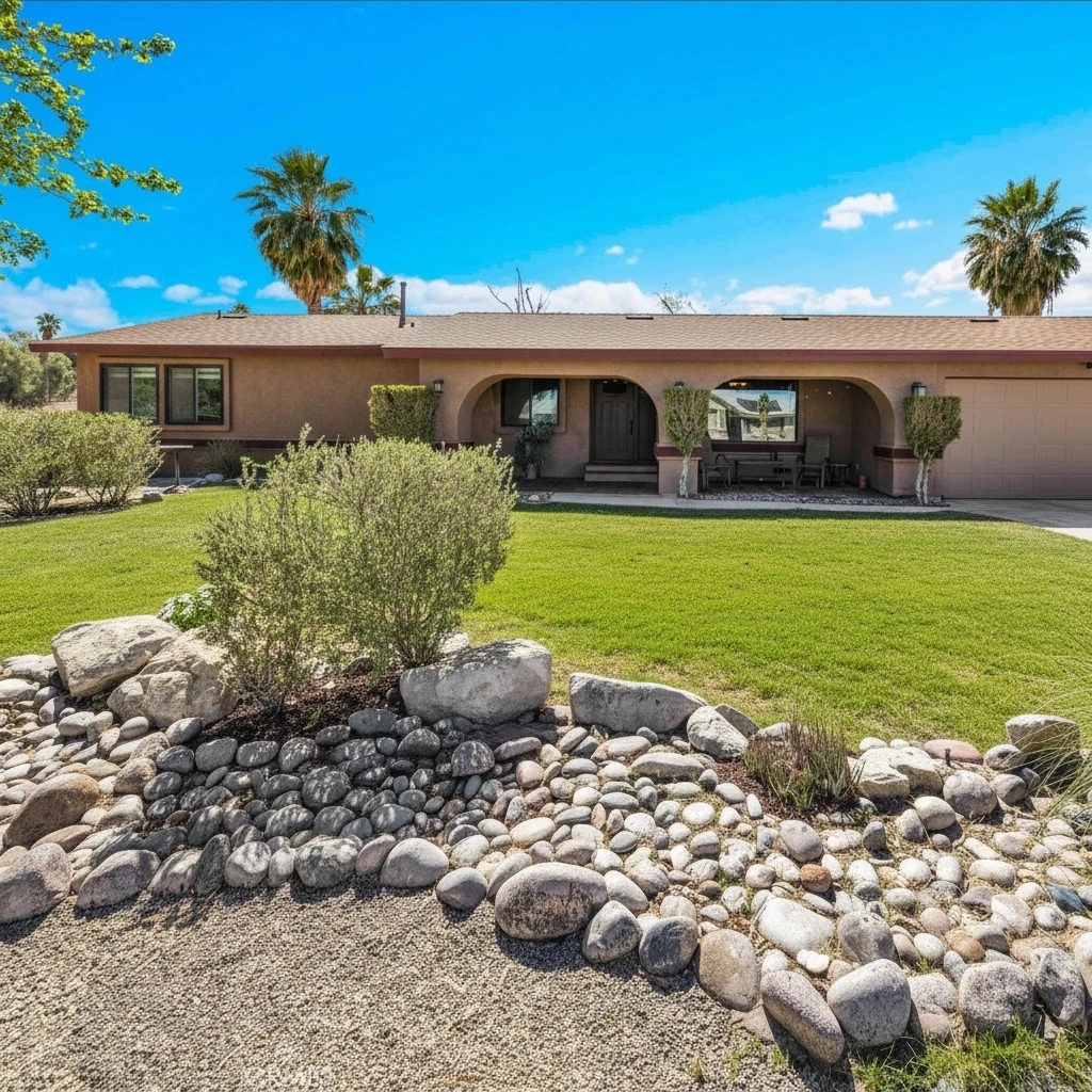 Don’t miss this rare opportunity to own a stunning 4-bedroom, 2-bath golf course home in one of 29 Palms’ most sought-after neighborhoods! One of only 19 homes on the course, this property sits right on the 7th fairway, offering beautiful views and a peaceful setting. Recently remodeled, this home shines with modern upgrades including new flooring and a stylish kitchen with quartz countertops, tile backsplash, stainless steel appliances, and a breakfast bar. The open dining area leads directly to the backyard, perfect for indoor-outdoor living. The spacious primary suite features backyard access and a beautifully updated en-suite bath with dual sinks, soaking tub, and separate shower. A bright step-down den with skylights and its own split system adds flexible living space. Recent upgrades include a newer roof (under 3 years old), fresh exterior paint, new well pump, and upgraded irrigation system. The landscaped yard is enhanced by mature pomegranate and olive trees, plus a private well for efficient watering.Relax or entertain in the backyard oasis complete with a composite deck, outdoor sink, BBQ area, and hot tub with sun deck. Additional highlights include RV & boat parking, a storage shed, laundry room, and even a treehouse! All just minutes from the Marine Corps base, Joshua Tree National Park, downtown, shopping, and dining.
