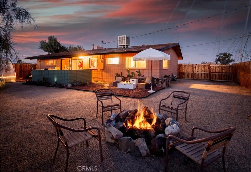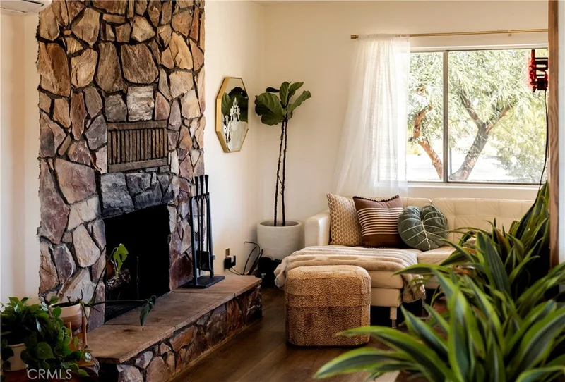 VINTAGE MID-CENTURY OASIS: Built in 1964, this brick-and-stone original sits on an approx. 16,000 sq ft lot and is centrally located near restaurants, shops, and markets, with the Eastern Joshua Tree National Park entrance about a 10-minute drive away. Natural light pours in all day, framing sunrise-to-sunset skies and beautiful mountain views, while the home’s mid-century character stays front and center symmetrical brickwork, classic rock accents, and a dramatic floor-to-ceiling stone, wood-burning fireplace anchoring the living space. The dining area delivers a true architectural moment with a rare indoor stone planter that stretches nearly the full length of the room, and the full bath features restored original tile that keeps the vintage vibe intact. The kitchen offers generous counter space and a large window above the dual sink with view lines toward the park, plus a driveway leading to a single-car garage with workshop. Outside, the property is framed by mature, lush green trees and sculptural desert cacti, creating a private, resort-like setting. A shaded, covered flagstone back porch/patio with a jacuzzi invites year-round unwinding, while a built-in cowboy pool on a wood deck is made for sunset dips. The exterior greenhouse with automatic irrigation adds a rare, practical touch for gardening and growing year-round. Finish the evening around the oversized stone fire pit in the gated backyard under the star-filled night sky that makes Joshua Tree famous.
