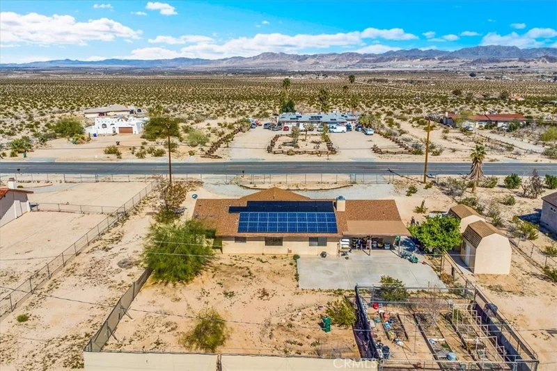 Looking for a spacious desert home or investment property with STUNNING mountain views?! Look no further! This centrally located home in the Chocolate Drop area of 29 Palms is nicely situated on .64 acres of land (FULLY FENCED) with a convenient semicircle driveway & beautiful mountain views to the North and South. Featuring 2,218 sqft of living space, this home offers a total of 4 bedrooms, 3 bathrooms, a family room AND a main living room with central heating & air throughout. The kitchen adorns warm wood cabinetry, matching white appliances, an oversized walk-in pantry and a large pop-out window above the kitchen sink to take in the beautiful desert views. Just off the kitchen is the light-filled living room which features a vaulted ceiling, a cozy wood-burning fireplace and charming built-in corner shelving. The 3 south-side bedrooms include newer ceiling fans and carpet flooring and the primary bedroom includes an ensuite bathroom with a single-sink vanity and shower/tub combo. This home also has a spacious laundry room just off the kitchen which leads to the 4th bedroom and 3rd bathroom (a previous garage conversion) complete with its own mini-split & walk-in closet making it a great guest room or second primary suite. Outside you'll be delighted to find a sizable covered patio, 3 SHEDS (2 of which are stucco'd and have 2 story storage rooms) and a fenced-in garden for those with green-thumbs. There are also Sun Run solar panels on the roof (currently not connected) that a buyer may either have removed or reconnected. With plenty of space to entertain or relax around a firepit on a starry desert night, this property has A LOT to offer! Schedule your showing today!