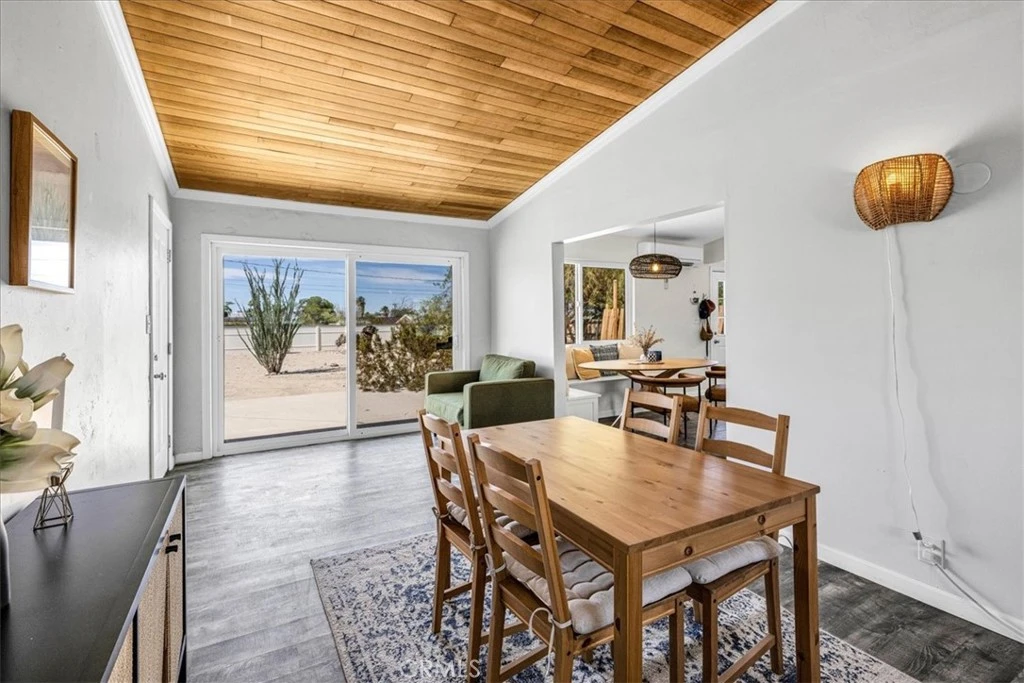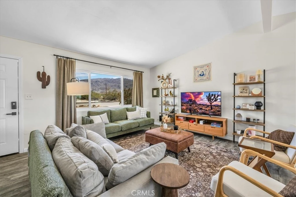 Located in one of the most desirable neighborhoods of 29 Palms, this fully turnkey 3 bedroom, 2-bathroom home offers comfort, charm, and unbeatable proximity to the east entrance of Joshua Tree National Park. Step inside to discover a light filled interior with a spacious bonus room perfect for a home office, studio, or guest retreat with a soaring, beautifully crafted wood ceiling that adds warmth and architectural character to the space. Enjoy sweeping desert views and serene sunsets from the private fenced yard, with plenty of space to relax or entertain. This home is move in ready and perfectly positioned for nature lovers, short term rental investors, or full time residents seeking peaceful living with modern convenience. Capitalize on this opportunity to own a piece of the high desert where everything is within minutes whether it's hiking, climbing, and the vibrant local art and music scene of 29 Palms, or yummy bites to eat at the 29 Palms Inn Restaurant, Kitchen in the Desert, Snake Bite 29 Palms, and more!
