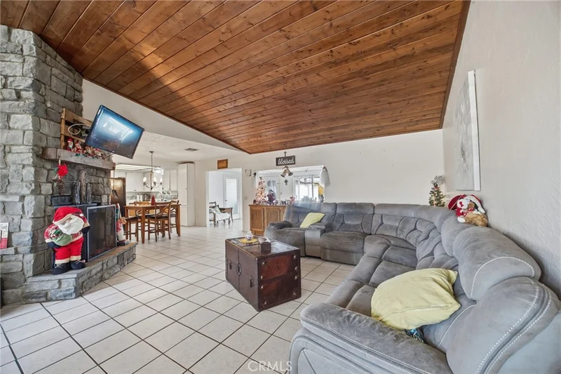 Spacious desert pool home located in Twentynine Palms, just minutes from the entrance to Joshua Tree National Park. This property offers a flexible layout with multiple living areas, generous room sizes, and great indoor-outdoor space—ideal for full-time living, a weekend getaway, or an investment opportunity. The main living area features vaulted wood ceilings and a large stone fireplace, creating a warm and inviting feel. Tile flooring runs through the main spaces, offering durability and easy maintenance. The dining area flows directly into the kitchen, making it comfortable for everyday living and entertaining. The kitchen provides plenty of cabinet space and room to work, with easy access to the dining and living areas. Bedrooms are well-sized, and several bonus rooms offer flexibility for a home office, guest space, or creative use. The primary bedroom includes ample storage and a private bathroom with a separate vanity area. The backyard is a standout feature, with a large in-ground pool, multiple covered patio areas, and space to relax or entertain. The yard is fully fenced and includes mature palm trees and low-maintenance desert landscaping. A detached structure provides additional storage or workspace (buyer to verify use). Conveniently located near local shopping, dining, the marine base, and outdoor recreation, this home offers space, versatility, and classic desert living.