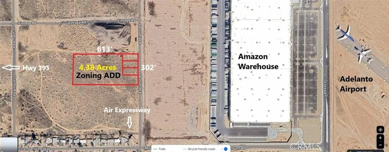 Amazing COMMERCIAL/INDUSTRIAL/CANNABIS LAND OPPORTUNITY next to Amazon Warehouses in Adelanto. Total 4.38 Acres (190,843 Square Feet) consisting of four Parcels on Paved Street with utilities closeby. This ADD ZONED site offers numerous COMMERCIAL, INDUSTRIAL, and INSTITUTIONAL possibilities. Close to Adelanto Rd and Air expressway intersection. 5 to 10 min drive to Hwy 395 and 15 Fwy. Largest parcel is 3.72 Acres and three more APNs are 9600 sqft each that can be developed separately as retail/repair shops. Zoning allows permitted and conditional uses including Cannabis facility, Automobile sales/service, Gas Station with parking lots, Warehouse, Truck terminals, Retail, Office… designated as CALIFORNIA OPPORTUNITY ZONE with tax benefits.