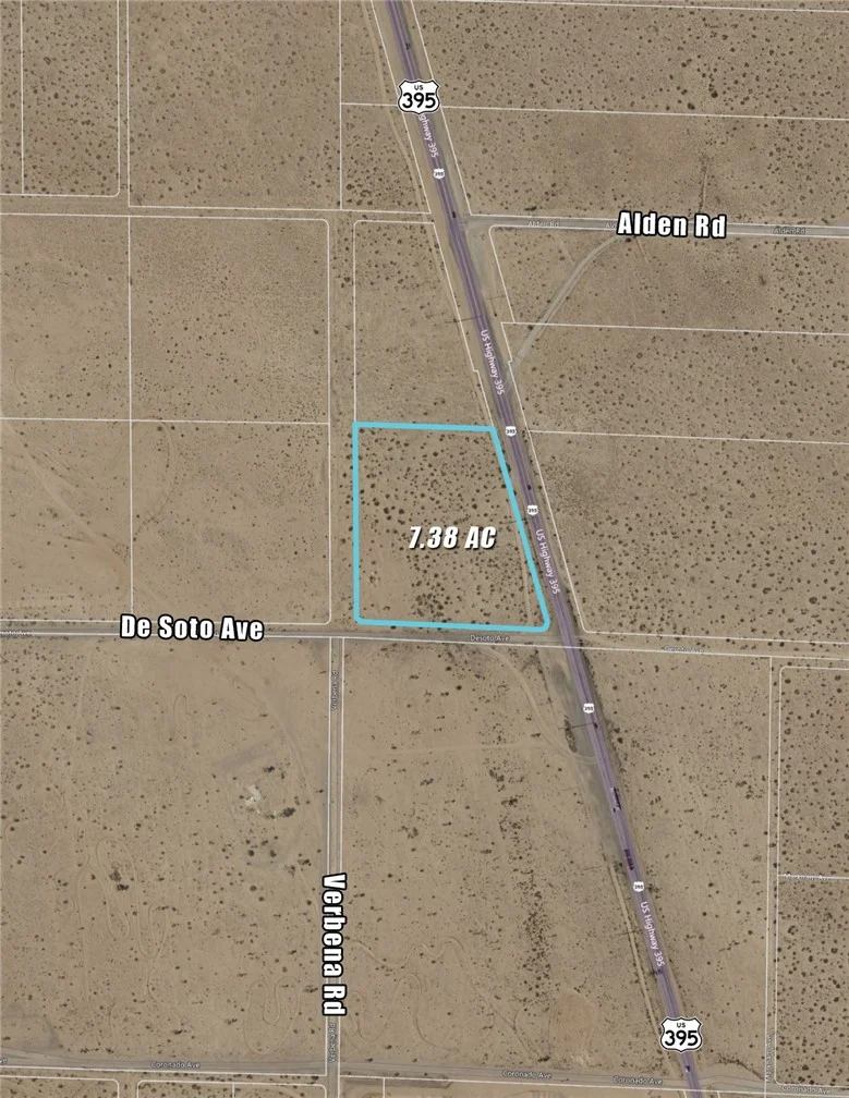 7.38 ac ADD (Airport Development District) land at the Northwest Corner of Hwy 395 and De Soto Ave. ADD zoning permits Cannabis Cultivation and the property is also located in the recently expanded Dispensary Zone. Power lines run along Hwy 395. City of Adelanto water line stops across De Soto Ave at the Northeast corner of Verbena Rd and De Soto Ave. Great visible location with cross street on Hwy 395 and a wide range of possible uses including Industrial and Cannabis.