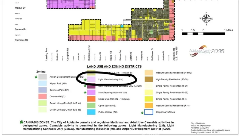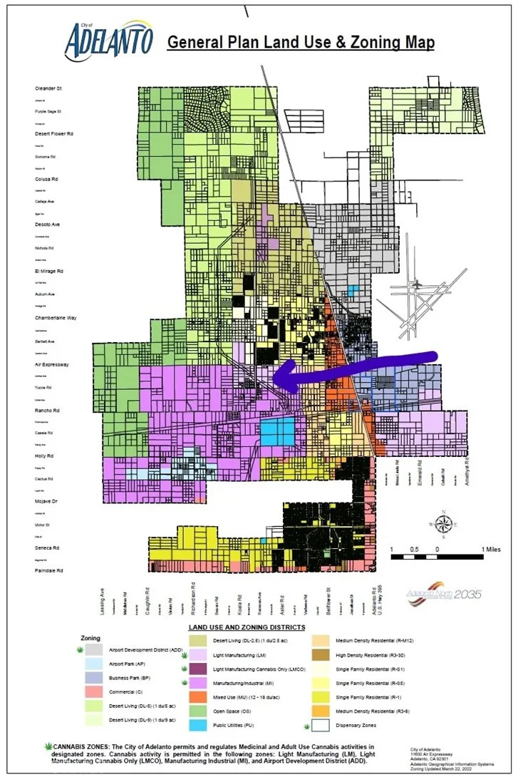 PRIME 8+ acres (2 lots) lot zoned Light Manufacturing (LM) for Cannabis CULTIVATION and PROCESSING. Significant building and warehousing activity in the area. Cannabis lots a couple hundred yards away expecting to receive CUP (Conditional Use Permits) and building permits shortly. Located at NW Corner of Aster and Daisy - 2 hundred yards East of Aster. Ready for Entitlement NOW, or Buy and Hold for potential upside. In the Path of Future Development. There are two 4.2 acre lots (APN 0459113320000 and 0459113330000). Prefer selling both lots together. CANNABIS ZONES: The City of Adelanto permits and regulates Medicinal and Adult Use Cannabis activities indesignated zones. Cannabis activity is permitted in the following zones: Light Manufacturing (LM), Light Manufacturing Cannabis Only (LMCO), Manufacturing Industrial (MI), and Airport Development District (ADD). Please contact City of Adelanto Planning for any specific info.