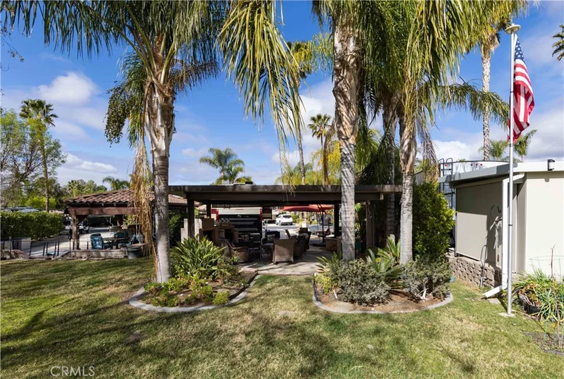 RV lot with pond and fountain views located in the guard-gated Rancho California RV Resort in Aguanga near Temecula Wine Country. Property features an Alumawood patio cover, BBQ island with seating area, large stained concrete area suitable for golf cart or vehicle parking, and enclosed build-out with family room, fireplace, TV nook, and additional seating area. Rancho California RV Resort amenities include 14-hole Executive Par 3 golf course (owner use included), 5 pools and spa areas, tennis courts, pickleball courts, dog park, clubhouses, hiking trails, horseshoe lawn and onsite market. Monthly HOA includes water, sewer, trash service at lot, common area maintenance, and use of resort amenities including the golf course. Guard-gated community with no age restrictions. Located minutes from Temecula Wine Country, with access to Palm Springs, San Diego, and Southern California beaches. Financing available. Buyer to verify lot features, utilities, resort rules and all information for accuracy.