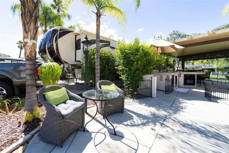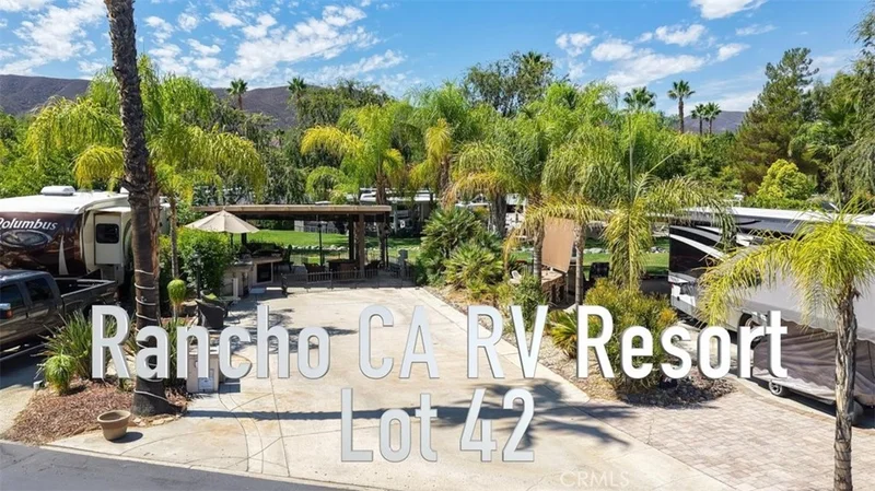 Welcome to Rancho California RV & Golf Resort *Site 42* This beautifully developed site is your own private oasis with a stream and water pond feature directly beyond the site in a park like setting with surrounding mountain views! Spacious alumawood patio cover with screens provides the perfect space for the RV Resort Lifestyle with dining, BBQ/kitchen featuring refrigerator, oven/cooktop, sink and sitting area with TV while soaking in the views. The site is fenced for pets and includes spacious parking for not only your RV but for golf cart and vehicles. Privacy shrubs on both sides of the site offer additional privacy. This truly park like setting is magical, peaceful and relaxing! Rancho California RV Resort provides amenities such as a 14 hole Executive PAR 3 Golf Course (no fees for owners), 5 Pools/Jacuzzis, Tennis courts, Pickleball courts, Dog park, Club house, hiking trails, Horseshoe lawn, onsite grocery market and restaurant. The resort is guard gated with no age restrictions. Monthly HOA fee includes "unlimited" use of the golf course, amenities, trash pickup at lot, water/sewer and common area maintenance. Financing is available!