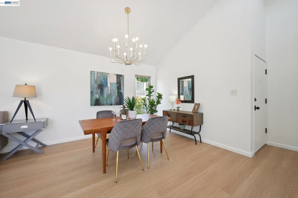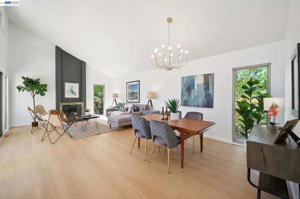 Built in 1969, this light-filled single-level townhouse offers 2 bedrooms, 2 bathrooms, and 1,274 square feet of comfortable living space. Vaulted ceilings create a bright, airy feel throughout, complemented by LVP flooring, fresh interior paint and a spacious living room with a fireplace. The dining area features a modern chandelier, while the galley kitchen includes an electric range oven, microwave hood, dishwasher and a breakfast nook with patio access. A dedicated laundry room with cabinetry adds convenience. The hall bathroom offers a shower over tub with updated fixtures and hardware. The primary suite features vaulted ceilings, a walk-in closet, and an ensuite bathroom. Step outside to a private courtyard—perfect for morning coffee, relaxing with a book, or dining al fresco. Enjoy the HOA clubhouse, pool common areas and plentiful guest parking spaces. Complete with a two-car garage and ideally located near walking and biking trails, top-rated schools, Corica Golf Course, and the Harbor Bay Ferry Terminal.