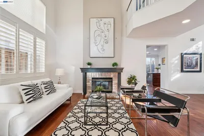 Stunning 4-bedroom Mediterranean home facing the lagoon trail on a cul-de-sac location. Upon entering through the impressive front door, you and your guests will be captivated by the soaring cathedral ceiling with center by a fireplace creating a relaxing atmosphere. The abundant windows allow natural light to flood the home. The main level features one bedroom and full bath. The open layout of the living and dining areas is ideal for family gatherings. The gourmet kitchen features ample cabinetry, stainless appliances, and a cozy breakfast nook that overlooks the backyard. The family room and kitchen are complemented by a generous 9-foot ceiling. The spacious family room with a two-way fireplace looks out to the backyard. You will appreciate the oversized primary bedroom with a walk-in closet and a spacious primary bath. Additionally, the 3-car garage includes area suitable for a workbench. Situated on a quiet cul-de-sac next to a community playground, top schools, close to Oakland Airport, ferry boat to San Francisco bay and lagoon trails.